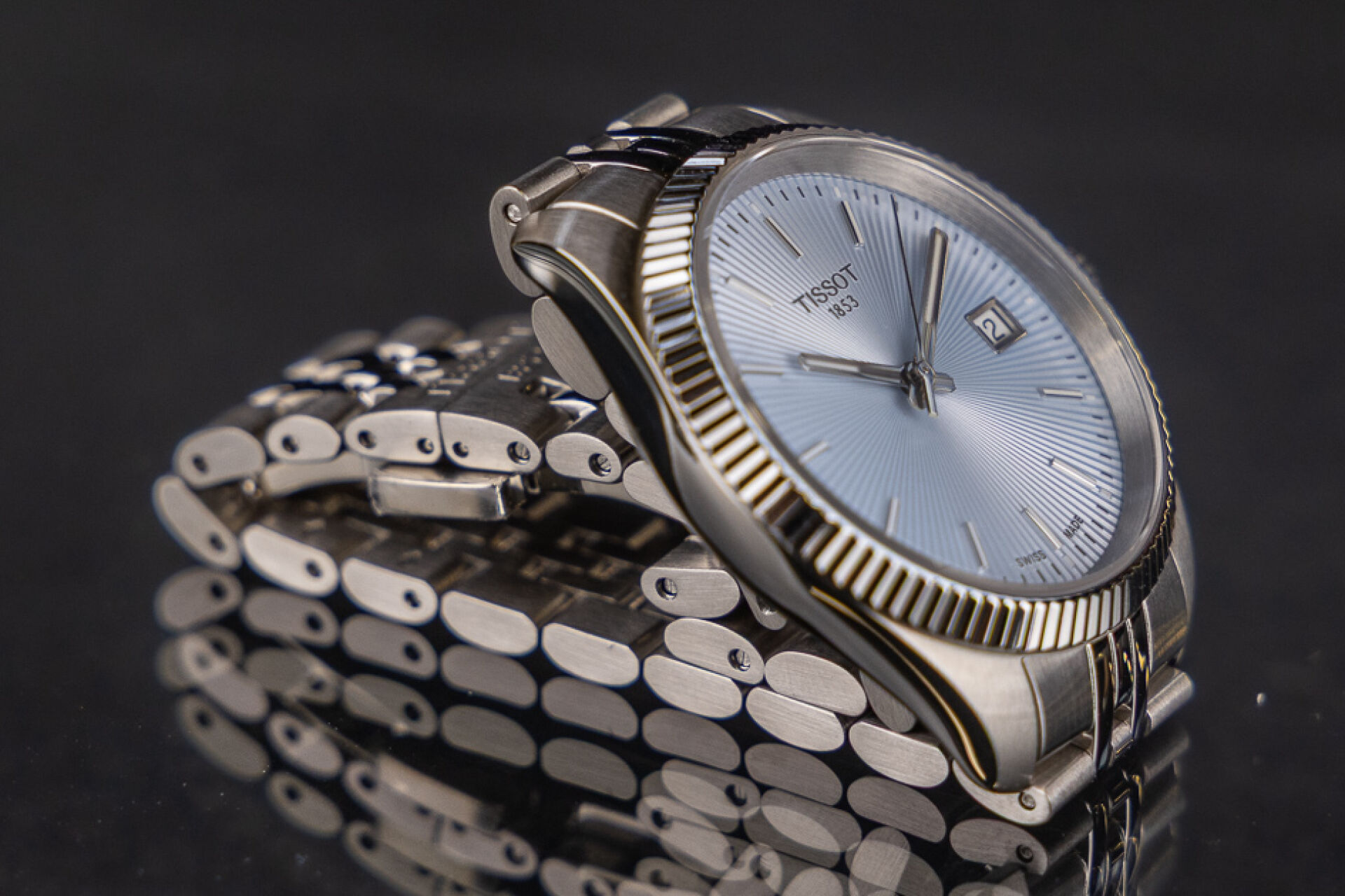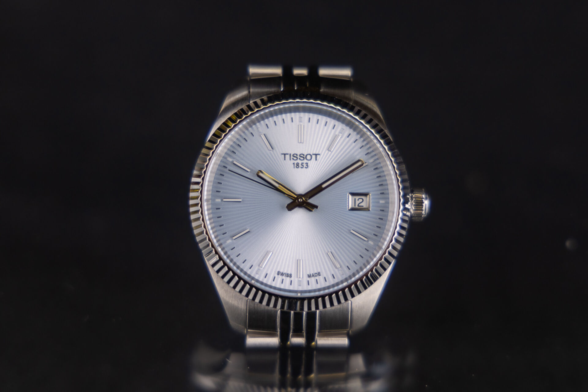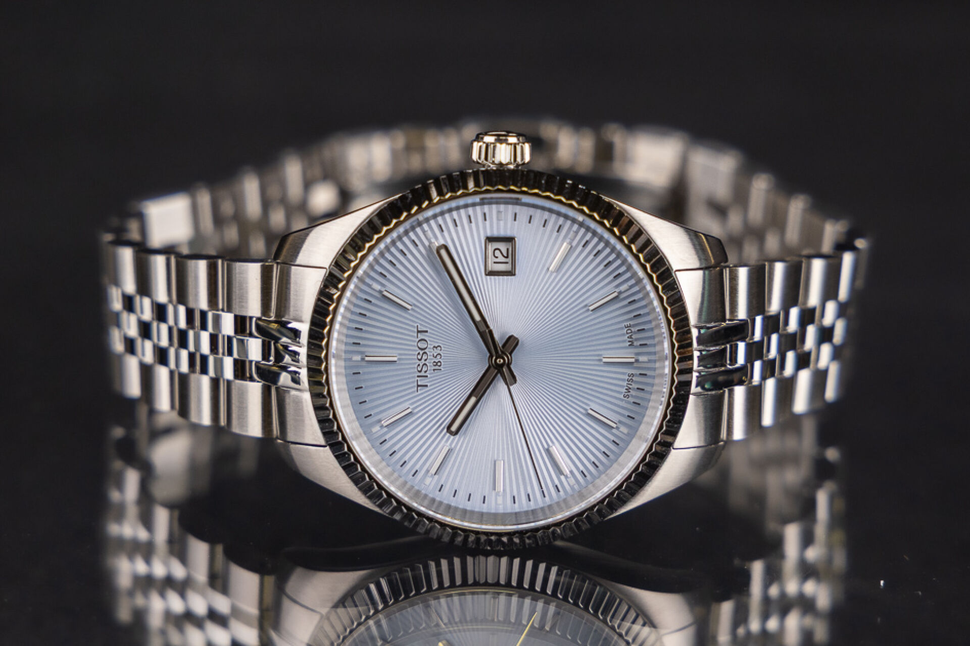 TISSOT - Montre femme, boitier circulaire en acier, cadran à fond bleu ciel guilloché, index bâtons, guichet date à 3h, bracelet acier à boucle déployante, mouvement à quartz. Boite. Diam. : 3,3 cm Montre fonctionnant lors de l'expertise, révision conseillée. Conditions de vente spécifiques : Veuillez noter que toutes les montres sont vendues en l'état. Aucune garantie n'est faite sur l'état de marche, une révision est donc conseillée. Certaines montres ont été ouvertes pour identifier le type et la qualité du mouvement, y compris les montres résistantes à l'eau, il est donc conseillé à l'acheteur de consulter un horloger pour revoir l'étanchéité de la montre.