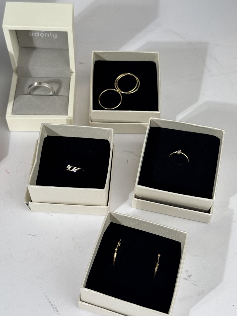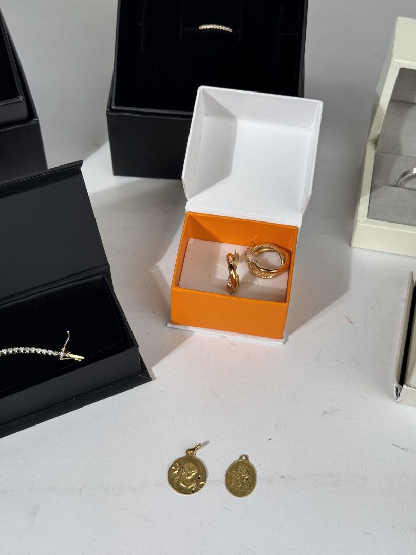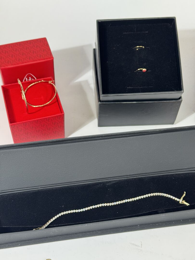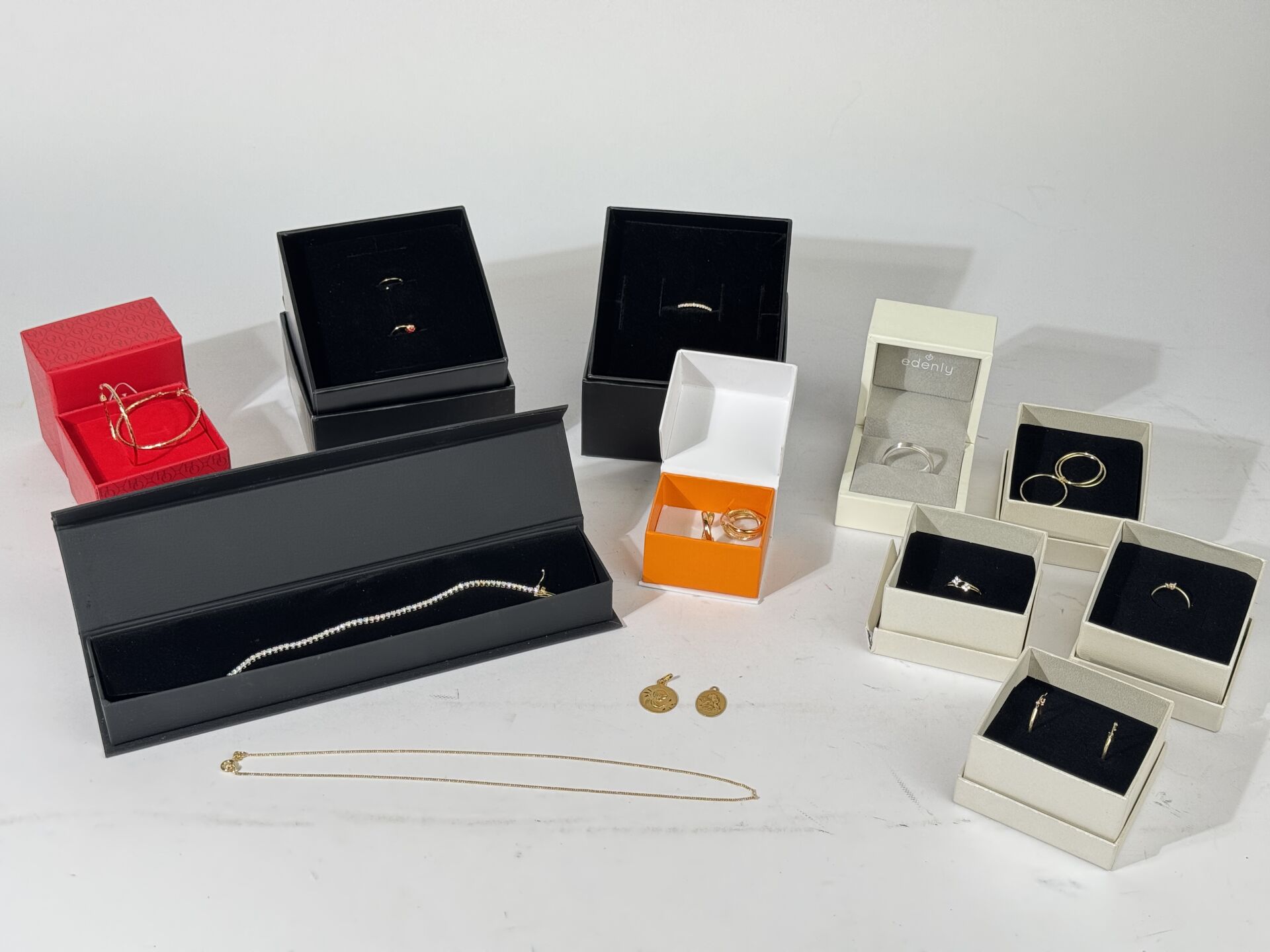Lot comprenant 13 bijoux en or jaune ou gris 9k (750 millièmes) dont chaine, boucles d'oreilles, bague et bracelet. Certains sans écrin. Poids brut : 23,75 gr En l'état