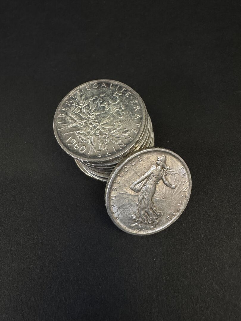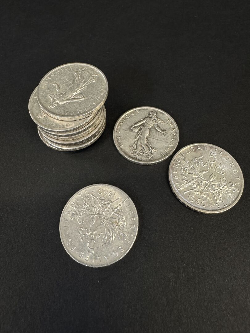Lot de 12 pièces de 5 francs en argent, la Semeuse, 1960. Poids : 143.98 gr PAS DE LIVE POUR CE LOT PIECES CONSERVEES A LA BANQUE - VENDUES SUR DESIGNATION - VISIBLES SUR RENDEZ-VOUS UNIQUEMENT 48 H AVANT LA VENTE - DELIVRANCE SUR RENDEZ-VOUS UNIQUEMENT 72 HEURES A L'AVANCE