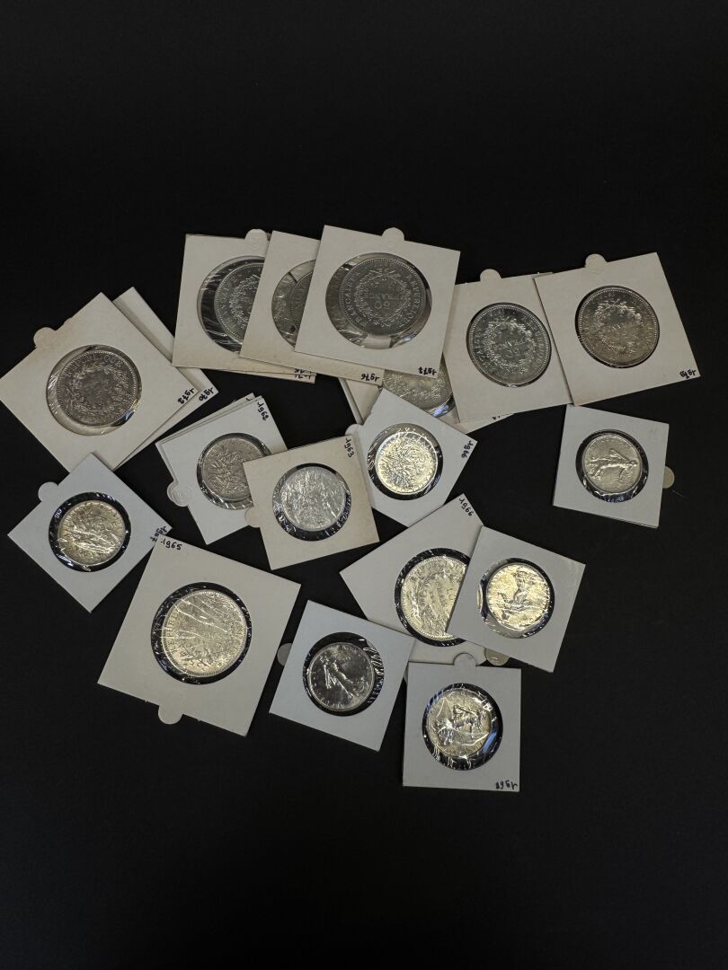 Lot comprenant 6 pièces de 50 francs en argent, 7 pièces de 10 francs en argent et 10 pièces de 5 francs en argent. Poids brut : 529.65 gr PAS DE LIVE POUR CE LOT PIECES CONSERVEES A LA BANQUE - VENDUES SUR DESIGNATION - VISIBLES SUR RENDEZ-VOUS UNIQUEMENT 48 H AVANT LA VENTE - DELIVRANCE SUR RENDEZ-VOUS UNIQUEMENT 72 HEURES A L'AVANCE