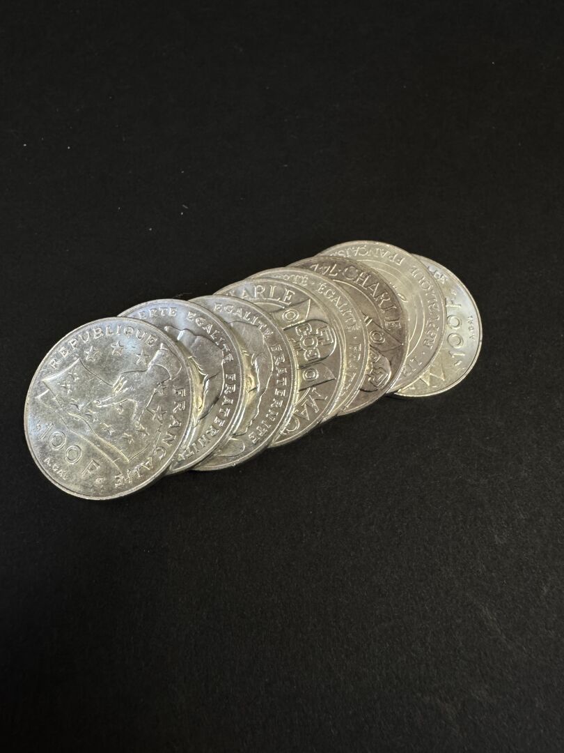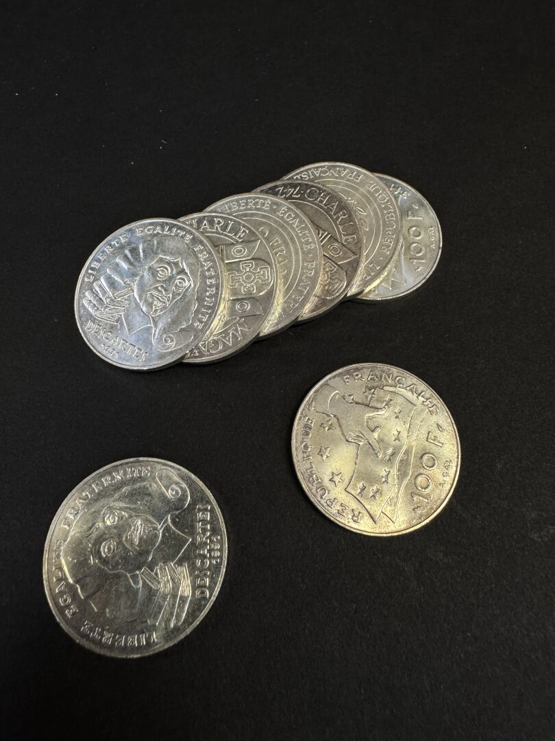 Lot de 8 pièces de 100 francs en argent, Descartes et Charlemagne, 1990 et 1991. Poids : 119.80 gr PAS DE LIVE POUR CE LOT PIECES CONSERVEES A LA BANQUE - VENDUES SUR DESIGNATION - VISIBLES SUR RENDEZ-VOUS UNIQUEMENT 48 H AVANT LA VENTE - DELIVRANCE SUR RENDEZ-VOUS UNIQUEMENT 72 HEURES A L'AVANCE