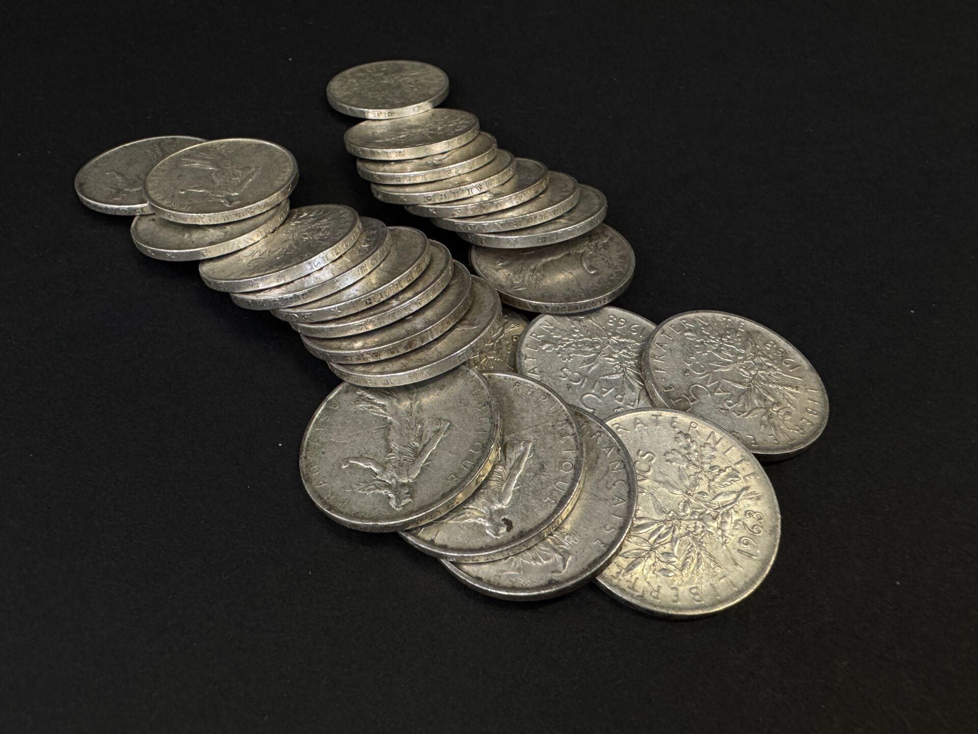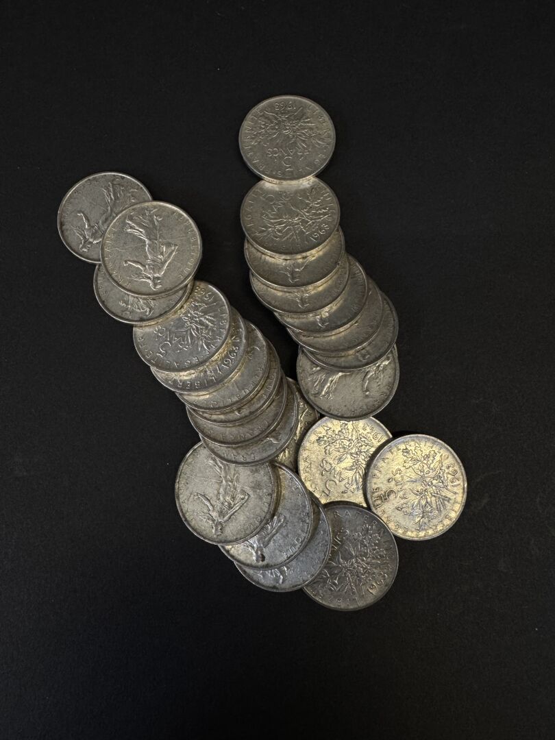 Lot de 25 pièces de 5 francs en argent, la Semeuse, 1963. Poids : 299.85 gr PAS DE LIVE POUR CE LOT PIECES CONSERVEES A LA BANQUE - VENDUES SUR DESIGNATION - VISIBLES SUR RENDEZ-VOUS UNIQUEMENT 48 H AVANT LA VENTE - DELIVRANCE SUR RENDEZ-VOUS UNIQUEMENT 72 HEURES A L'AVANCE