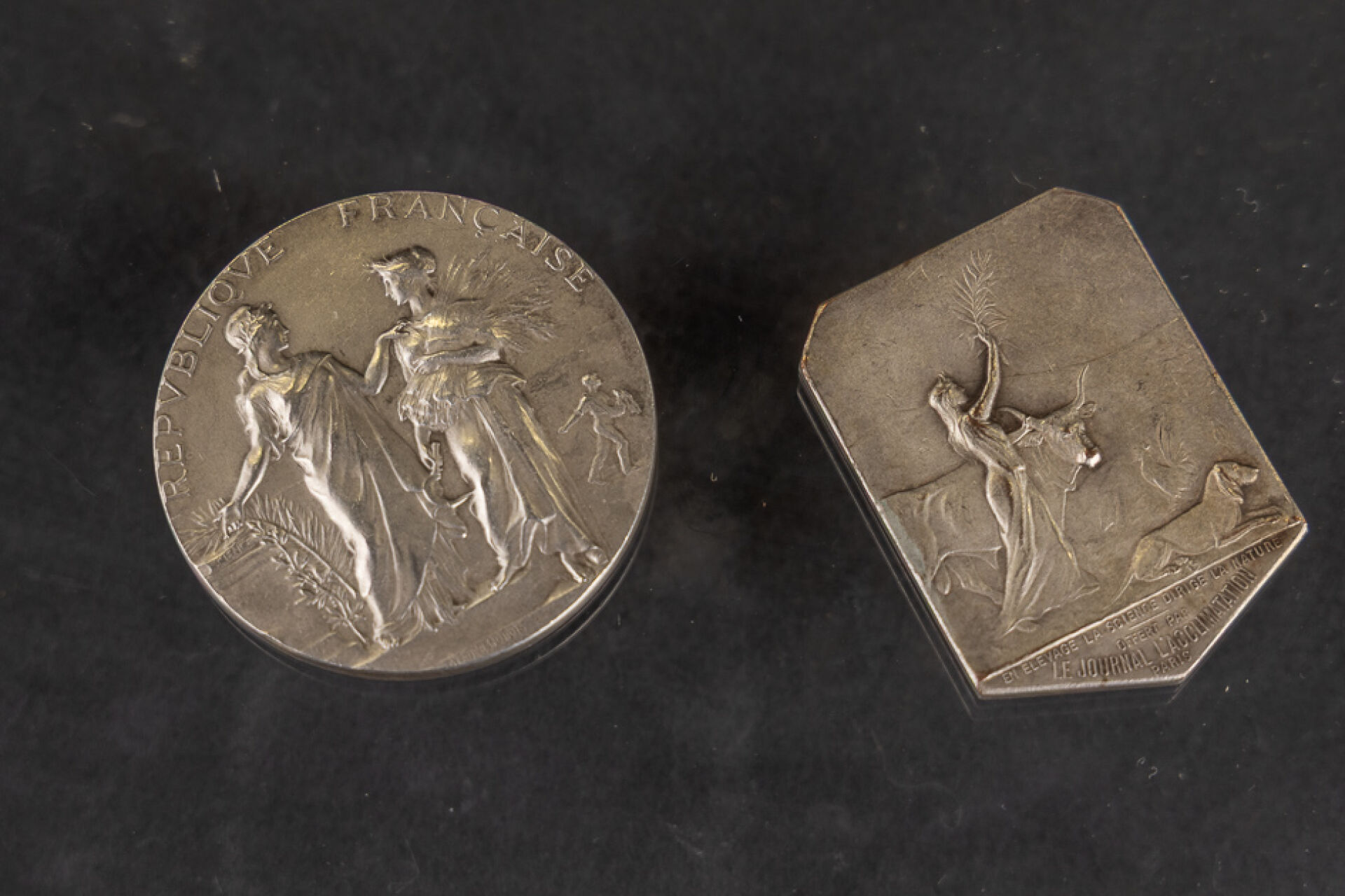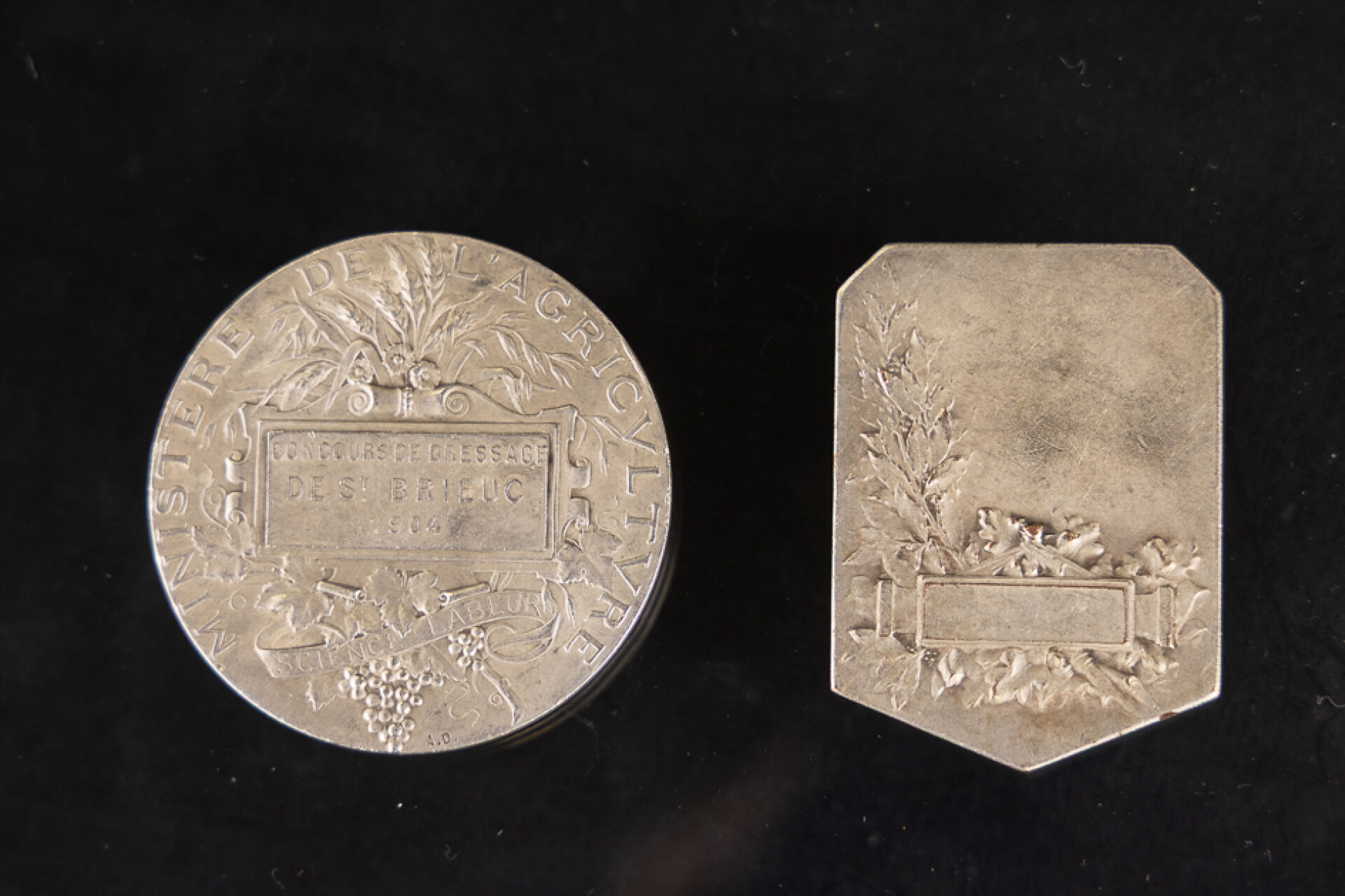 Médaille en argent 925 millièmes du Ministère de l'Agriculture, Concours de dressage de Saint Brieuc 1904. Poids : 62.53 gr On joint une médaille en bronze offerte par le Journal l'Acclimatation "En élevage la science dirige la nature". PAS DE LIVE POUR CE LOT PIECES CONSERVEES A LA BANQUE - VENDUES SUR DESIGNATION - VISIBLES SUR RENDEZ-VOUS UNIQUEMENT 48 H AVANT LA VENTE - DELIVRANCE SUR RENDEZ-VOUS UNIQUEMENT 72 HEURES A L'AVANCE