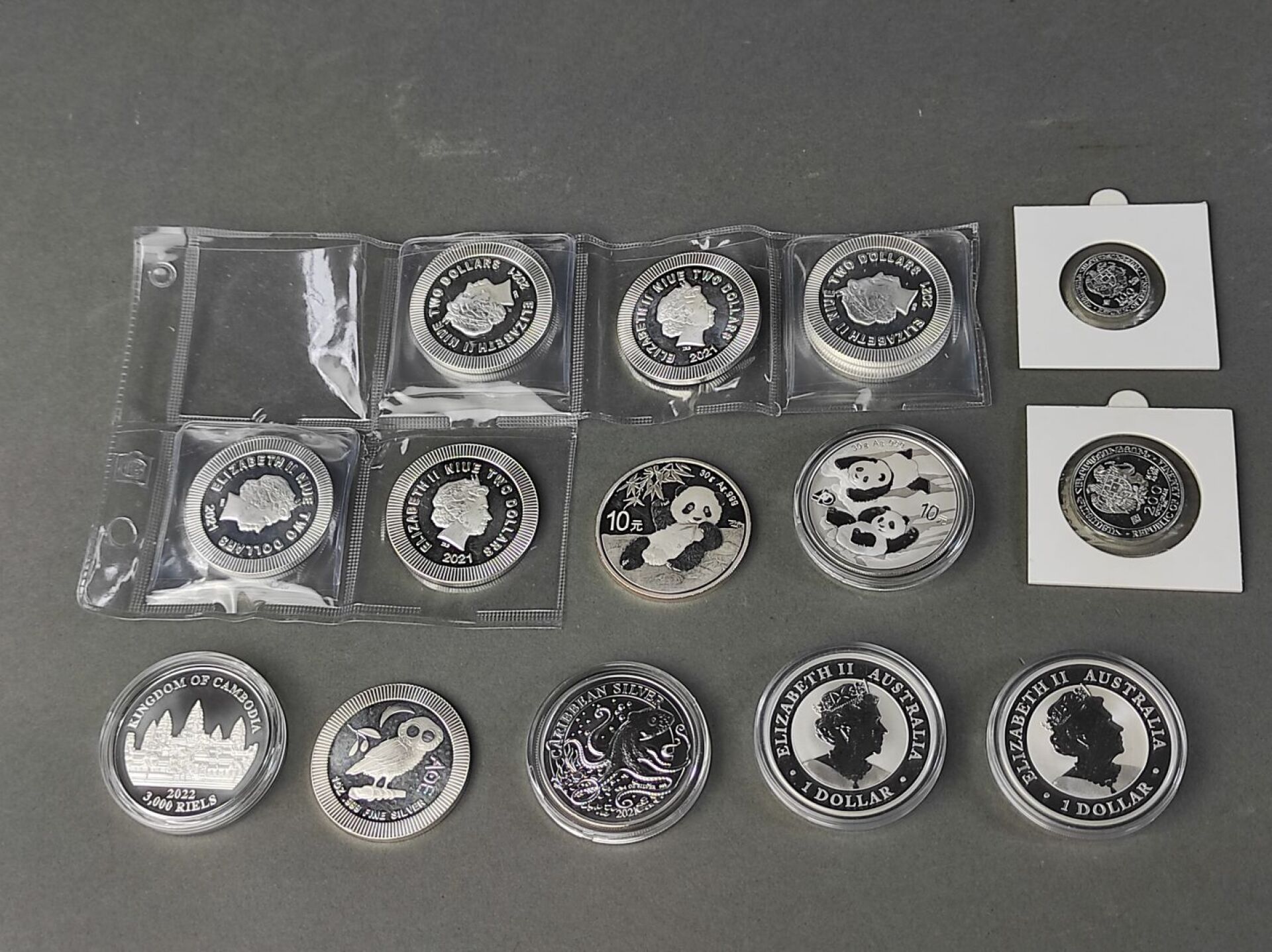 Ensemble de monnaies du monde en argent dont : - 9 pièces d'une once Argent Niue 2021 (Chouette) - 1 pièce de 30 g Argent Chine 2022 (Panda) - 1 pièce de 30 g Argent Chine 2021 (Panda) - 1 pièce d'une once Argent Australie 2022 (Kookaburra) - 1 pièce d'une once Argent Barbade (Pieuvre) - 1 pièce d'une once Argent Australie 2020 (Emeu) - 1 pièce d'une once Argent Cambodge 2022 (Lost Tigers) - 1 pièce d'1/2 once Argent Arménie 2021 (Arche de Noé) - 1 pièce d'1/4 once Argent Arménie 2021 (Arche de Noé) PAS DE LIVE POUR CE LOT PIECES CONSERVEES A LA BANQUE - VENDUES SUR DESIGNATION - VISIBLES SUR RENDEZ-VOUS UNIQUEMENT 48 H AVANT LA VENTE - DELIVRANCE SUR RENDEZ-VOUS UNIQUEMENT 72 HEURES A L'AVANCE