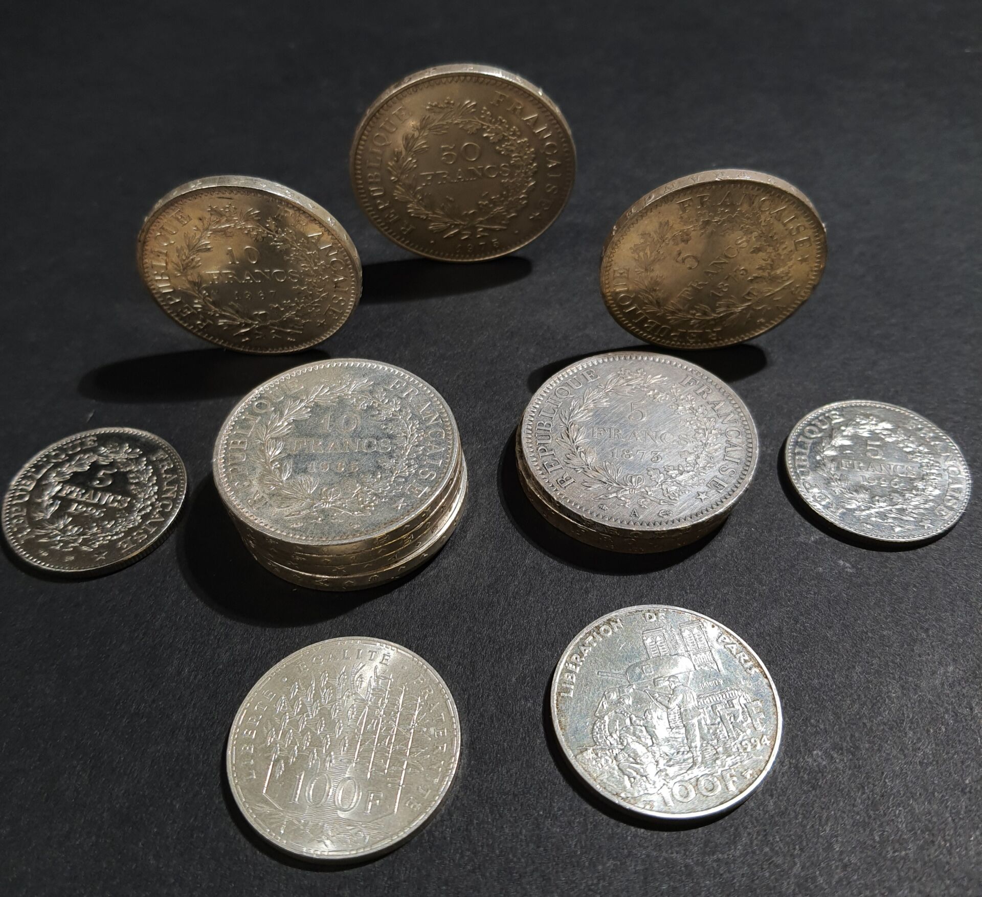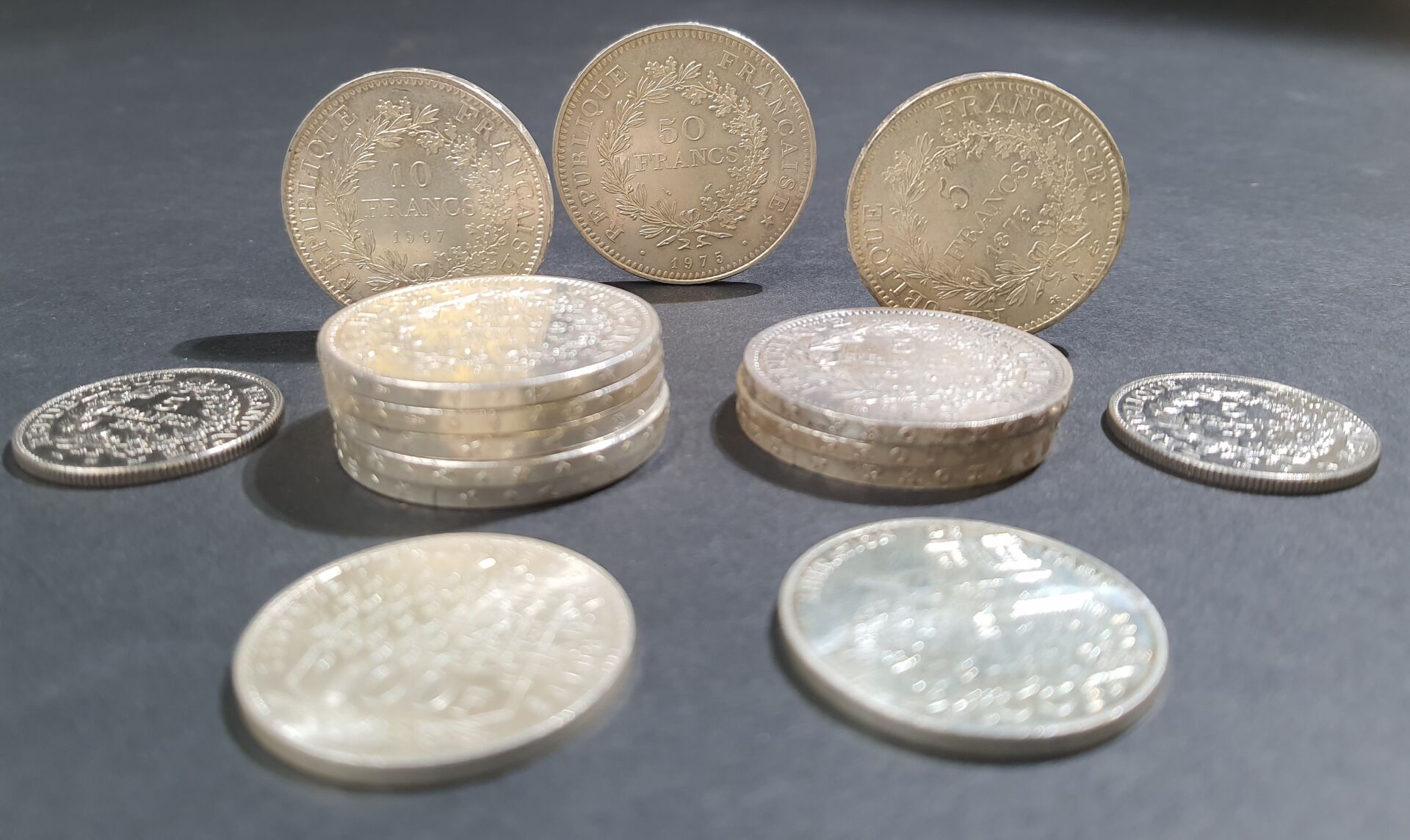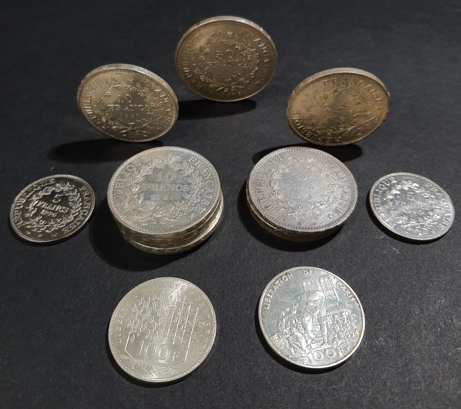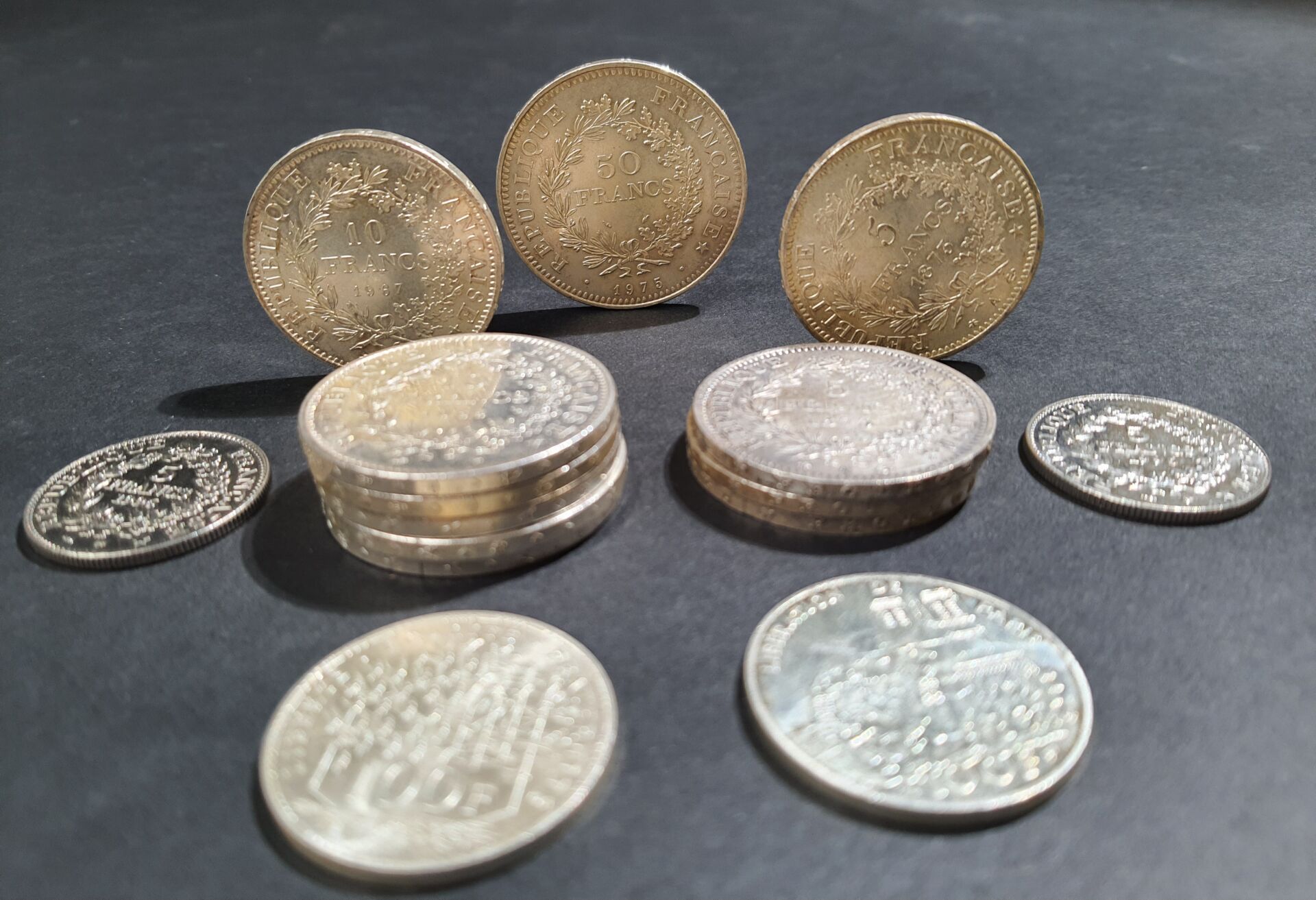 Ensemble de pièces en argent dont : - Deux pièces de cinq francs Hercule 1996. - Deux pièces de cent Francs. - Six pièces de dix francs Hercule. - Cinquante Francs Hercule. - Quatre pièces de cinq Francs Hercule. Poids total : 331.97 gr PAS DE LIVE POUR CE LOT PIECES CONSERVEES A LA BANQUE - VENDUES SUR DESIGNATION - VISIBLES SUR RENDEZ-VOUS UNIQUEMENT 48 H AVANT LA VENTE - DELIVRANCE SUR RENDEZ-VOUS UNIQUEMENT 72 HEURES A L'AVANCE