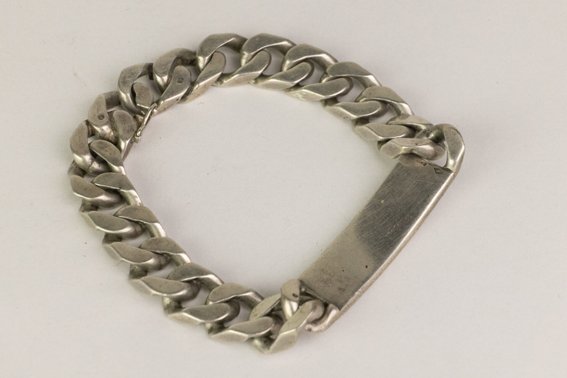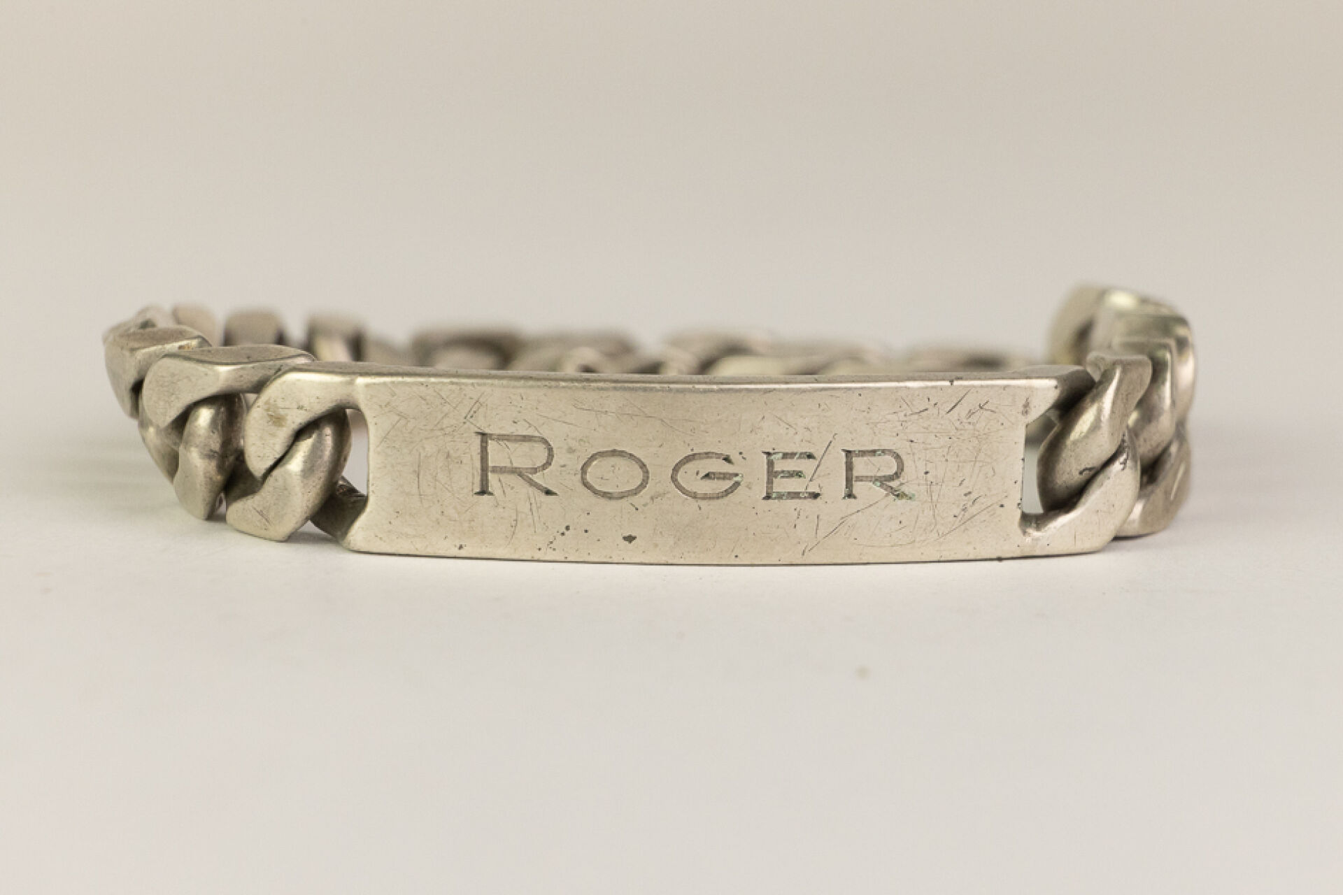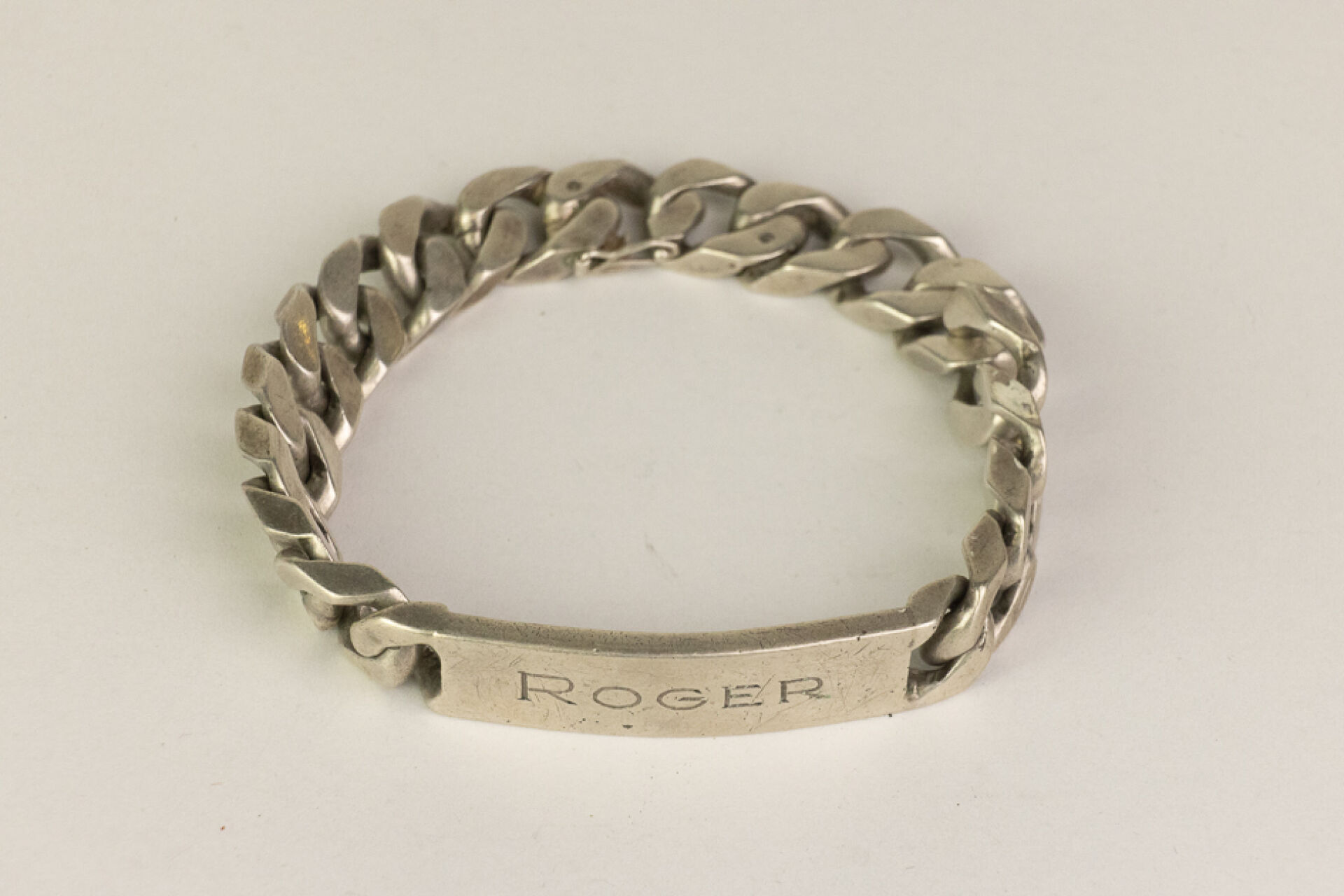 Gourmette en argent (800 millièmes, poinçon crabe), la plaque marquée "Roger", fermoir avec huit de sécurité. Poids : 73,16 gr