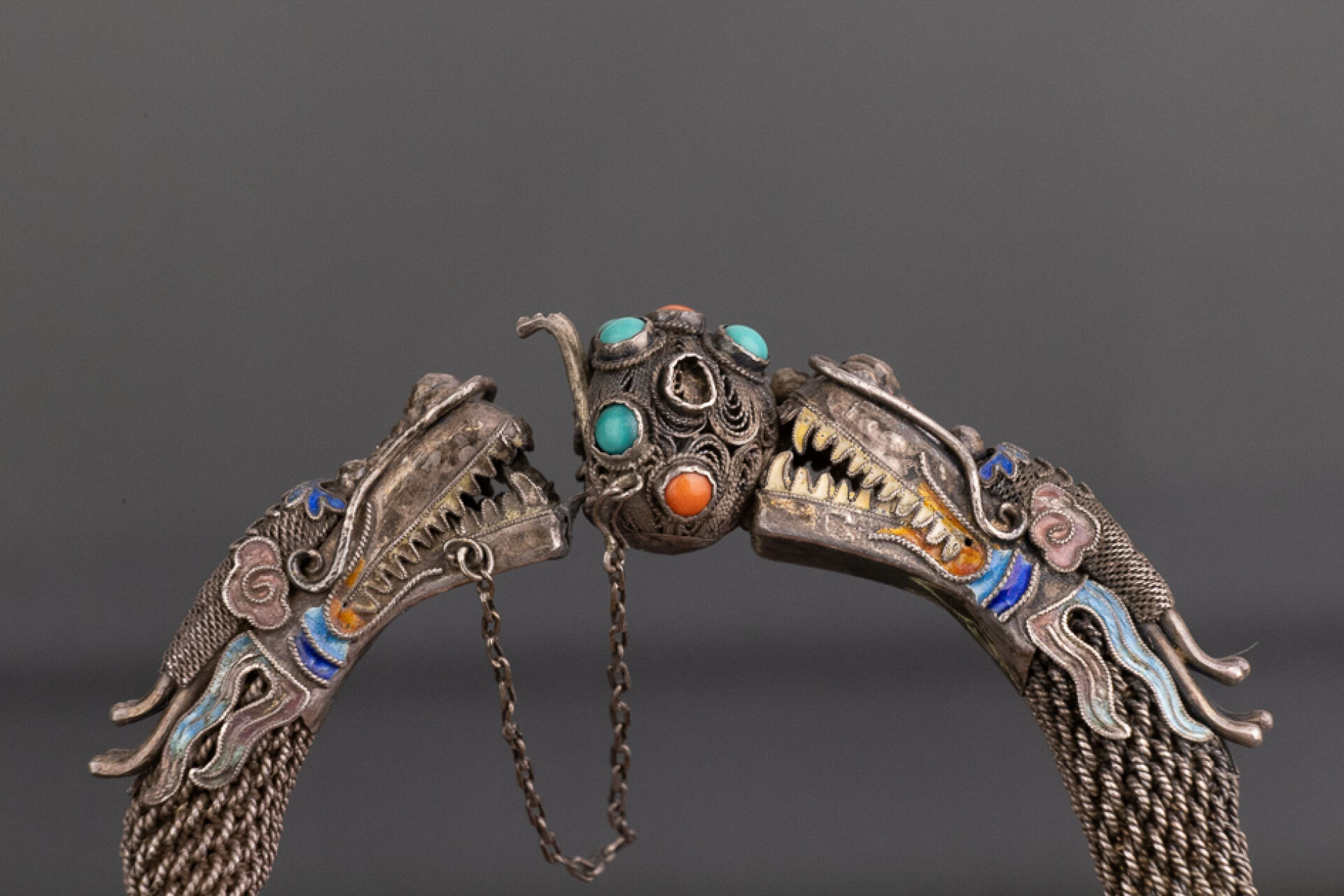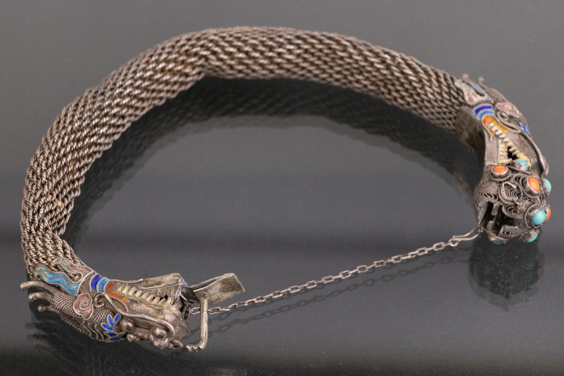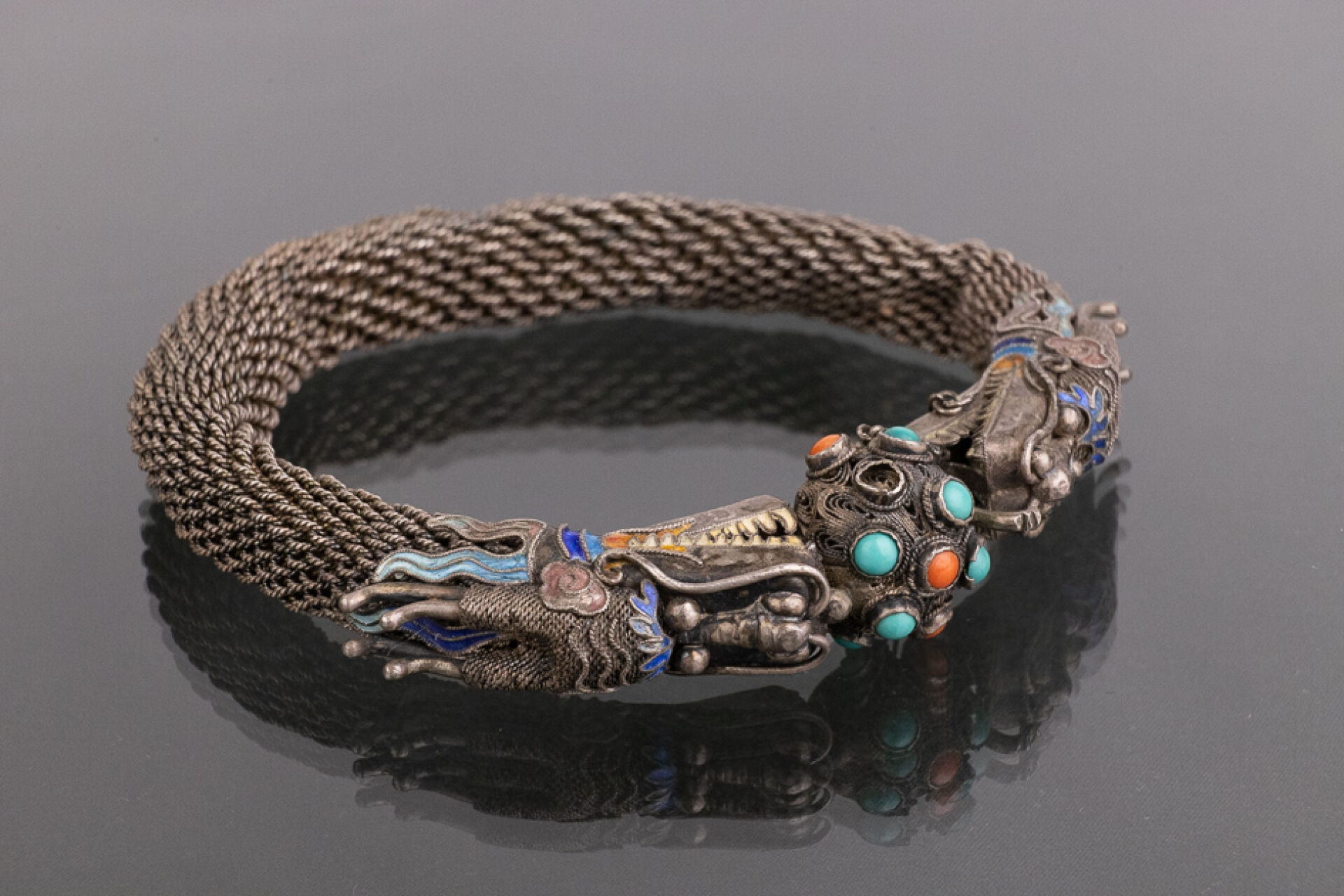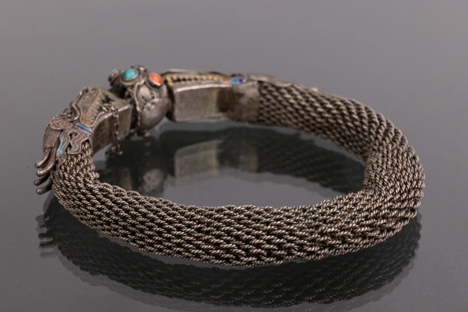 Bracelet articulé en argent 925 millièmes, à décor de dragons chinois émaillés et sertis de pierres de couleur, mailles entrelacées, chaine de sécurité. Travail indochinois, fin XIXème - début XXème siècle Poids brut : 93.56 gr Petits accidents et manques