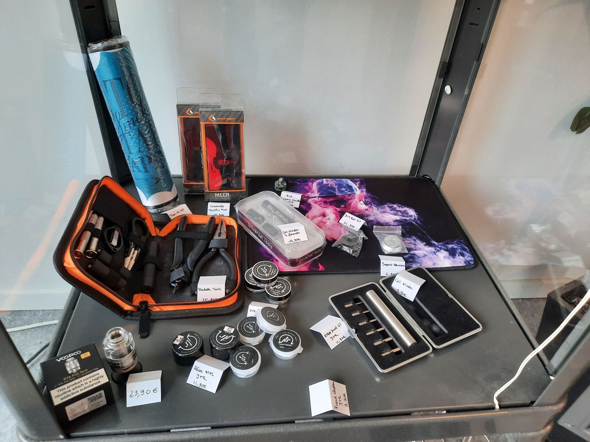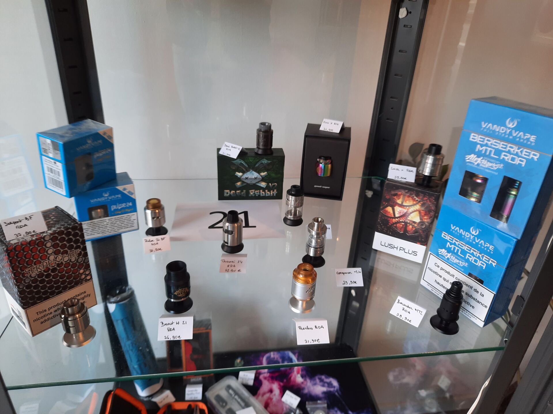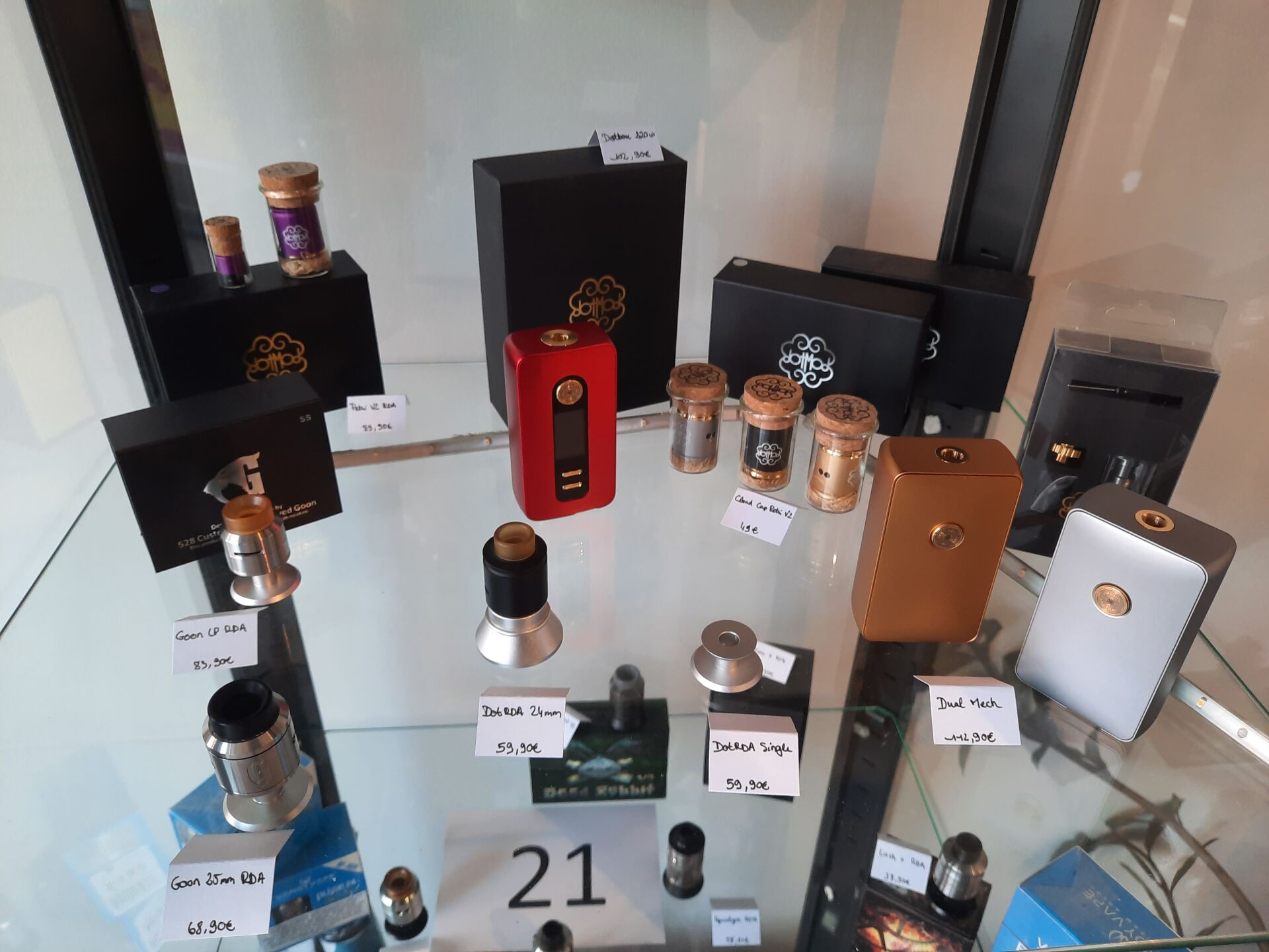 3 e-cigarettes Dot Mod dont 2 Dual Mech et Dotbo x 220 w, ensemble de clearomiseurs/atomiseurs et divers produits et accessoires d'entretien CONTENU DE LA VITRINE 5