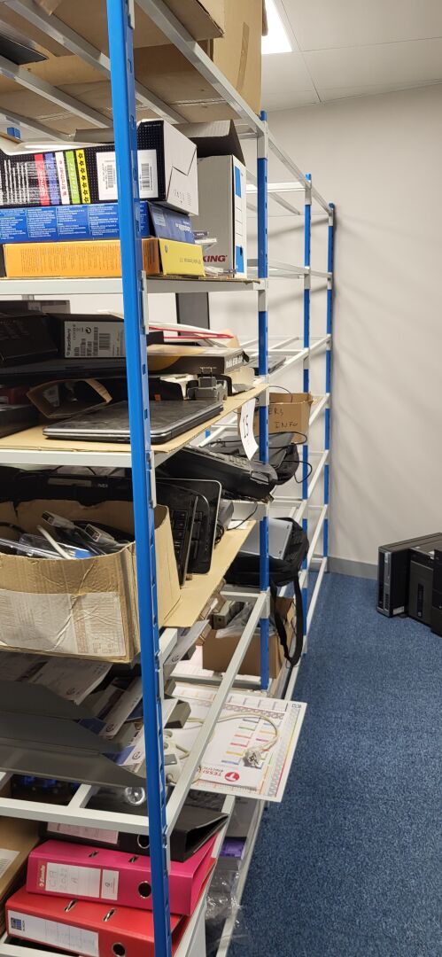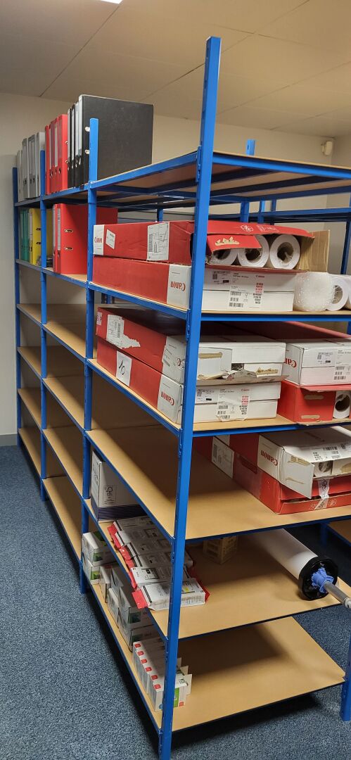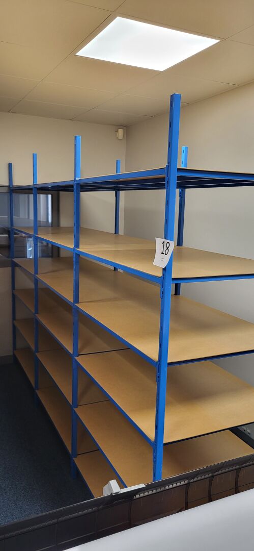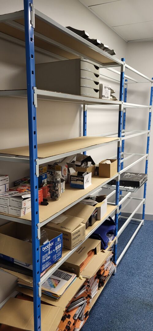 2 linéaires d'étagères métal bleu 6 niveaux (2 x 3 m), largeur 70 cm hauteur 200 cm (sans contenu) 2 étagères métal 250 x 36 x 200 cm et 300 x 70 x 200 cm (sans contenu)