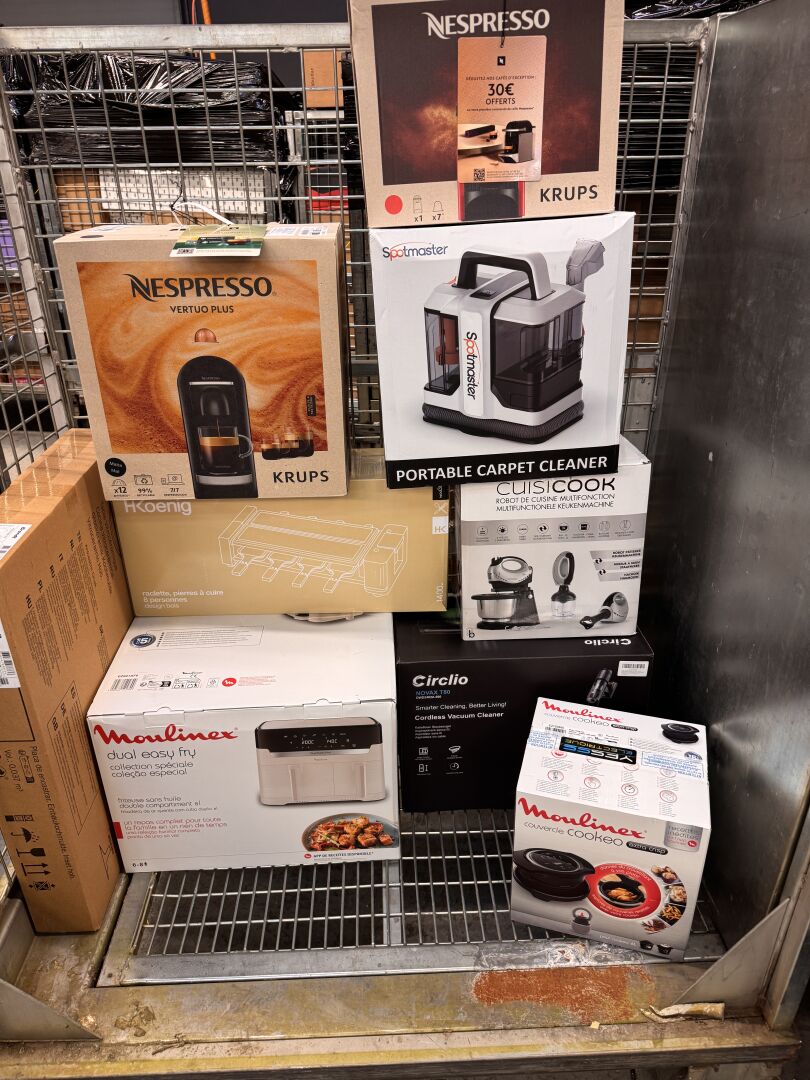 LOT DE PETITS ELECTROMENAGERS DONT NETTOYEUR, MACHINE A CAFE, AIRFRYER (expédition sur devis) Lot issu de colis non réclamés : état de fonctionnement non garanti.