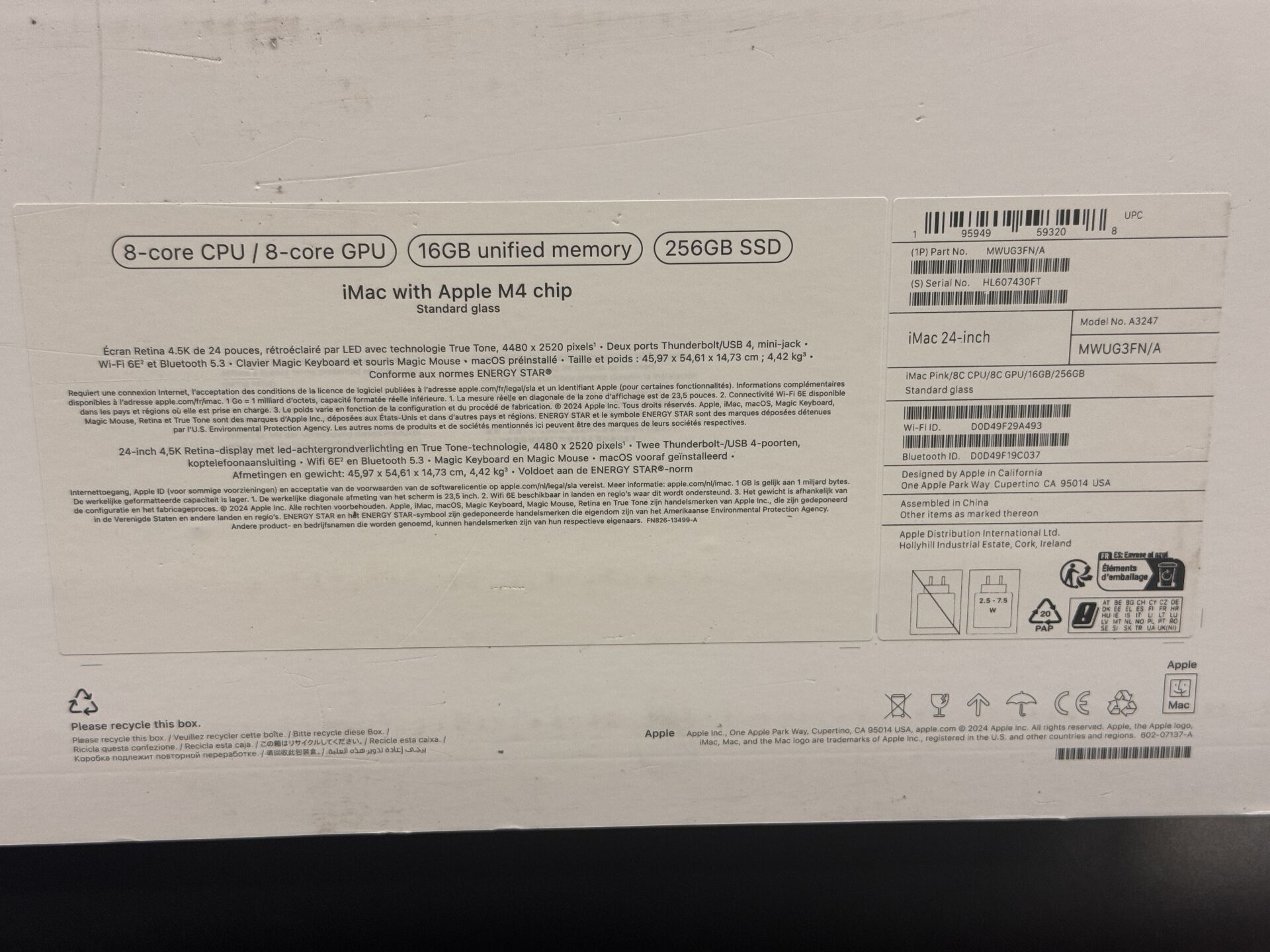 APPLE IMAC M4 PINK 8 CORE 16/256GB MWUG3FN/A A3247 195949593208 SN HL607430FT (avec scellé) EXPEDITION POSSIBLE (ce lot chez vous en France métropolitaine pour 40,98€) Lot issu de colis non réclamés : état de fonctionnement non garanti.