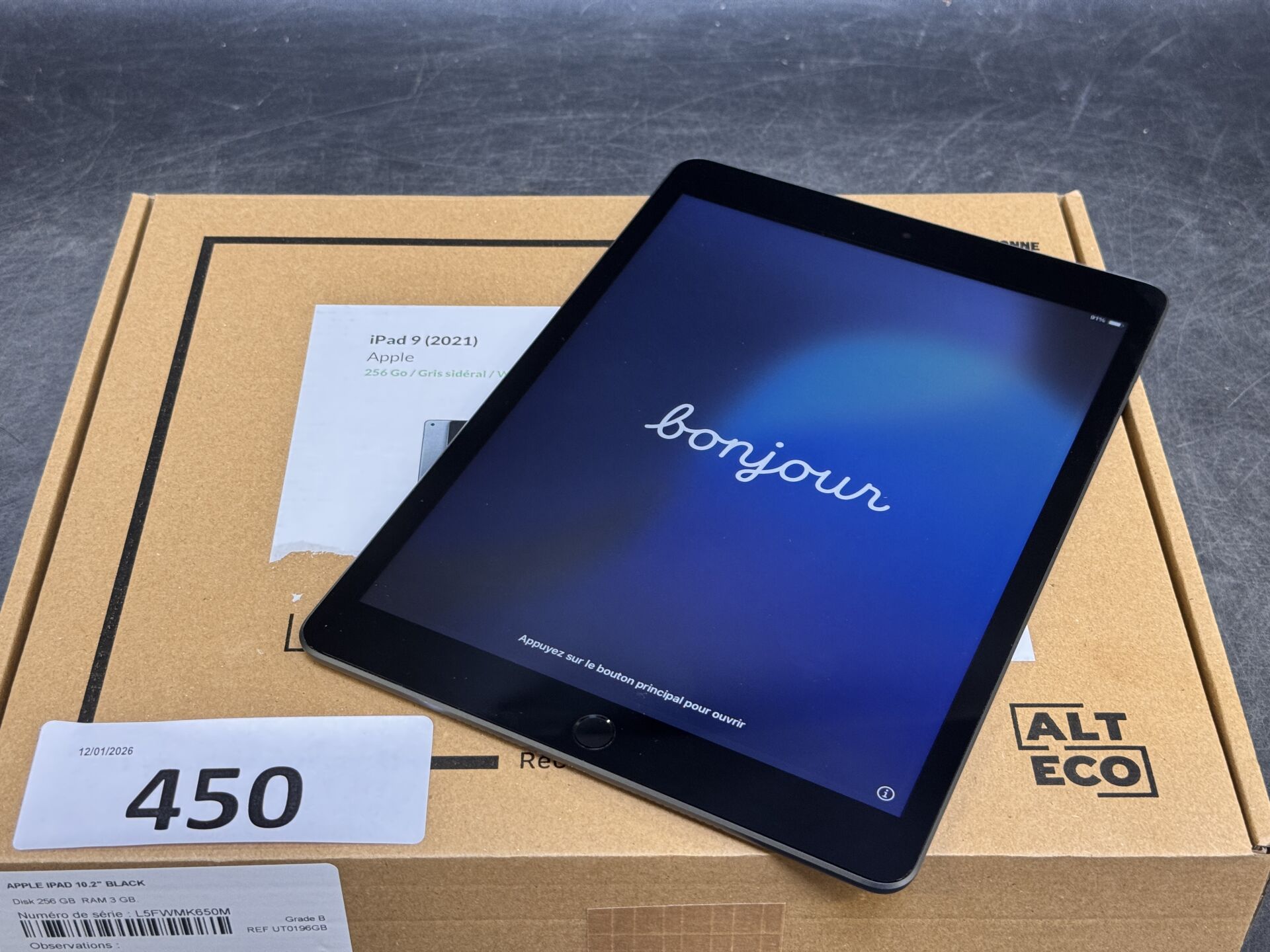 APPLE IPAD GEN 9 256GB SPACE GRAY SN L5FWMK650M EXPEDITION POSSIBLE (ce lot chez vous en France métropolitaine pour 25,80€) Lot issu de colis non réclamés : état de fonctionnement non garanti.
