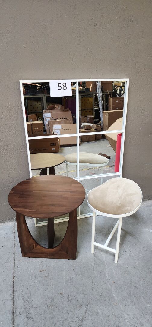 1 miroir 6 cases metal blanc 120x80cm, 1 tabouret métal blanc assise velours marron clair, 1 table basse bois diamètre 51cm ( pied cassé )