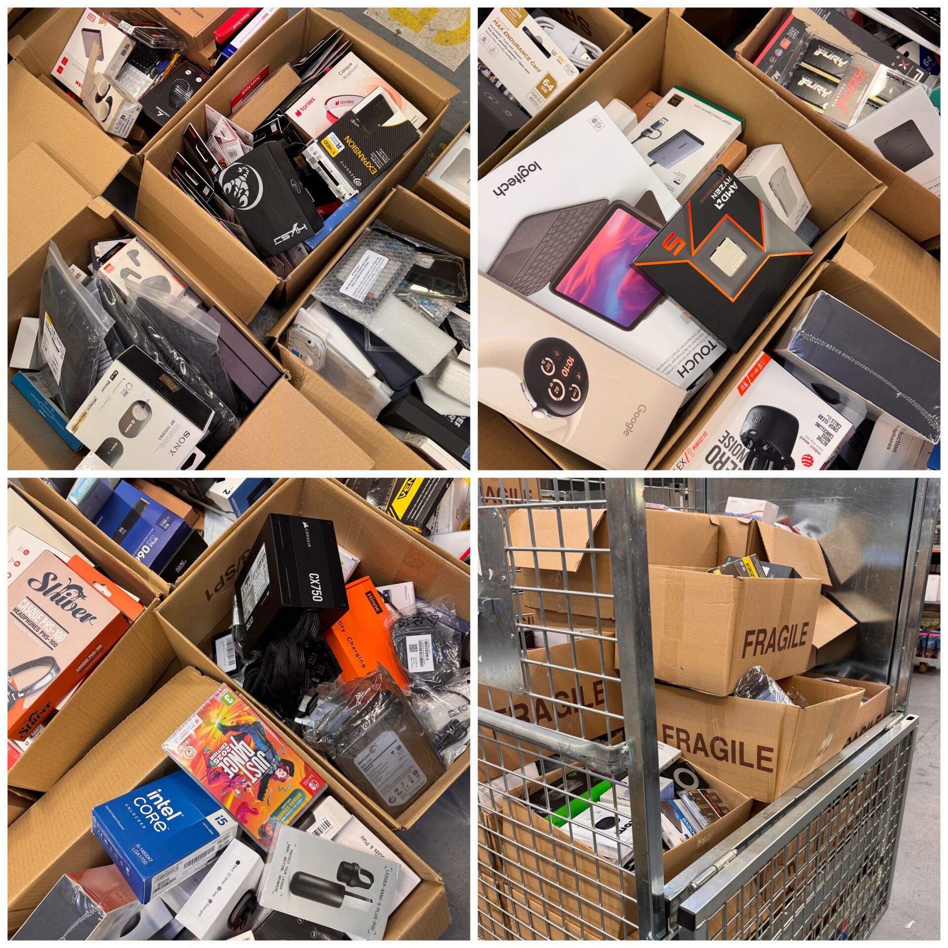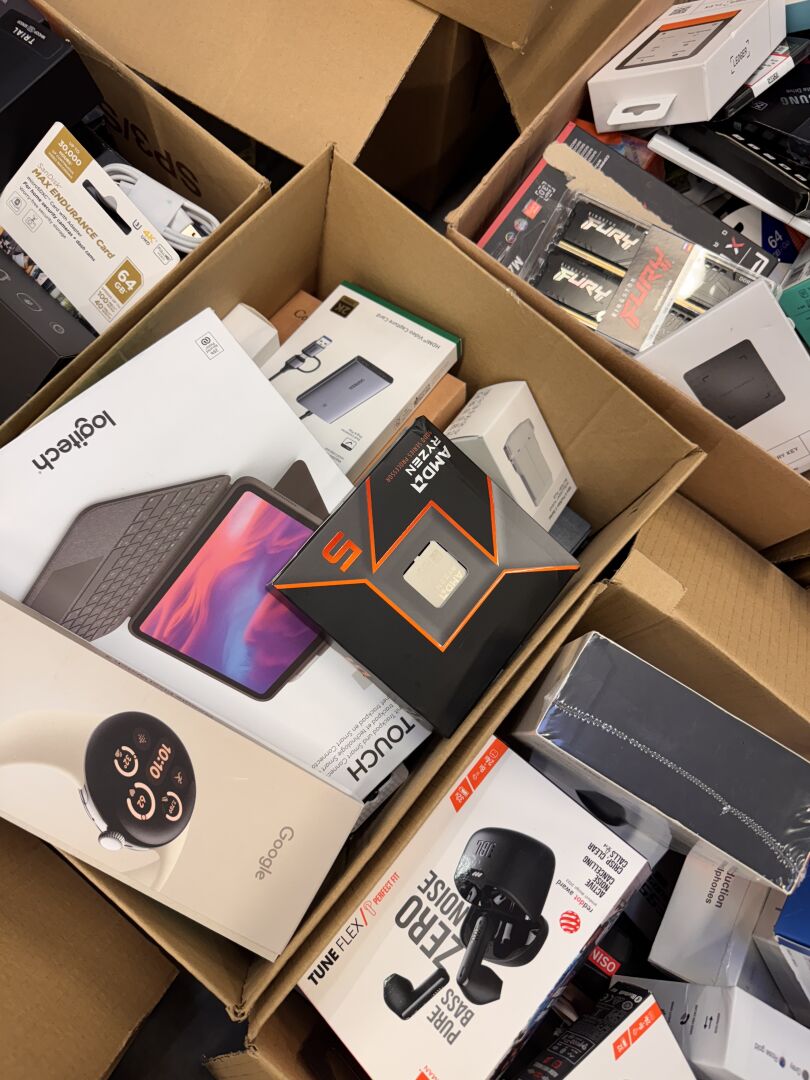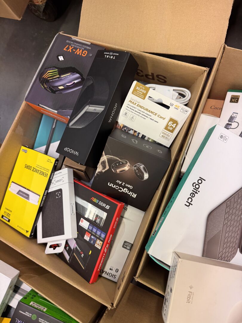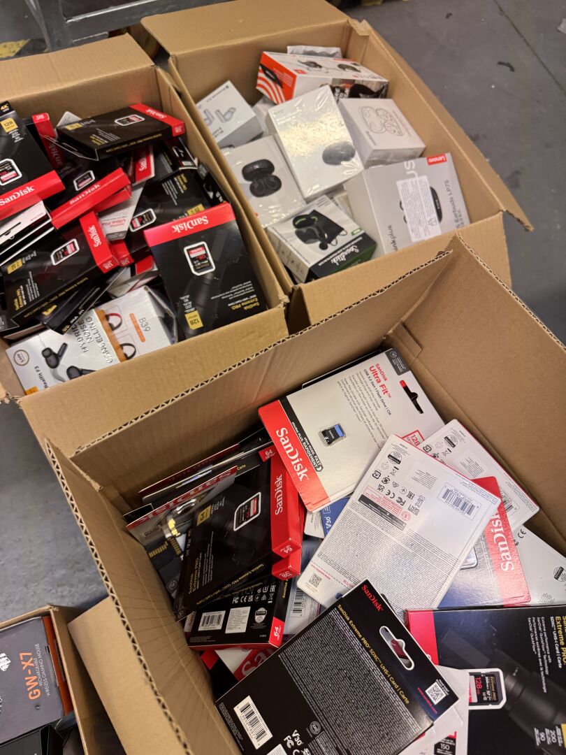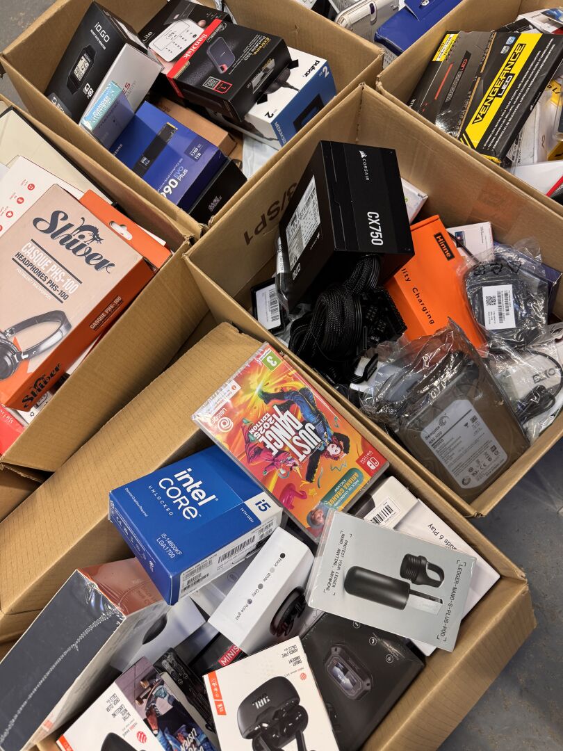 PETITS MATERIELS ELECTRONIQUES ET MULTIMEDIAS DONT ECOUTEURS, SSD, MEMOIRES, DISQUES, CABLES, CHARGEURS (dont produits sans scellé, traces d'usage) (expédition sur devis) Lot issu de colis non réclamés : état de fonctionnement non garanti.