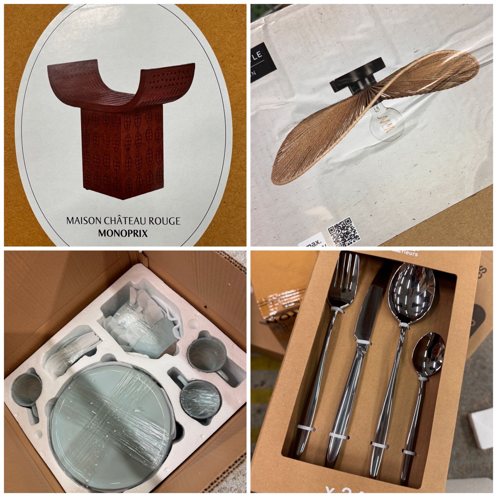FORT ENSEMBLE DE PETITS MOBILIERS ET DECORATIONS (environ 1m3) DONT TABOURET, FAUTEUIL, SUSPENSION (expédition sur devis) Lot issu de colis non réclamés : état de fonctionnement non garanti.