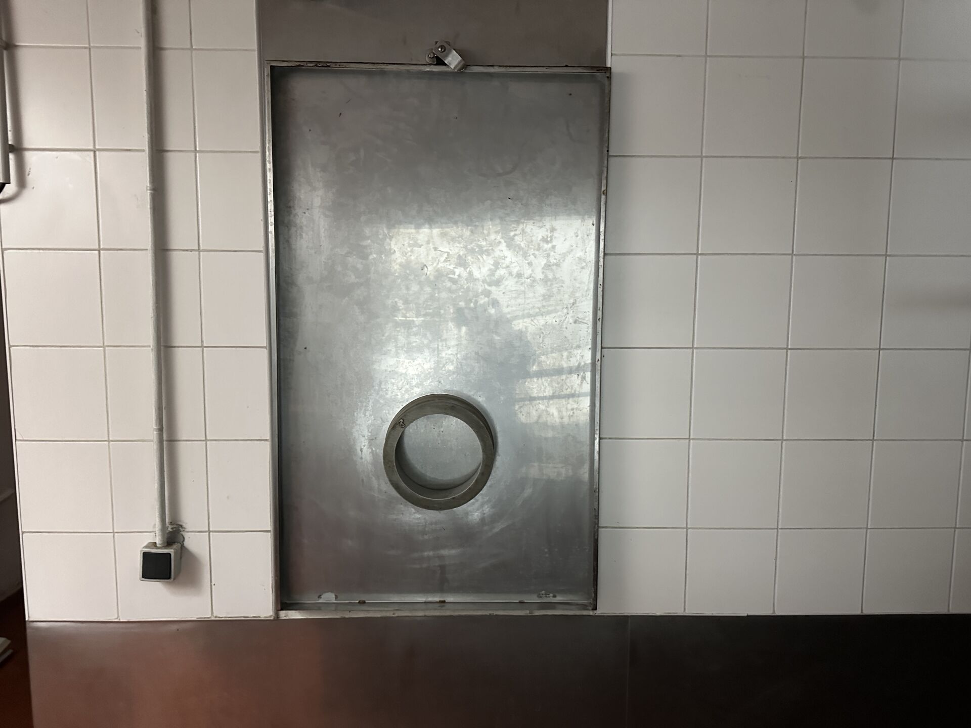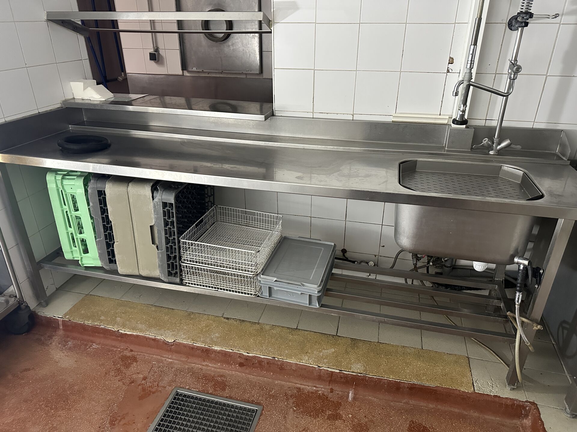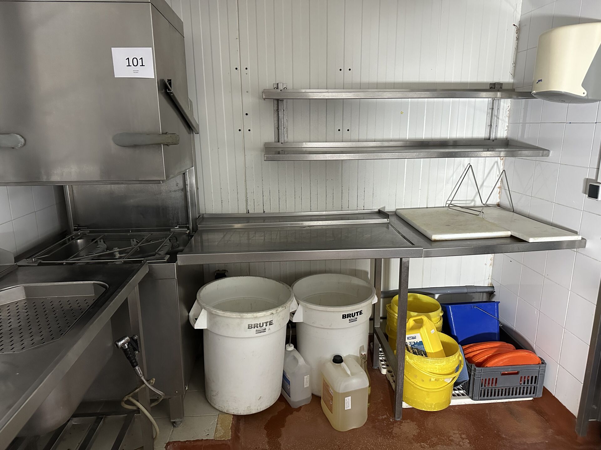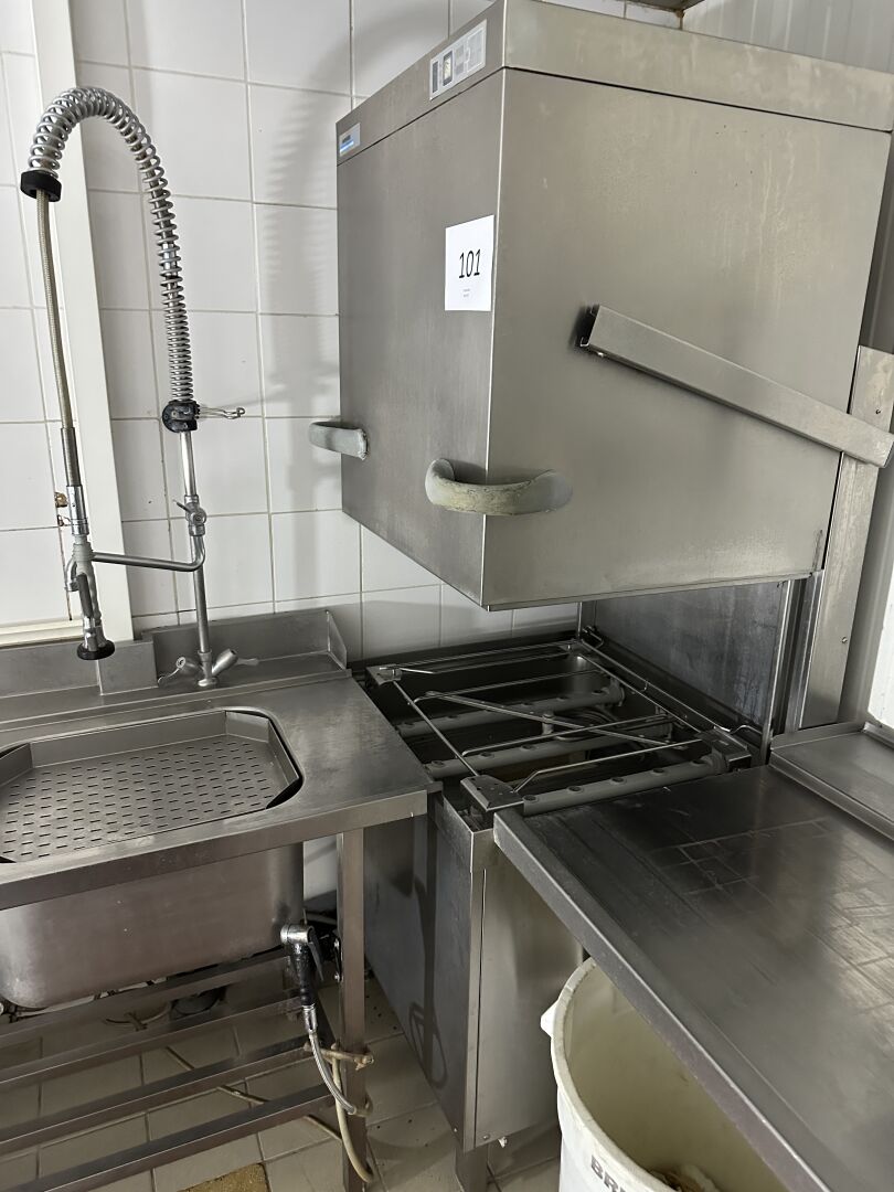 1 lave vaisselle à capot inox WINTERHALTER sans plaque apparente 70 x 75 x 155 cm , avec 2 plans latéraux inox dont 1 avec 1 bac, douchette et passe déchets 255 x 70 cm et 186 x 78 cm avec 8 paniers 50 x 50 cm , on y joint 1 plateau inox rabattable avec passe-déchets 115 x 70 cm à charge de démonter proprement en respectant l'étanchéité, prévoir pose de bouchons de plomberie