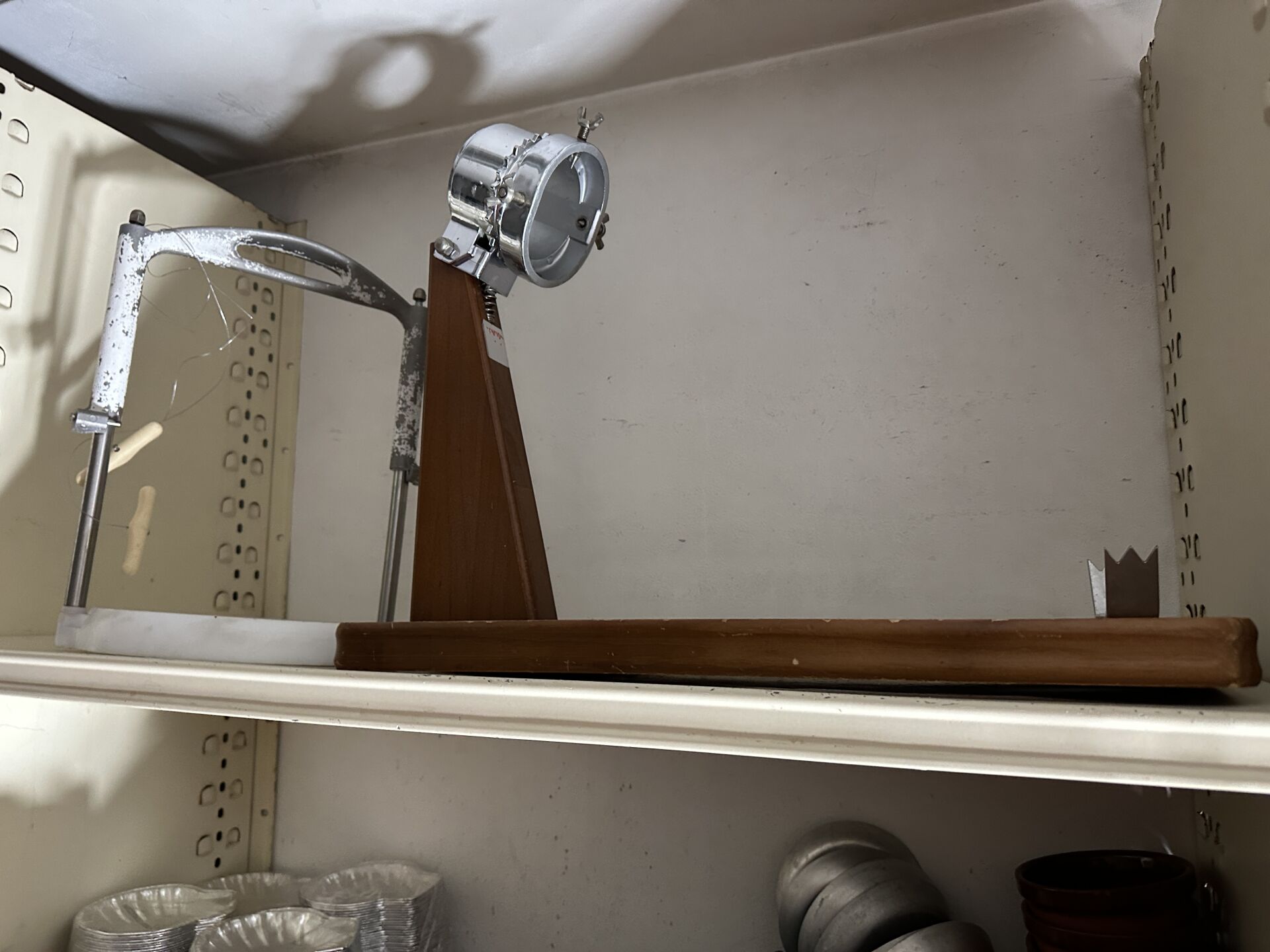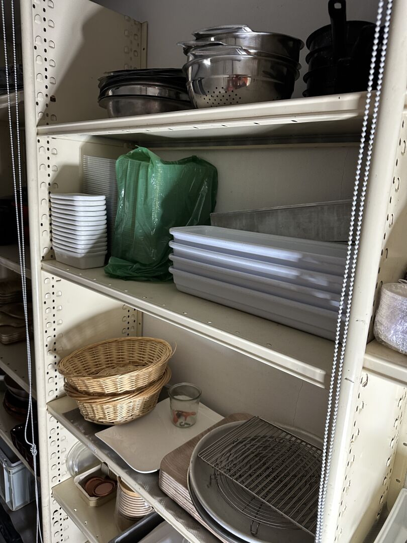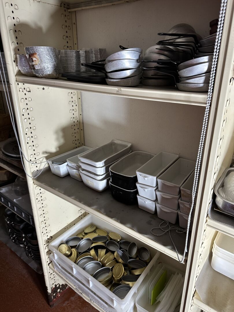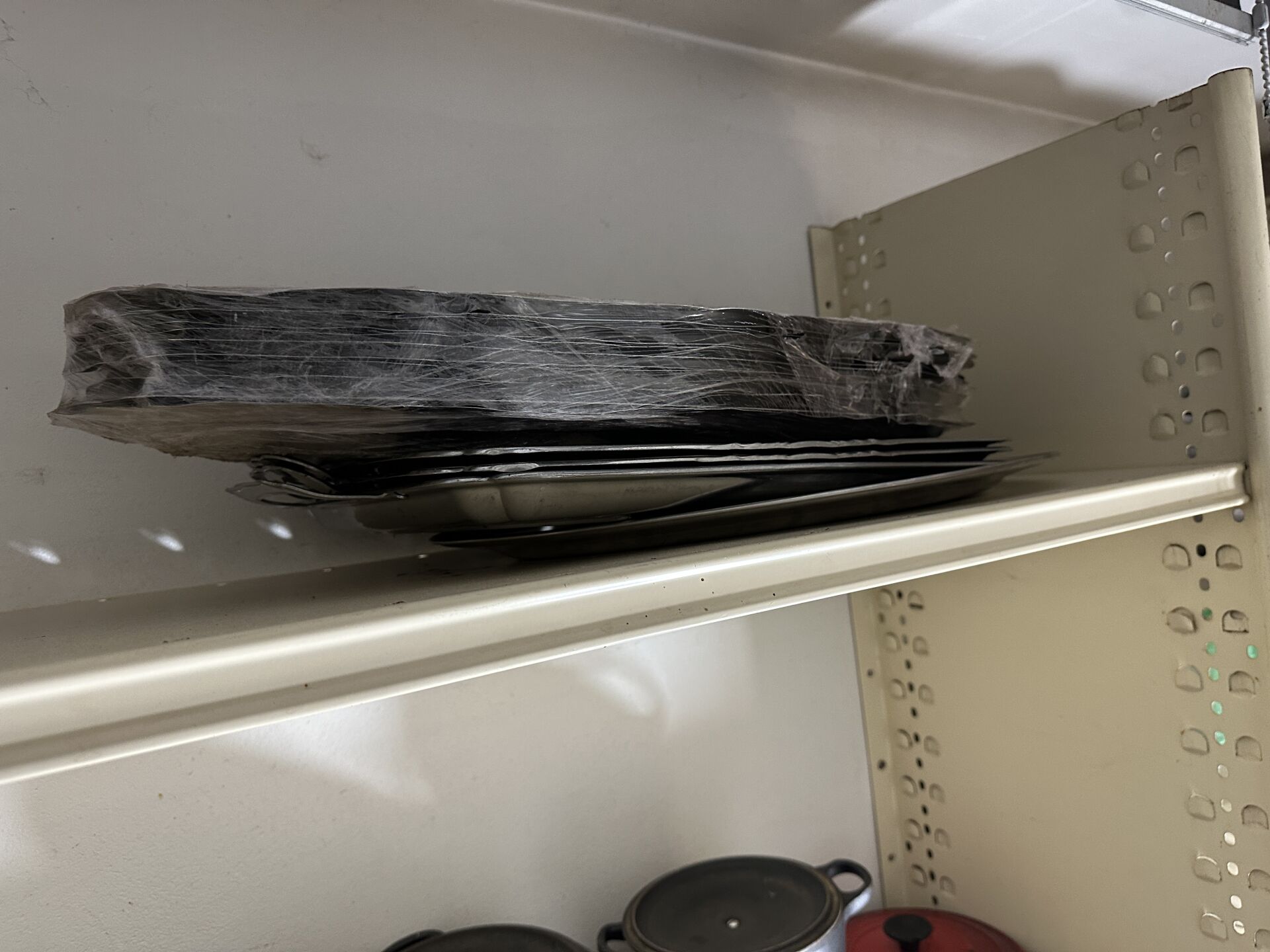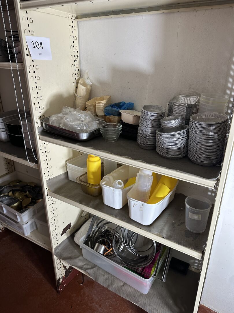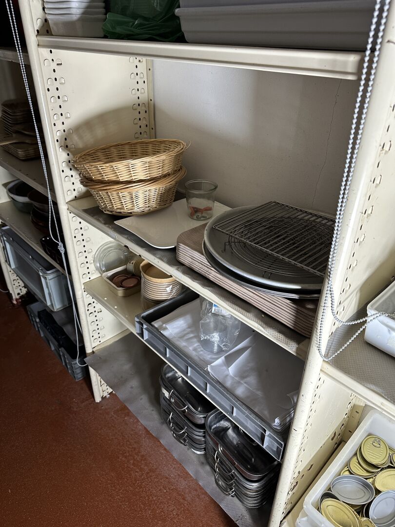 Dans un couloir : sur 1 étagère, 1 ensemble d'ustensiles et accessoires de cuisine dont ronds/emporte-pièces, plat sà four en inox, terrines en grès, poêlons, corbeilles et planches à pain, cocottes en fonte LE CREUSET, plats divers, récipients jetables, dont alu et carton etc 1 support à jambon sec 1 coupe fromage