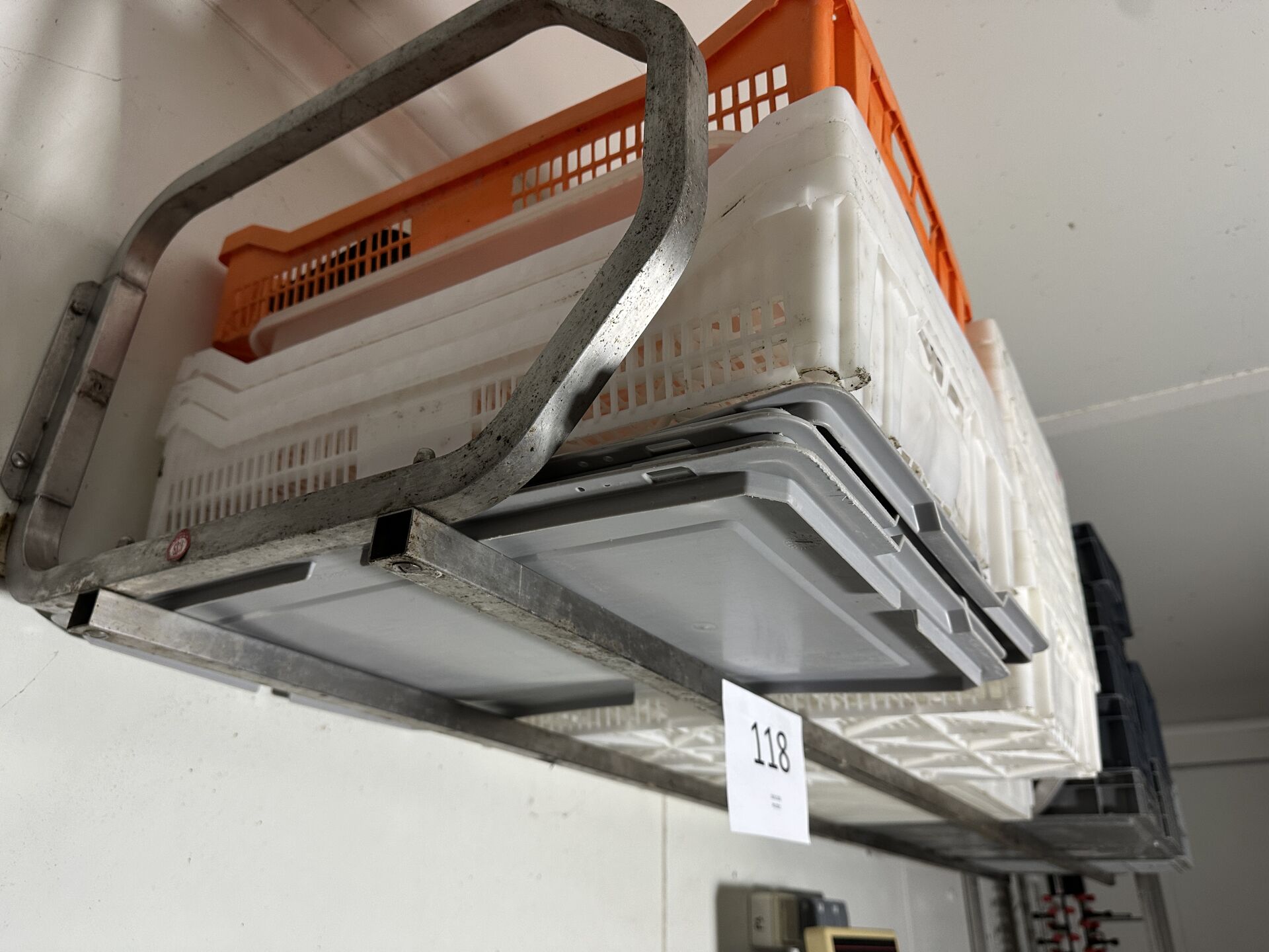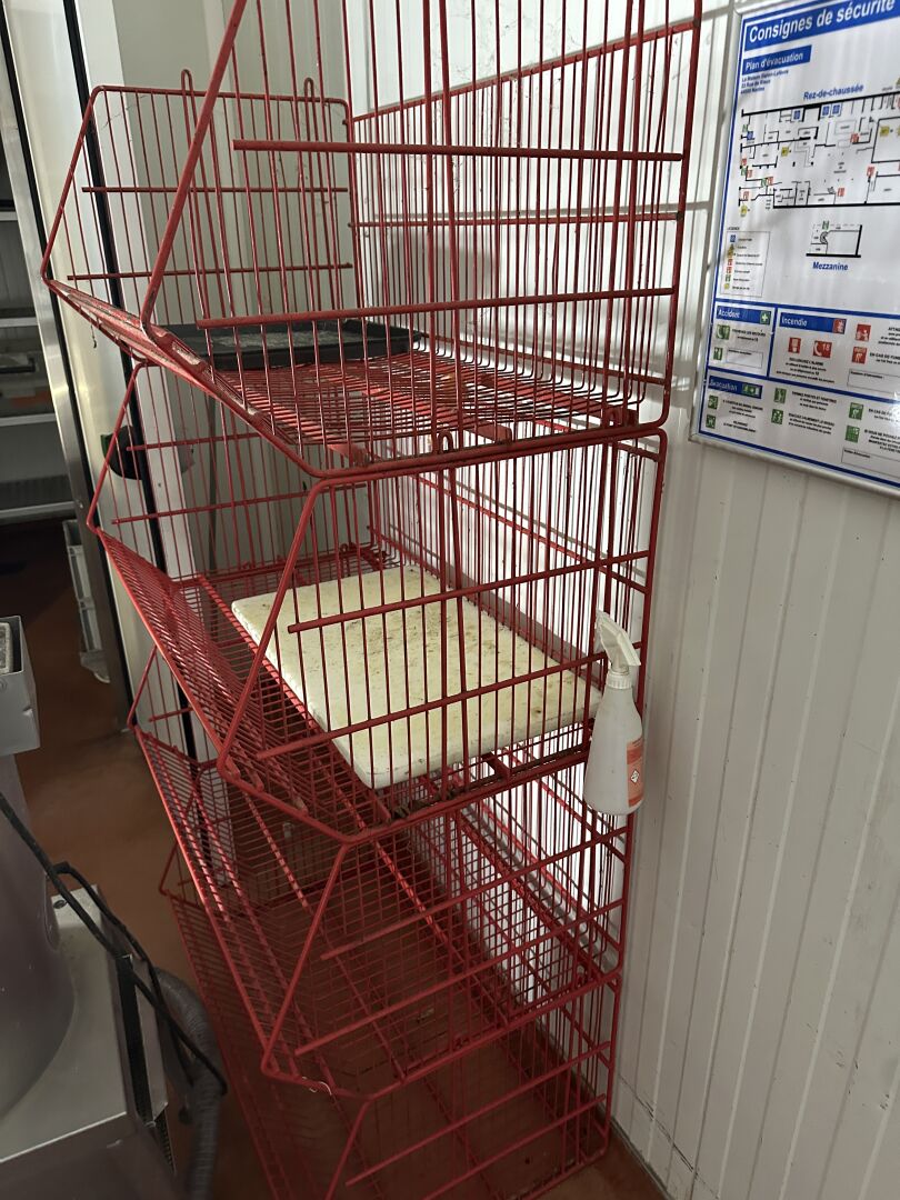 1 étagère murale inox, 262 x 50cm 1 étagère fil métallique rouge en 4 paniers de 96 x 55 cm empilables