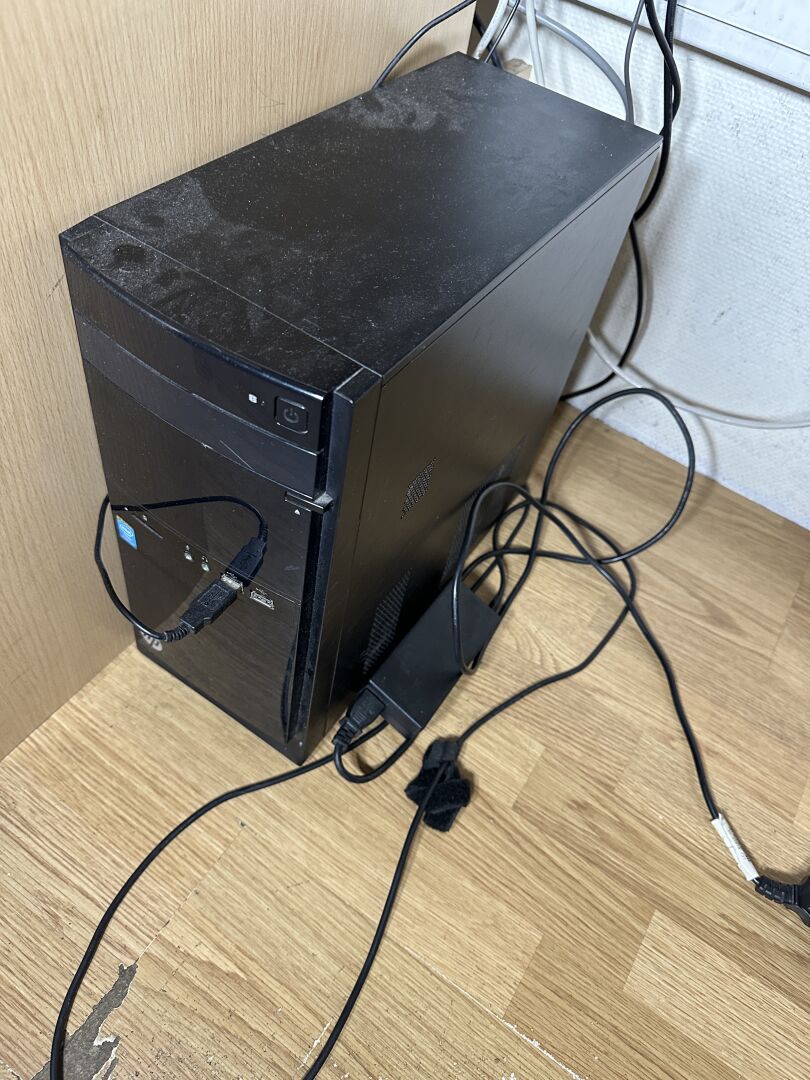 1 unité centrale HP Intel Pentium 1 écran IIYAMA 24" 1 clavier 1 souris 2 enceintes de bureau sans marque apparente 2 chaises tournantes et roulantes tissu noir
