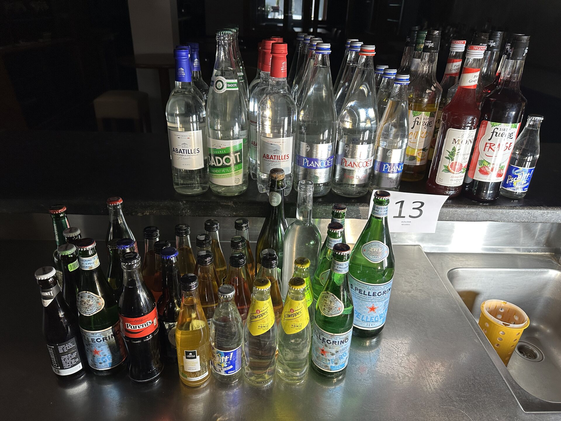 environ 50 bouteilles de boissons non-alcoolisées dont Badoit, San Pellegrino, Plancoet, Schweppes, et divers sirops dont entamés l'acheteur fera son affaire des articles dont la DLUO serait dépassée, recommercialisation interdite
