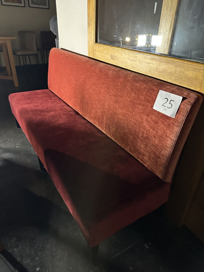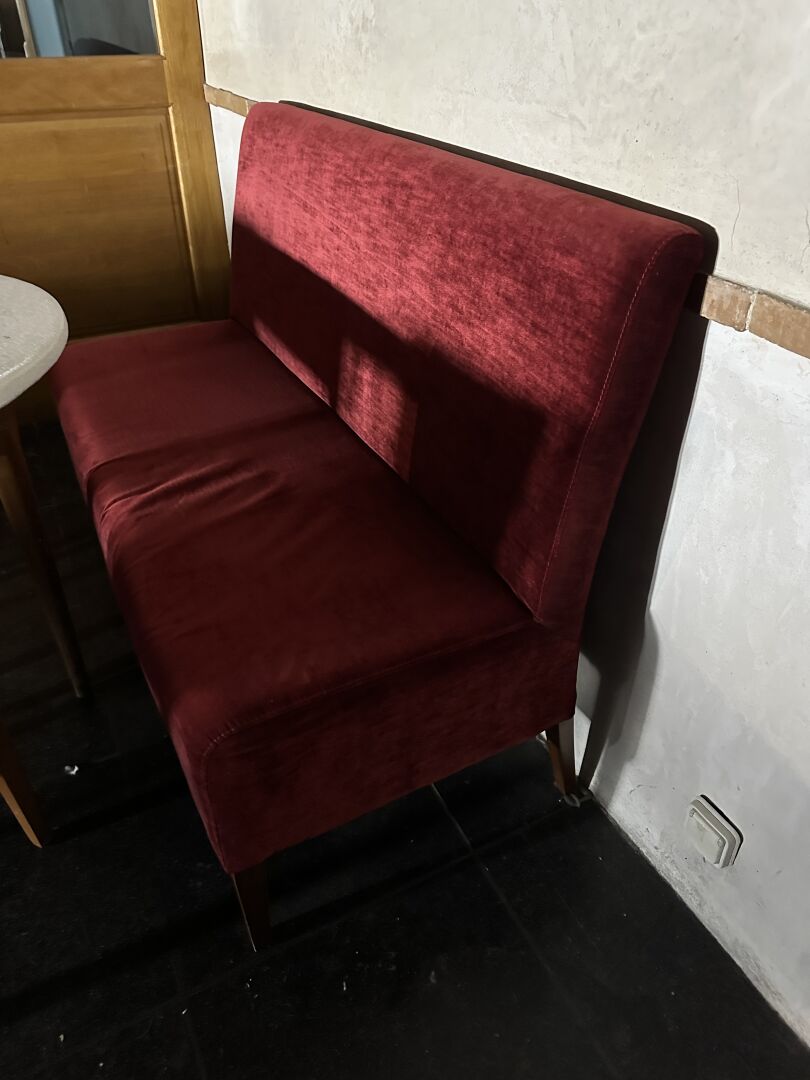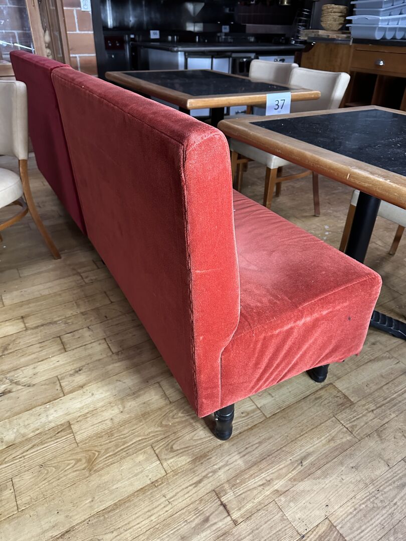 5 banquettes tissu velours rouge dim : 200 cm (x1), 180 cm (x1), 150 cm (x1) et 110 cm (x2)