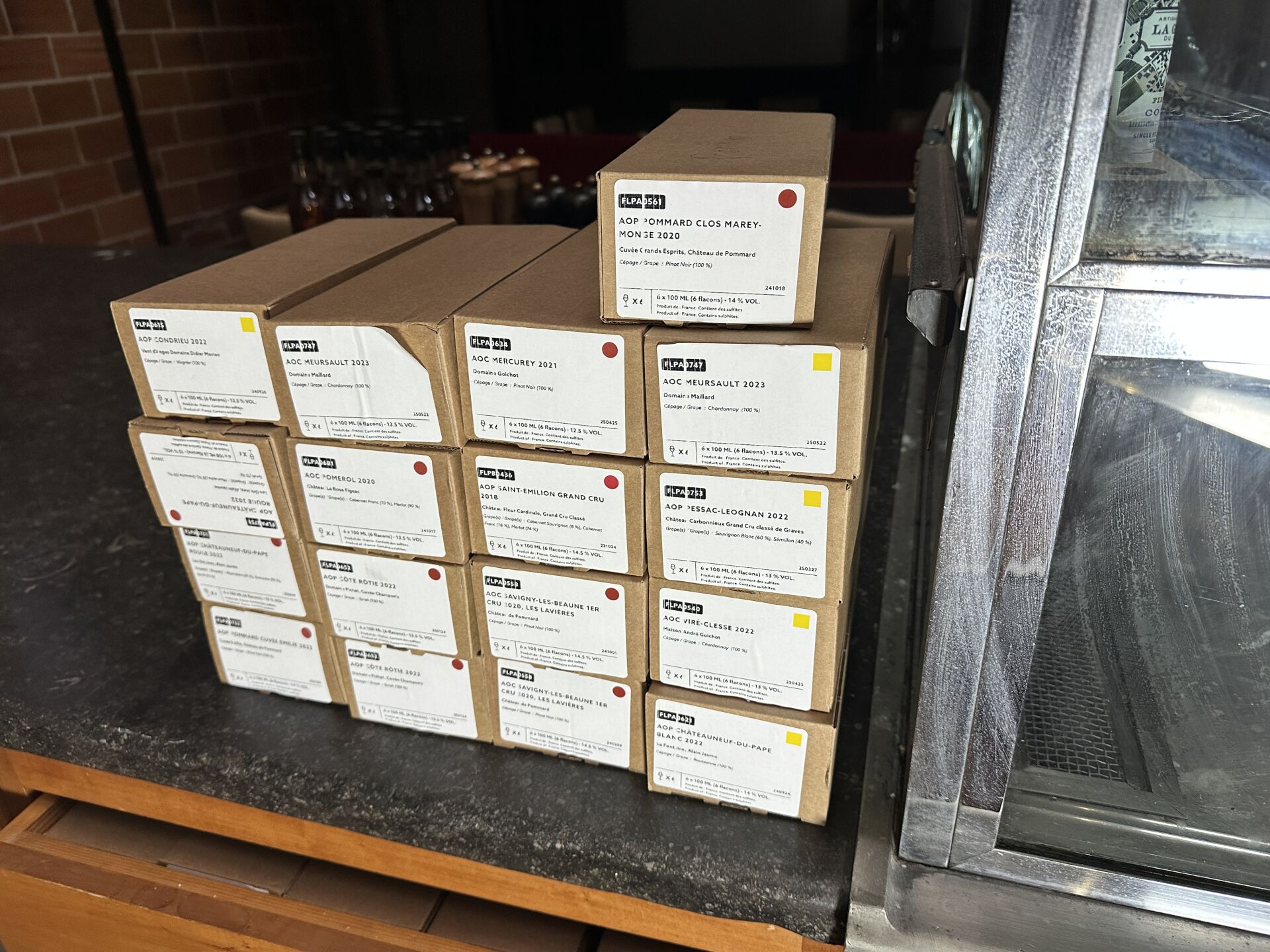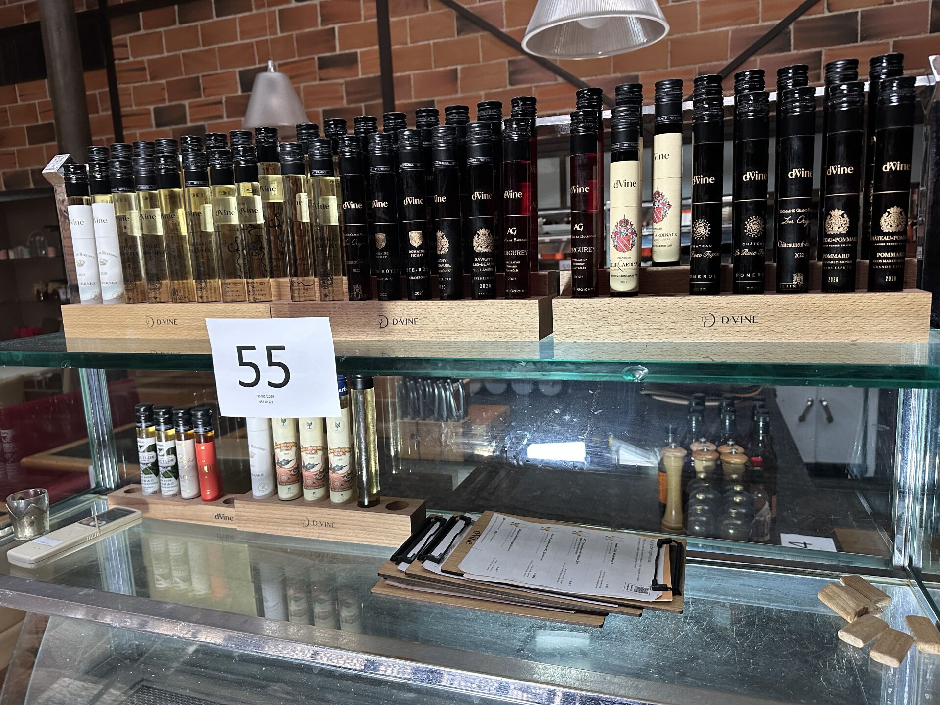 environ 20 boites de 6 tubes de 10 cl de dégustation de vin D-VINE différentes appellations + environ 40 tubes sur présentoirs bois
