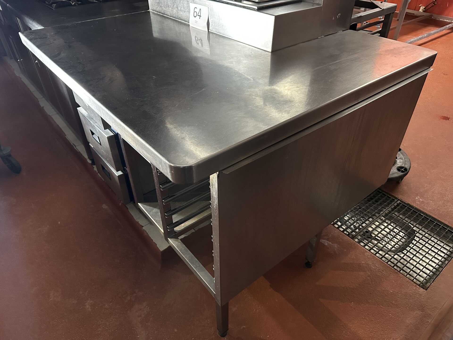 SOUS RESERVES : 1 petit tour réfrigéré positif à 3 tiroirs sans marque ni plaque apparente 63 x 72 x 80 cm sous 1 plan de travail inox avec saladette, équipé d'une échelle 5 niveaux en angle, fabrication sur mesure 145 x 125 cm