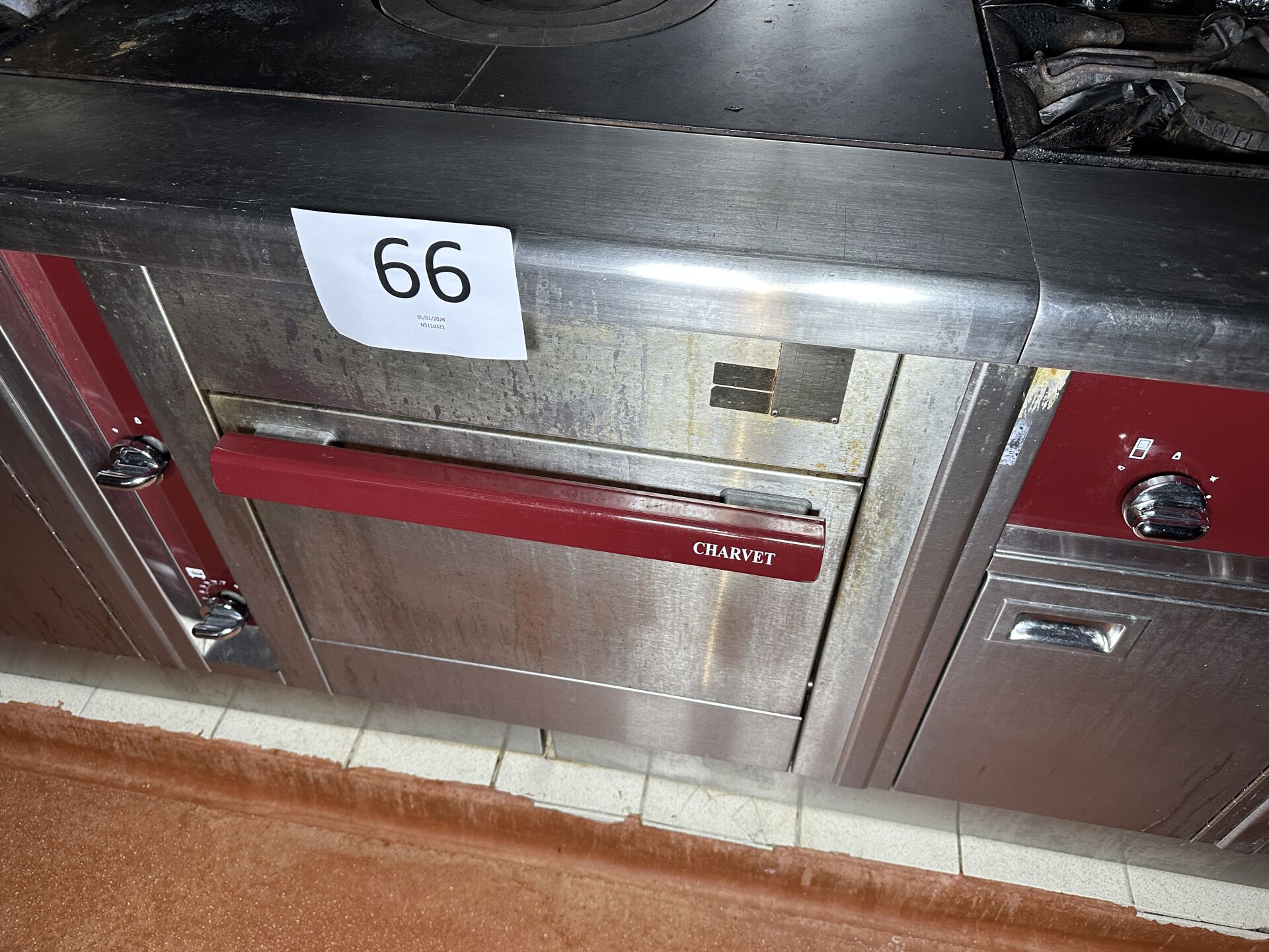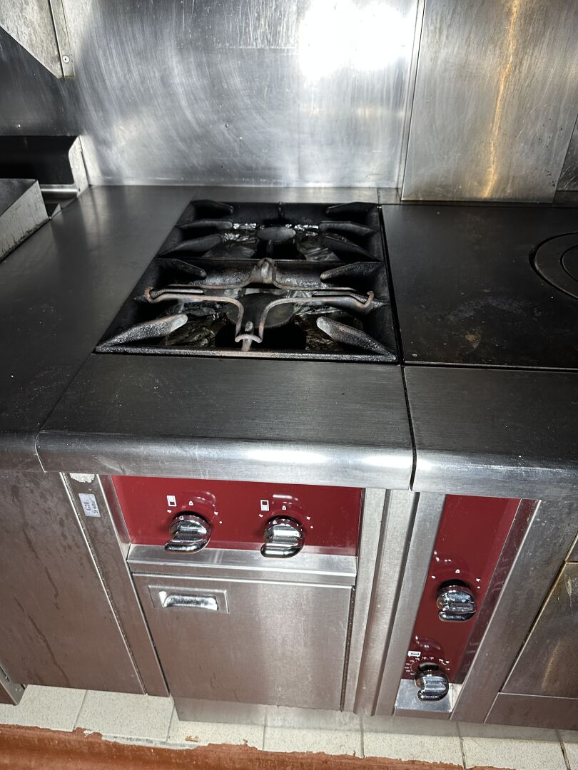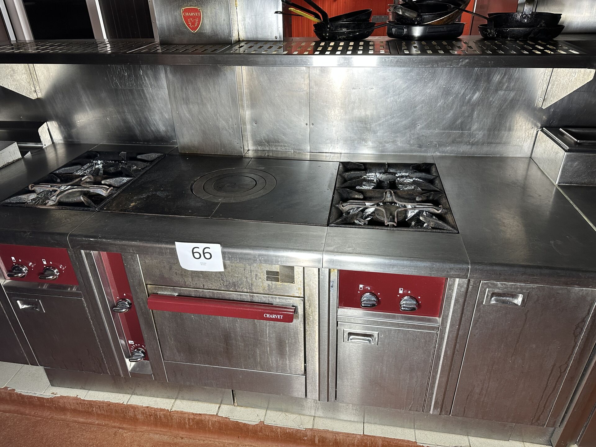 1 piano de cuisson gaz inox CHARVET ref. PRO900G1PL, avec 4 feux vifs, 1 plaque coupe-feu, 1 four et 2 portes en partie basse 240 x 90 cm (en 5 éléments)