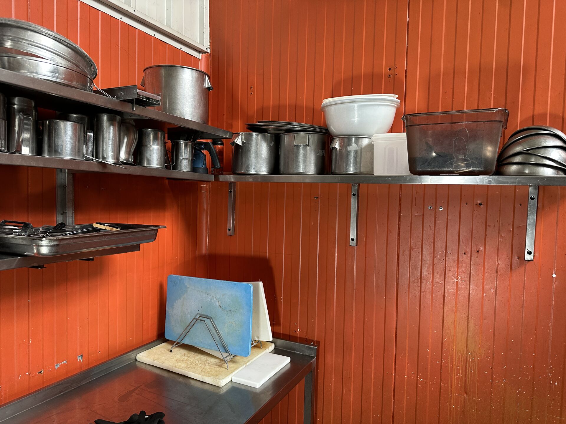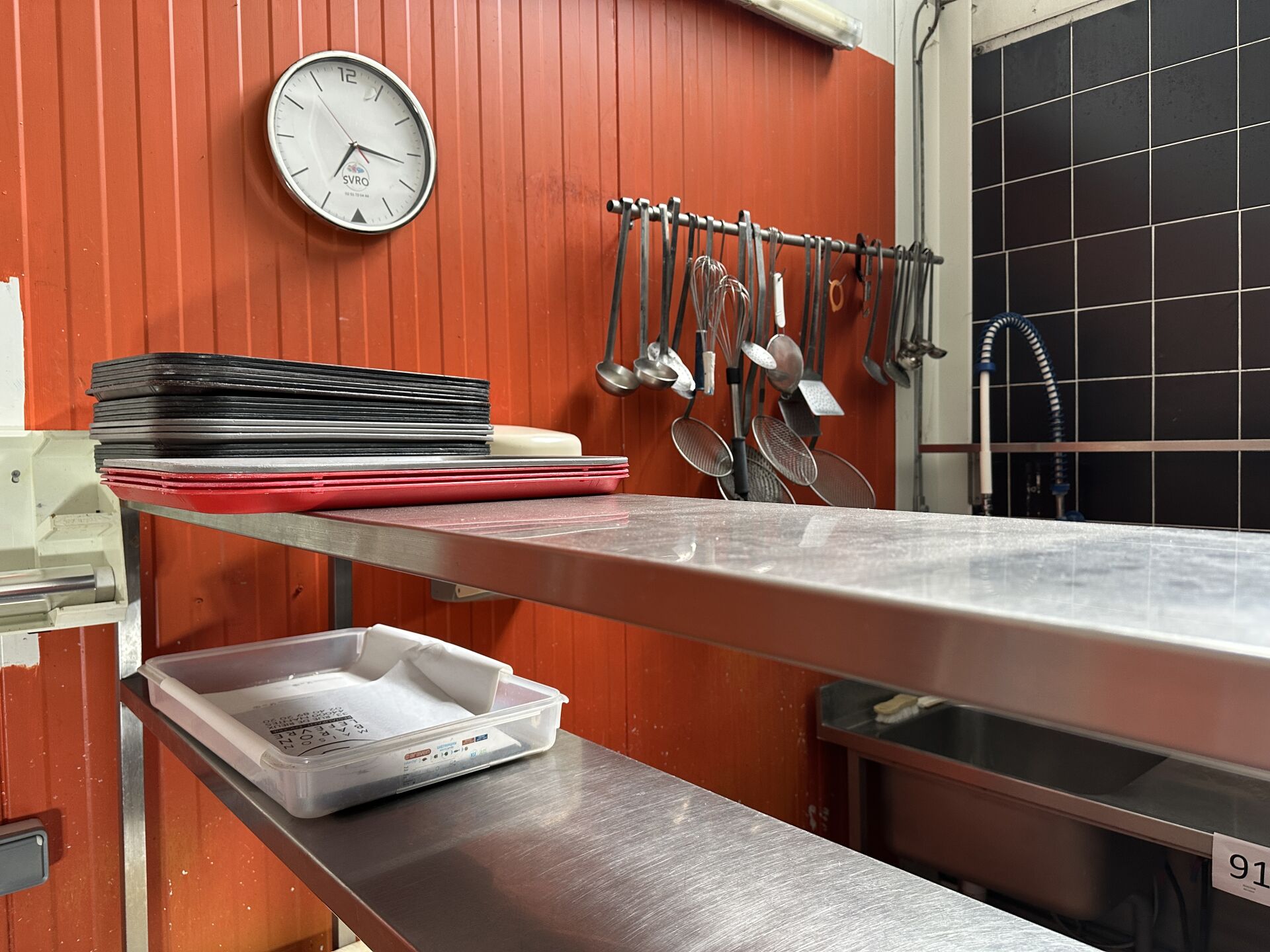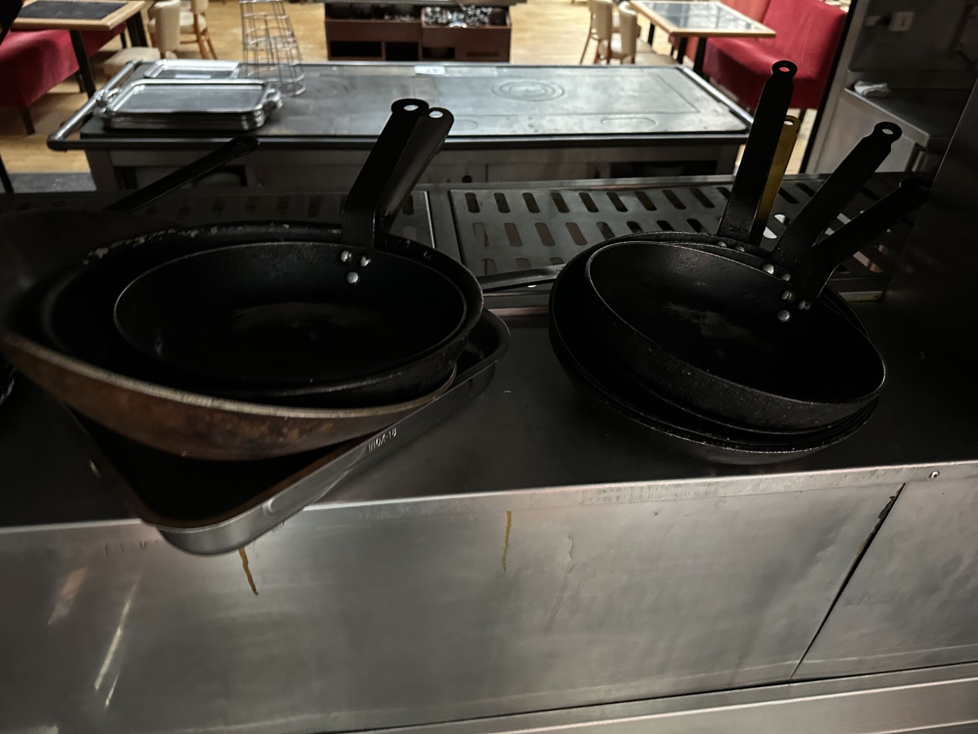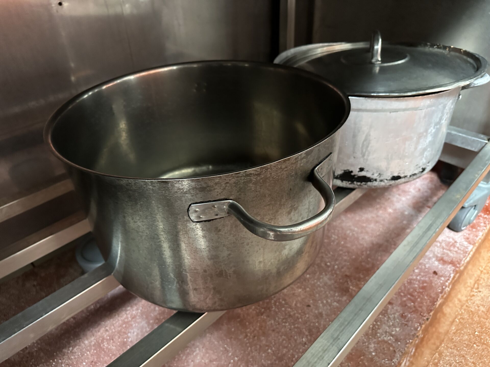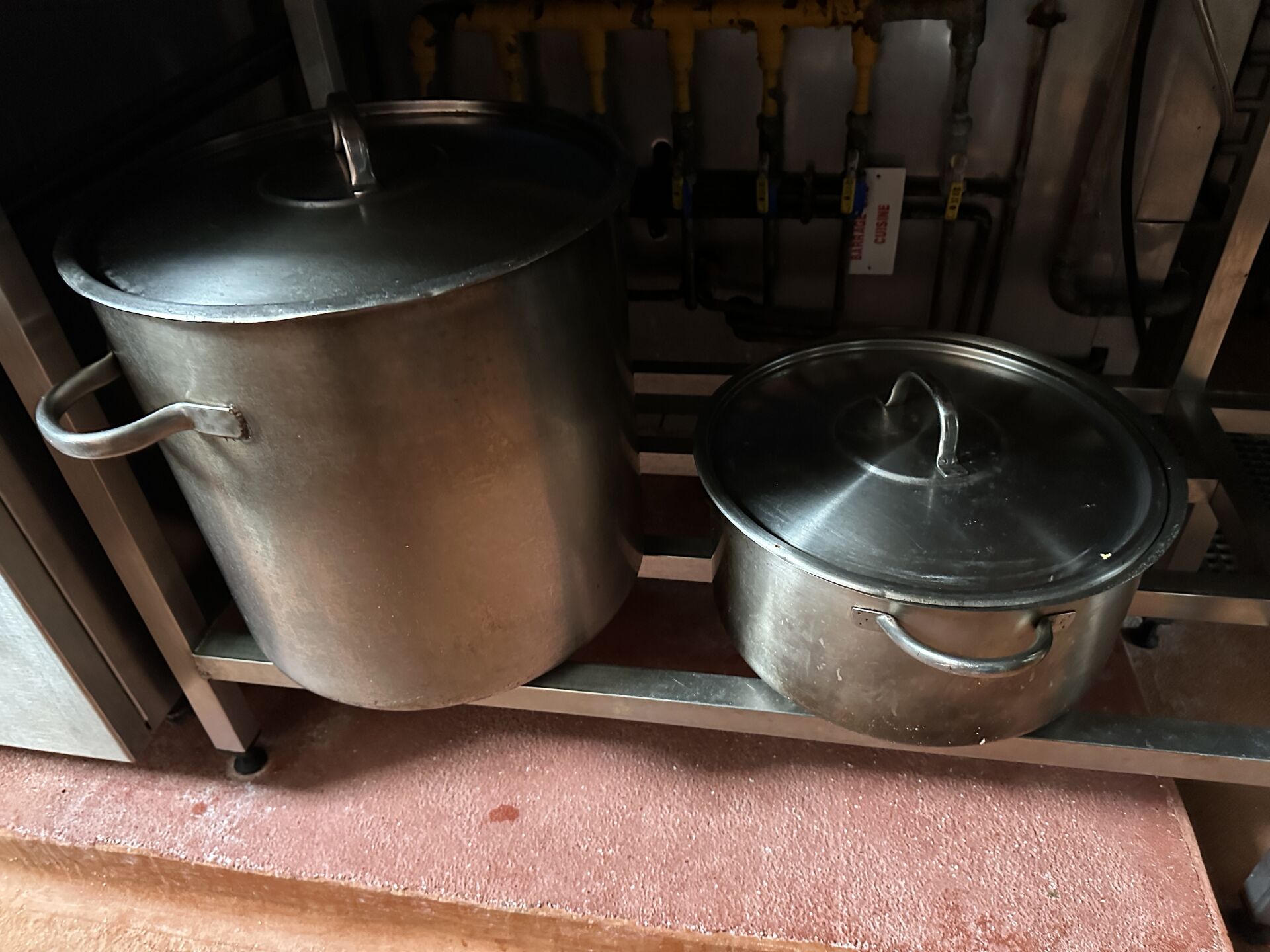 1 important lot d'ustensiles de cuisine comprenant casseroles, poêles, sauteuses, culs de poule, louches, écumoires, fouets, faitouts, etc 1 lot de plaques téflon de différentes dimensions + 25 plateaux