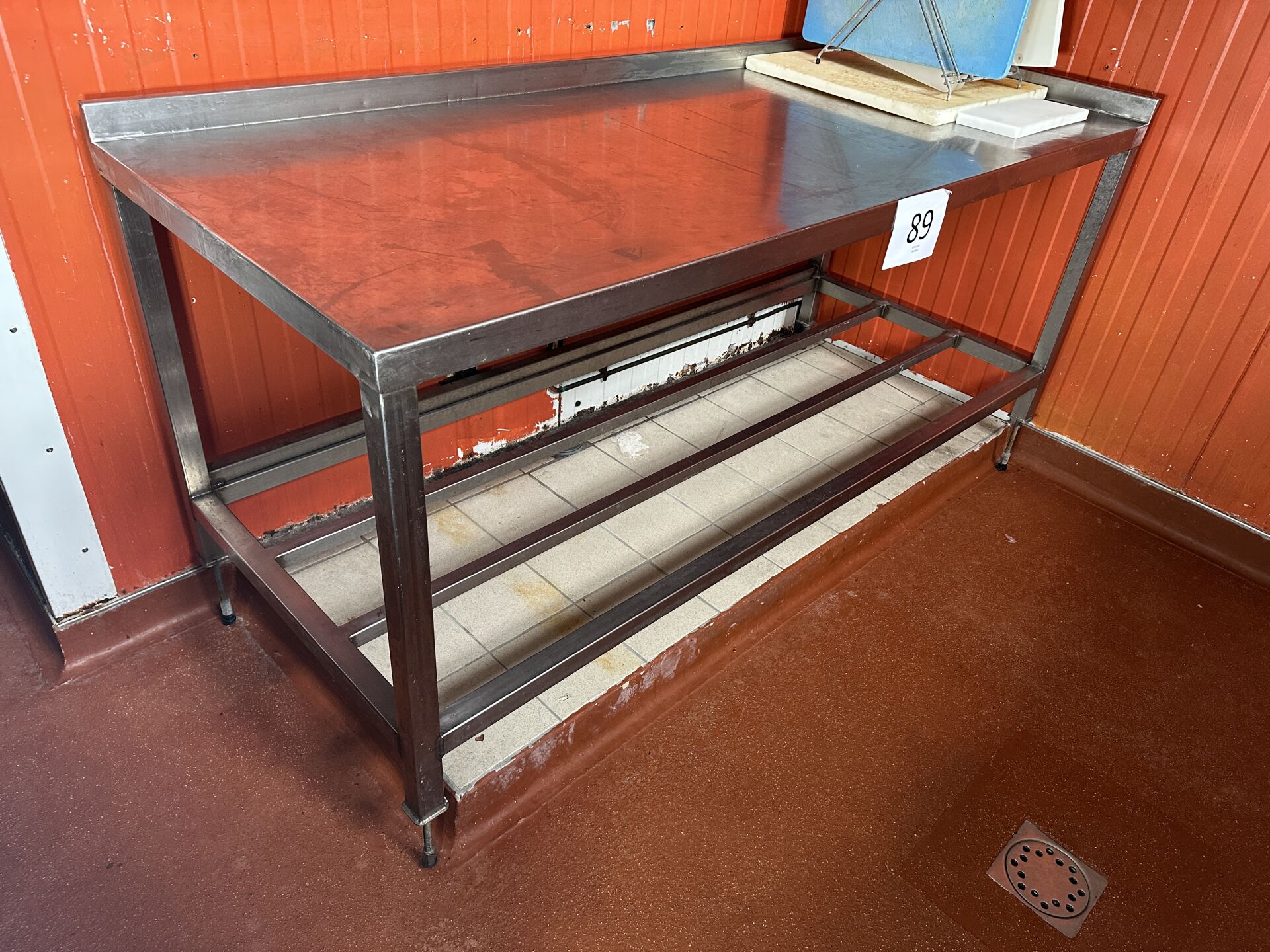 1 table de travail inox à 2 dosserets et plateau d'entrejambe, 182x75cm