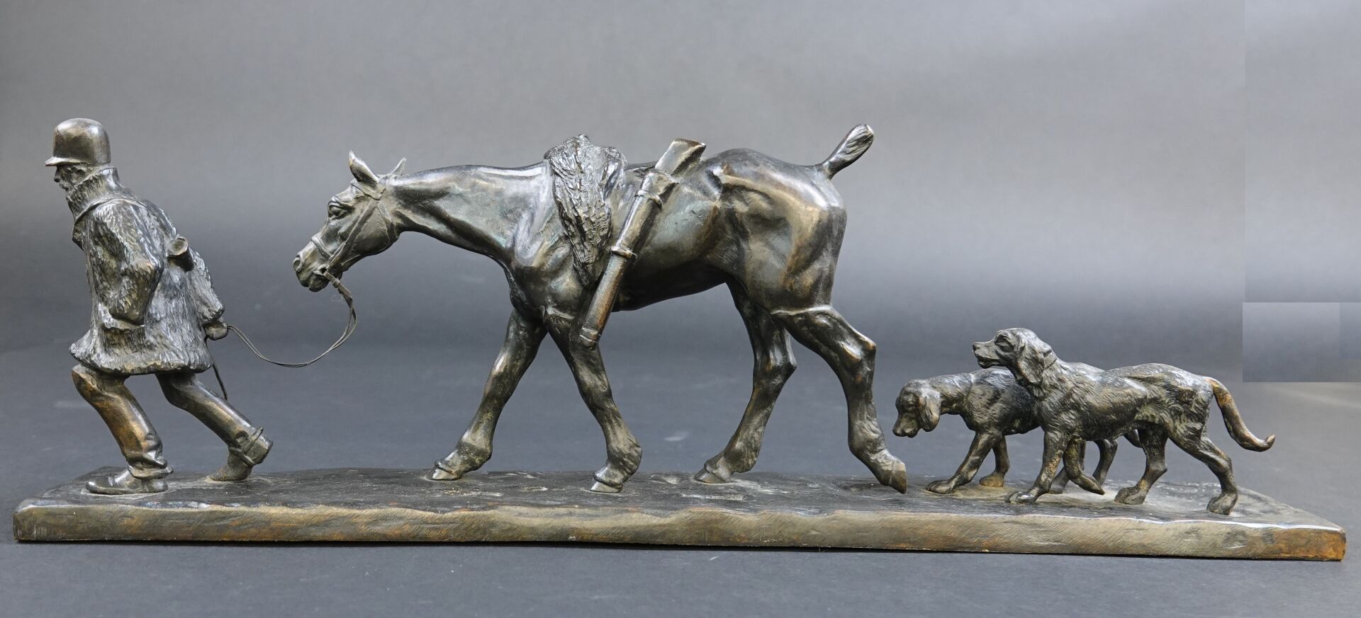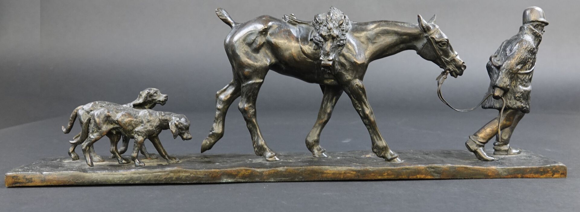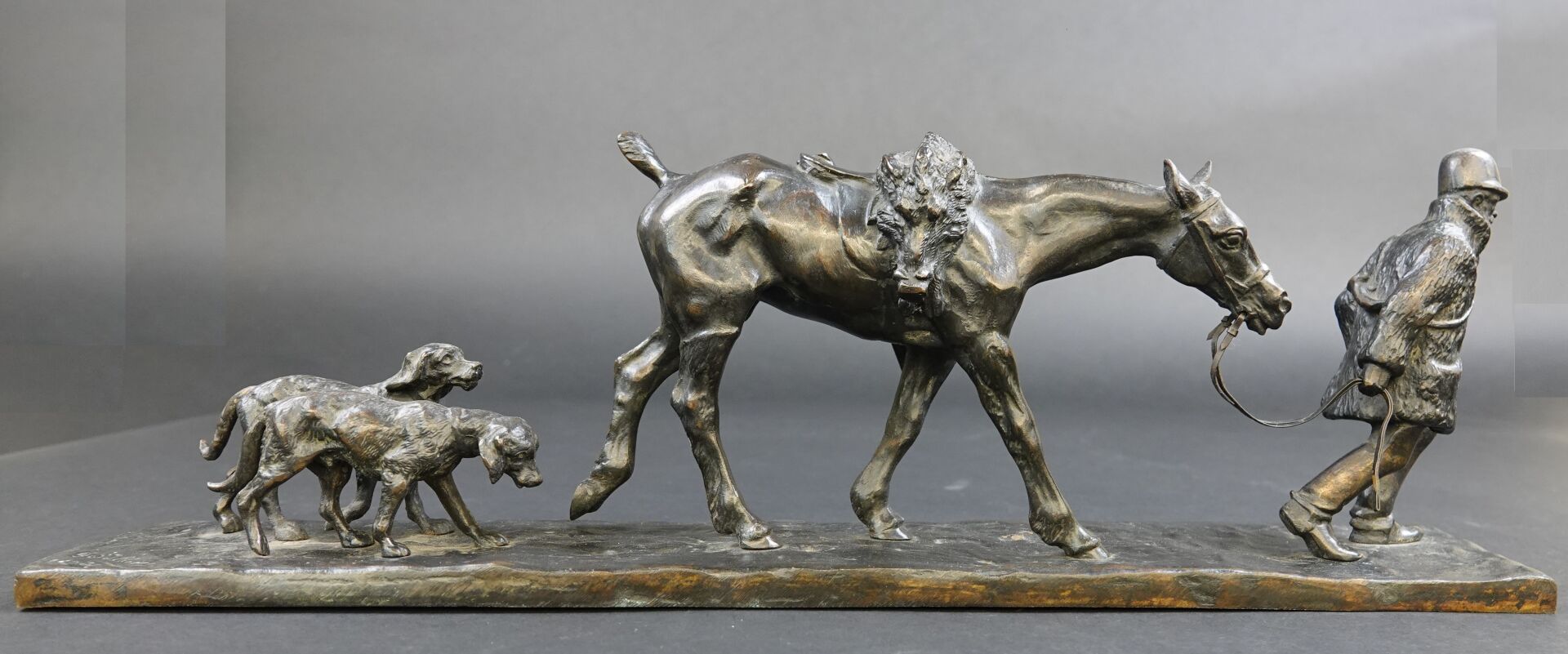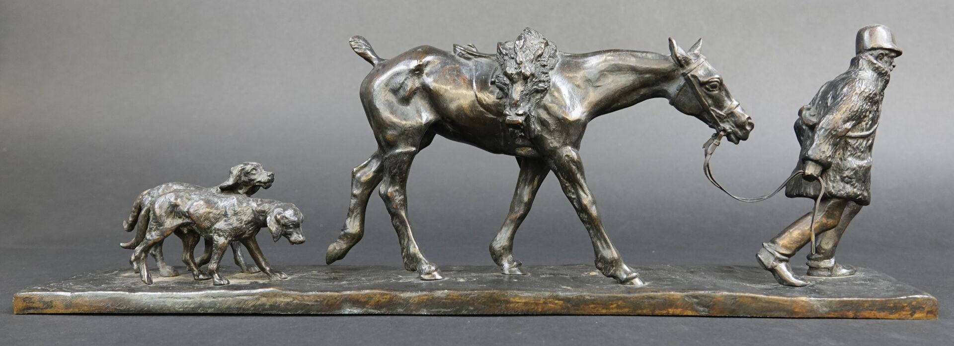 Gaston d'ILLIERS (1876-1932). Retour de chasse, dit aussi Au bon vieux temps. Bronze à patine brune signé « G. d'Illiers » et daté 1926 sur la terrasse (quelques usures à la patine). Haut. : 15 cm - Larg. : 47 cm - Prof. : 8 cm Passionné de chevaux et de sculpture Gaston d'Illiers se forma auprès du sculpteur le Comte de Ruillé. Ses participations au Salon des artistes français de 1899 à 1930 furent un succès. Chasseur invétéré il représente ici une scène qu'il a dû observer avec une précision de naturaliste. Créée en 1926 cette sculpture a été présentée par l'artiste au Salon des artistes français de 1927. Un exemplaire de ce bronze est conservé au Musée de la chasse de Gien. Bibliographie : Guy de Labretoigne, Ludovic de Villele, Gaston d'Illiers : Catalogue raisonné, Editions Grandvaux, modèle reproduit sous le n° 158 p. 128.
