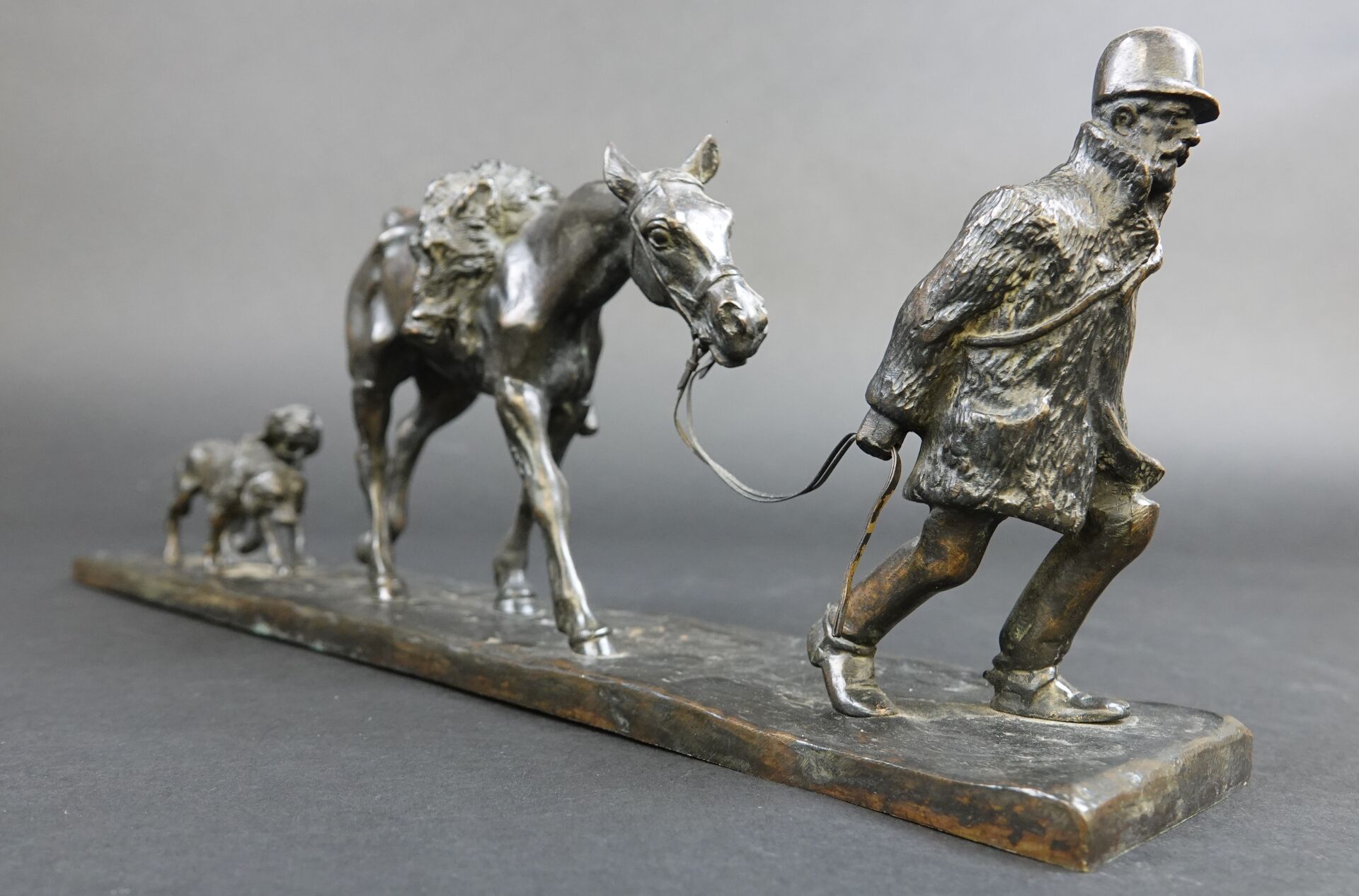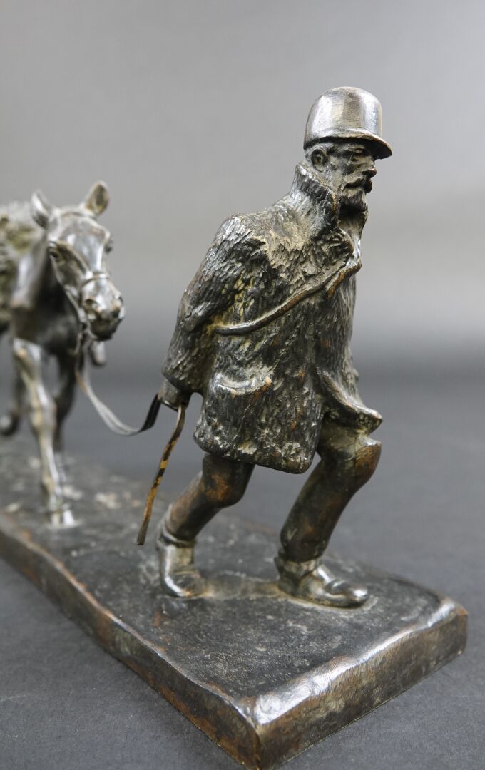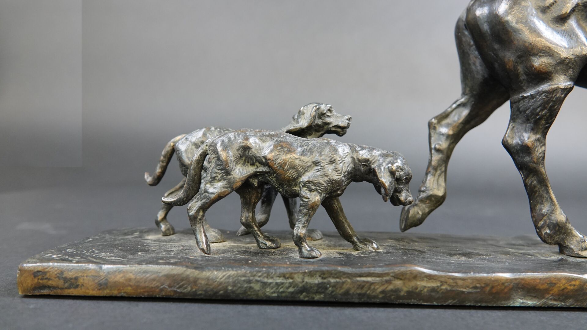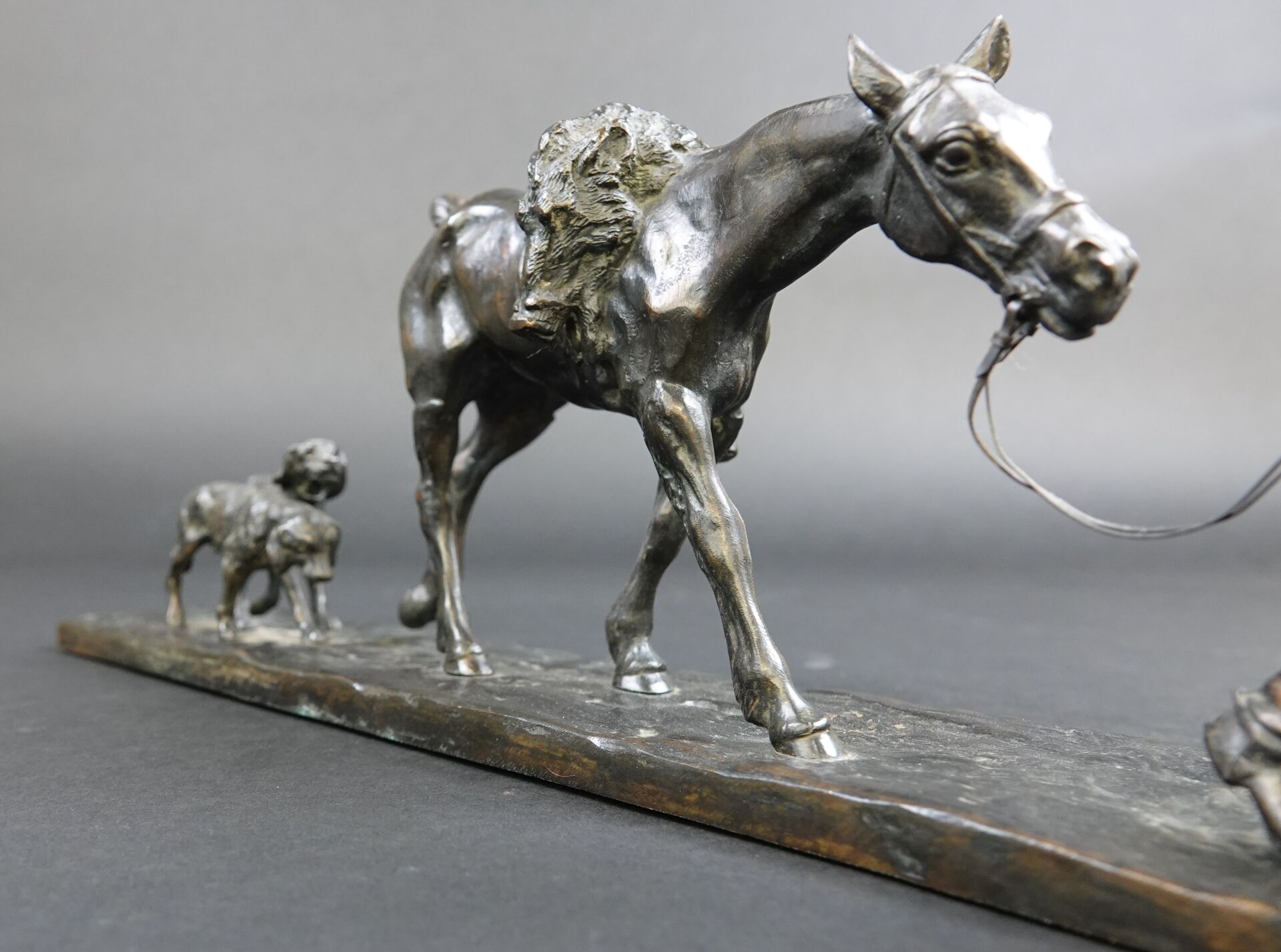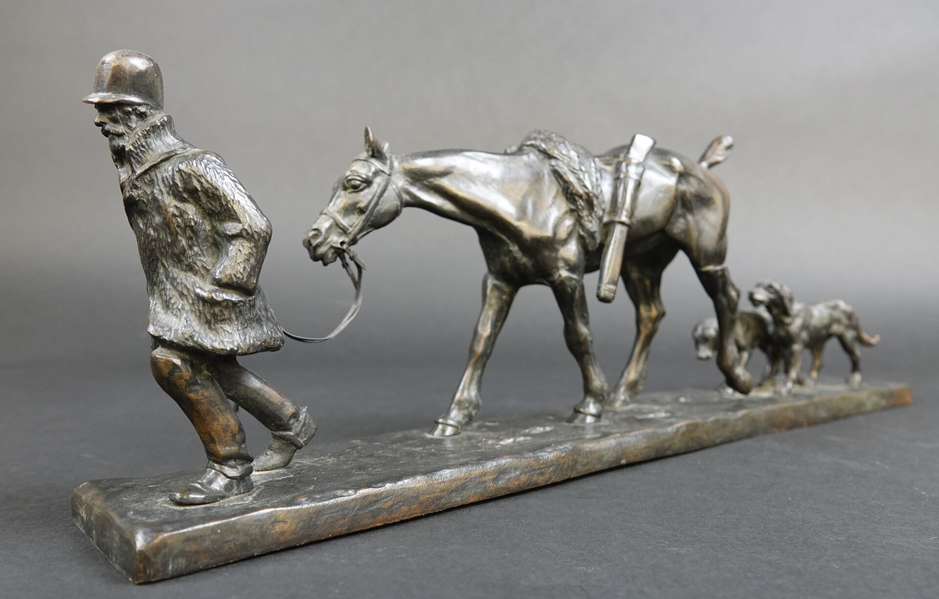 Gaston d'ILLIERS (1876-1932). Retour de chasse, dit aussi Au bon vieux temps. Bronze à patine brune signé « G. d'Illiers » et daté 1926 sur la terrasse (quelques usures à la patine). Haut. : 15 cm - Larg. : 47 cm - Prof. : 8 cm Passionné de chevaux et de sculpture Gaston d'Illiers se forma auprès du sculpteur le Comte de Ruillé. Ses participations au Salon des artistes français de 1899 à 1930 furent un succès. Chasseur invétéré il représente ici une scène qu'il a dû observer avec une précision de naturaliste. Créée en 1926 cette sculpture a été présentée par l'artiste au Salon des artistes français de 1927. Un exemplaire de ce bronze est conservé au Musée de la chasse de Gien. Bibliographie : Guy de Labretoigne, Ludovic de Villele, Gaston d'Illiers : Catalogue raisonné, Editions Grandvaux, modèle reproduit sous le n° 158 p. 128.