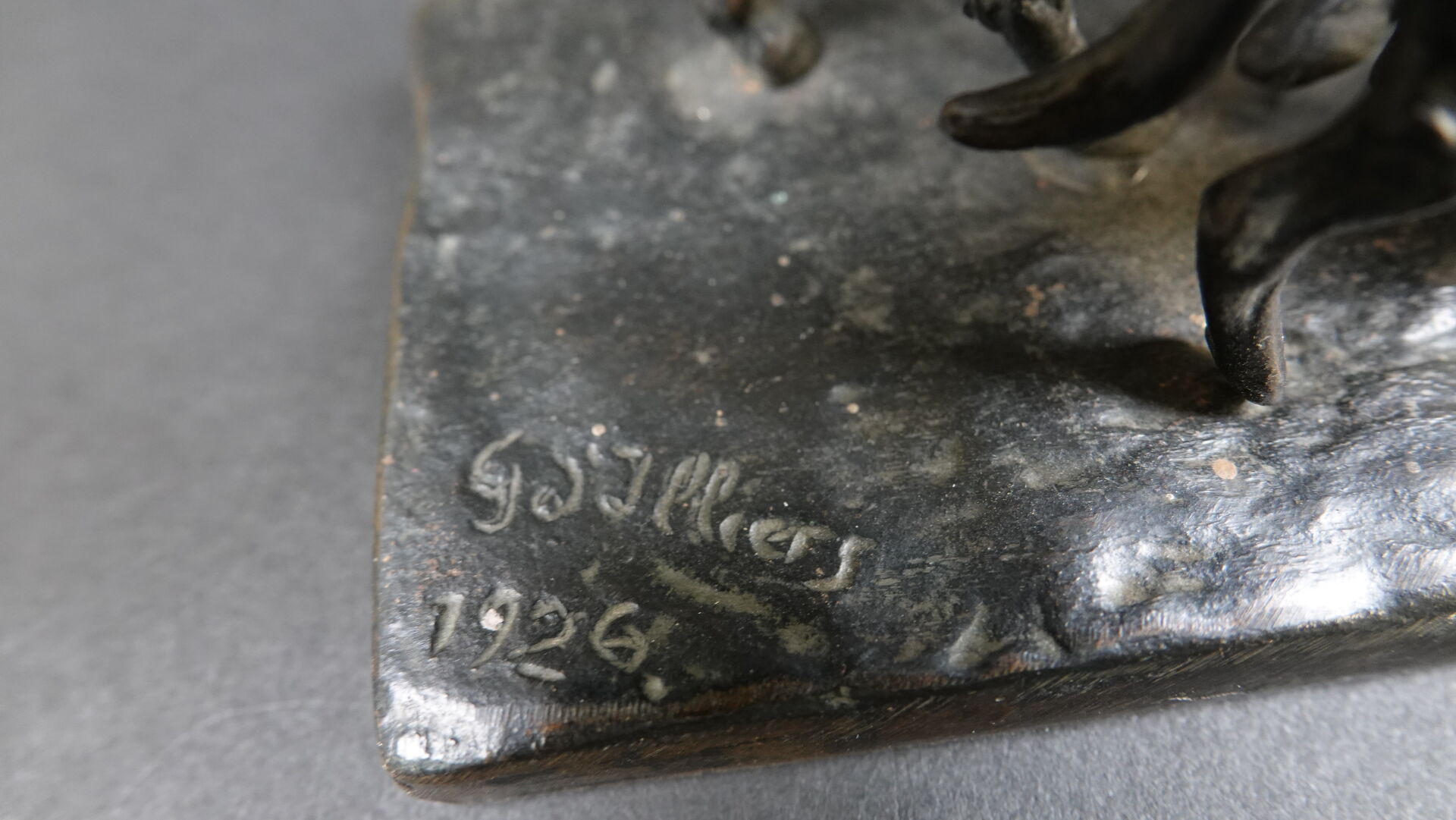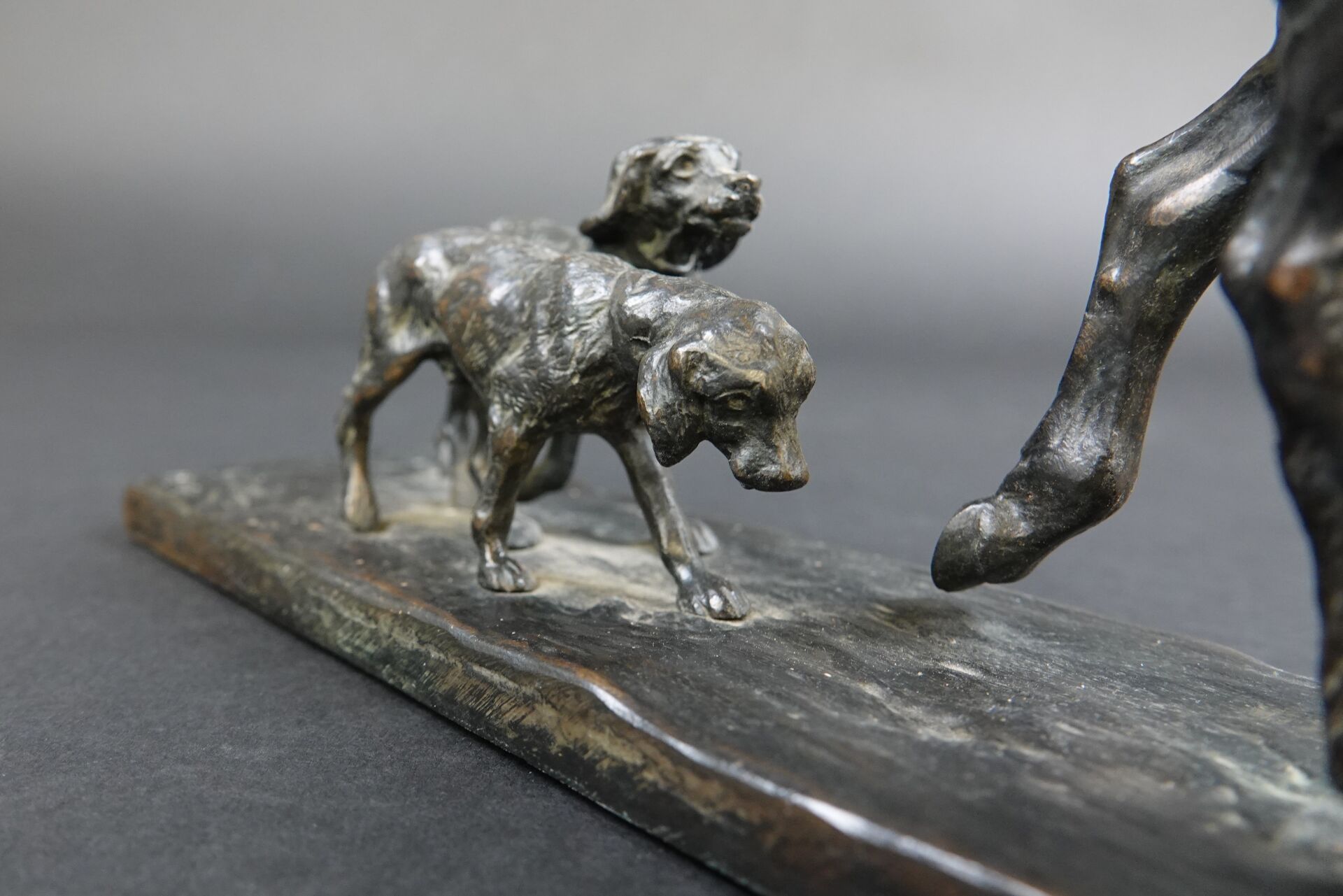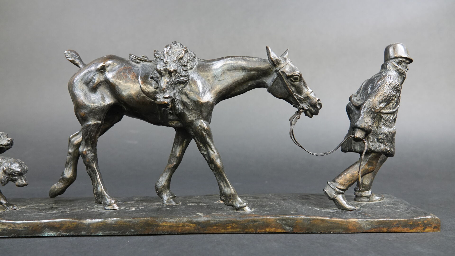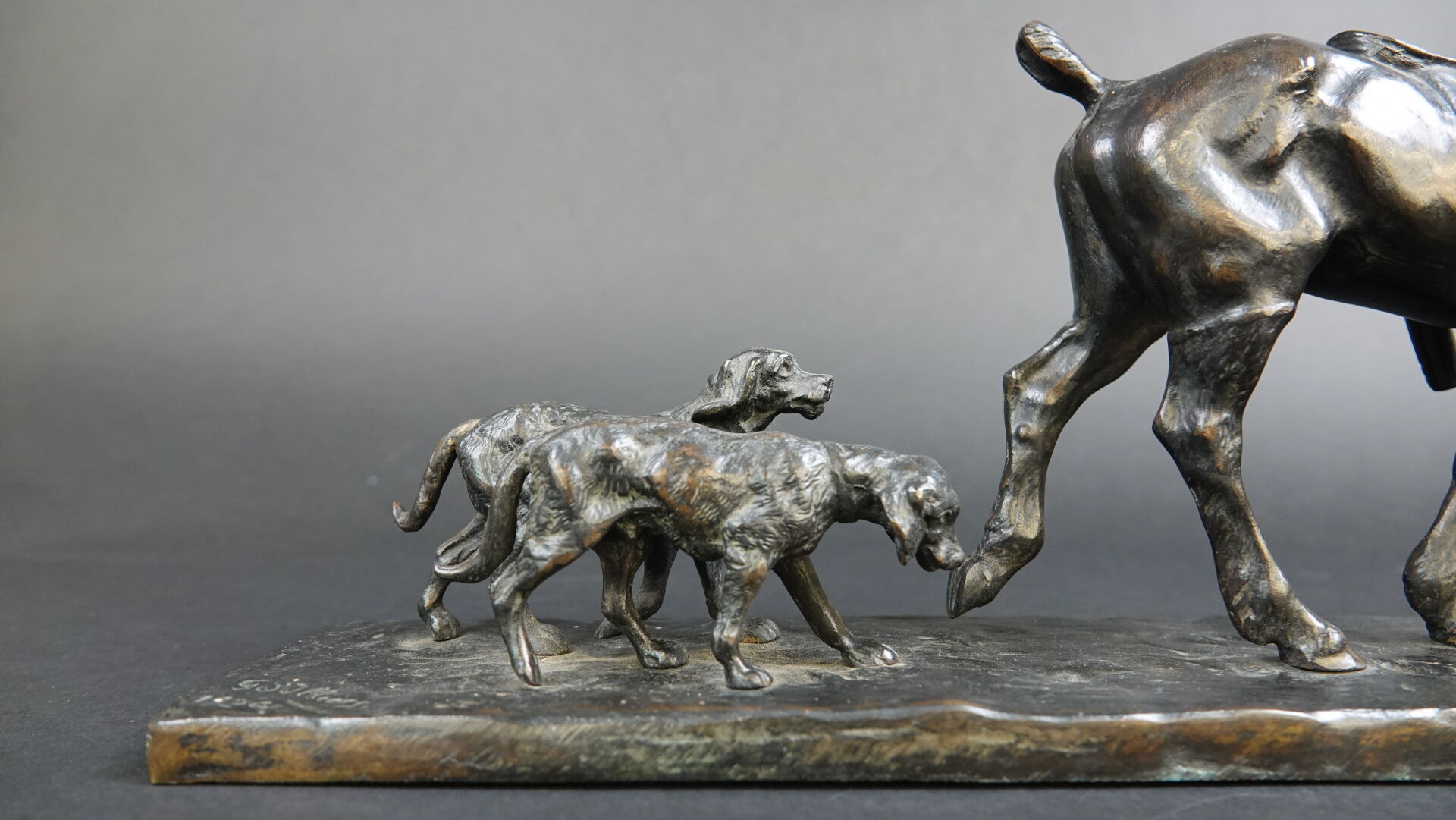Gaston d'ILLIERS (1876-1932). Retour de chasse, dit aussi Au bon vieux temps. Bronze à patine brune signé « G. d'Illiers » et daté 1926 sur la terrasse (quelques usures à la patine). Haut. : 15 cm - Larg. : 47 cm - Prof. : 8 cm Passionné de chevaux et de sculpture Gaston d'Illiers se forma auprès du sculpteur le Comte de Ruillé. Ses participations au Salon des artistes français de 1899 à 1930 furent un succès. Chasseur invétéré il représente ici une scène qu'il a dû observer avec une précision de naturaliste. Créée en 1926 cette sculpture a été présentée par l'artiste au Salon des artistes français de 1927. Un exemplaire de ce bronze est conservé au Musée de la chasse de Gien. Bibliographie : Guy de Labretoigne, Ludovic de Villele, Gaston d'Illiers : Catalogue raisonné, Editions Grandvaux, modèle reproduit sous le n° 158 p. 128.