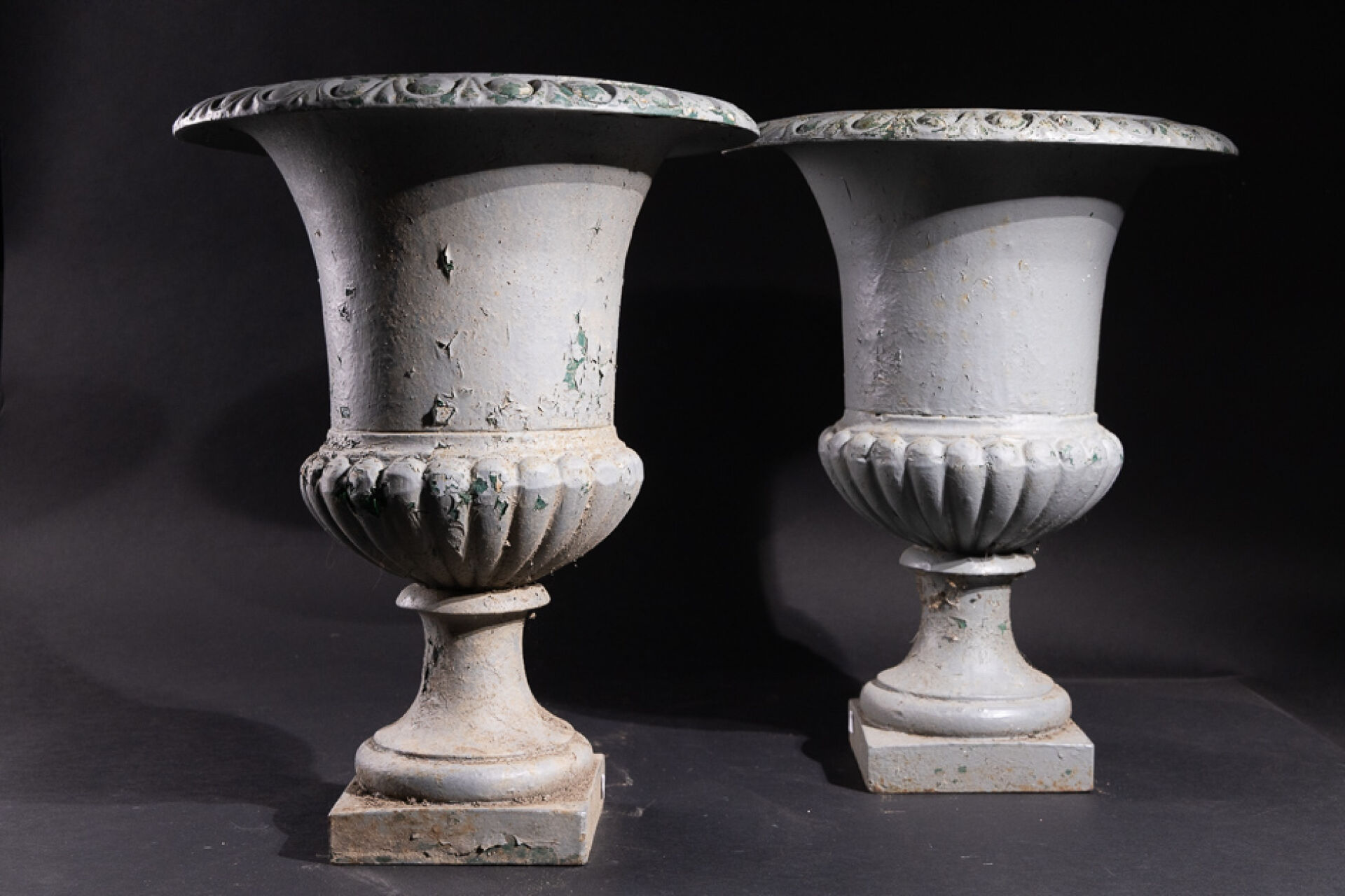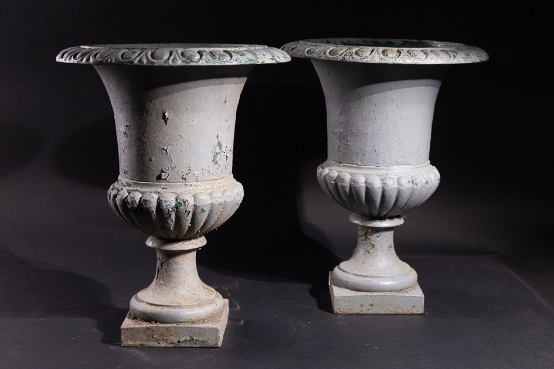 Paire de vases Médicis en fonte relaquée gris (anciennement vert), le culot godronné, le col à frises d'oves. XXe siècle. Haut. : 47 cm - Diam. : 36 cm