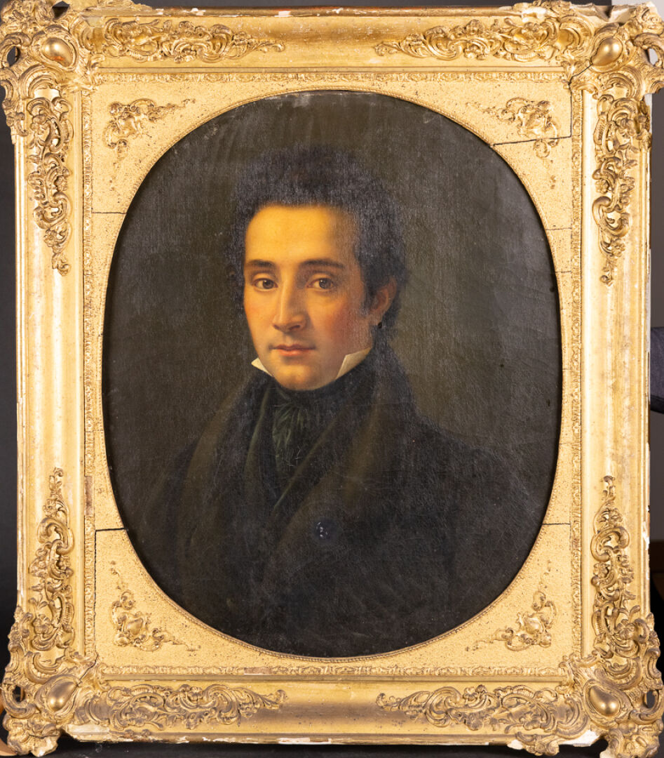 École française vers 1840. Portrait présumé de Monsieur Casimir François Joseph COURET, de profil, en vêtements noirs. Huile sur toile, dans un cadre à vue ovale (réseau de craquelures, salissures, petits accidents et restaurations). Haut. : 66 cm - Larg. : 54,5 cm