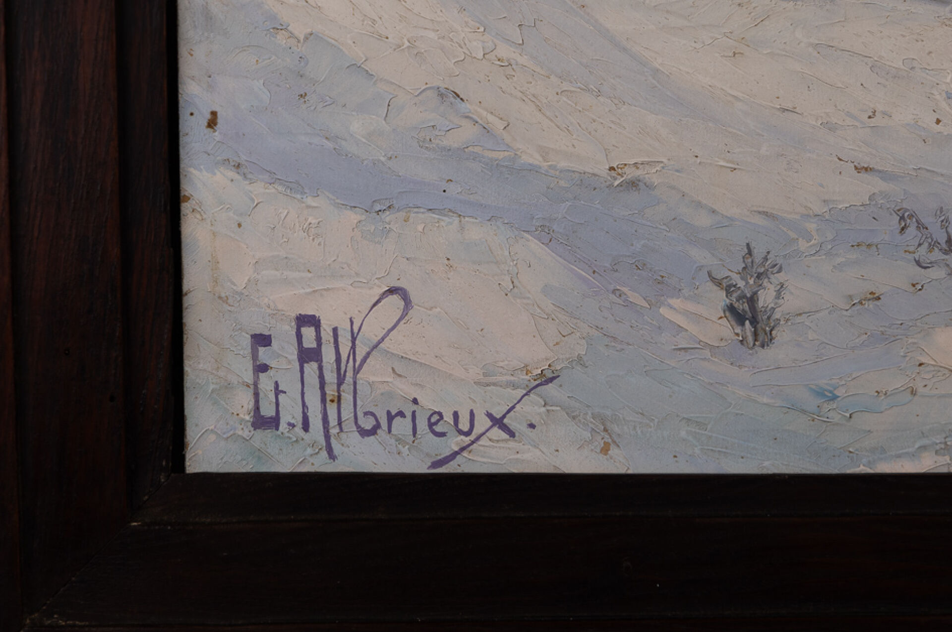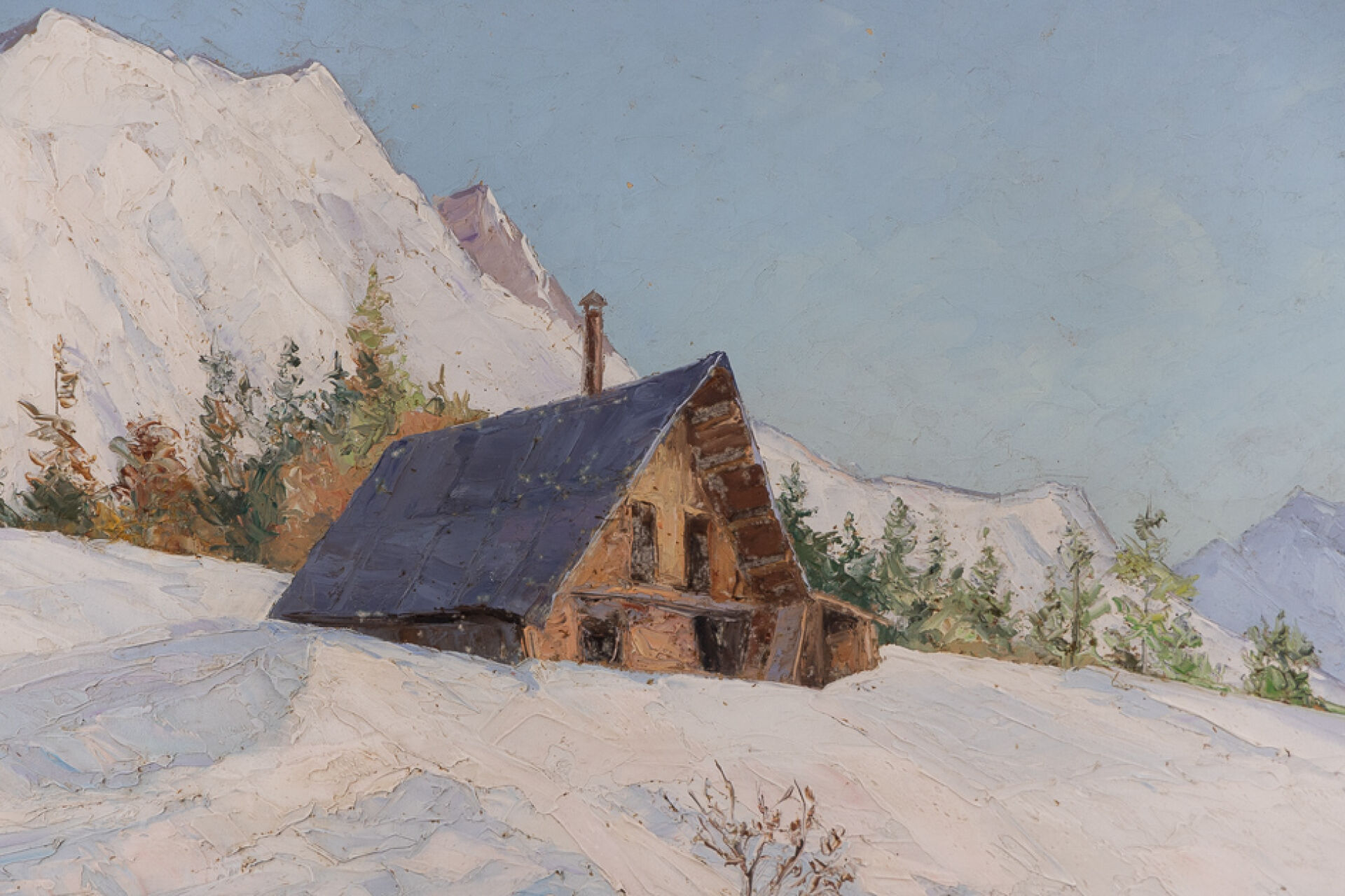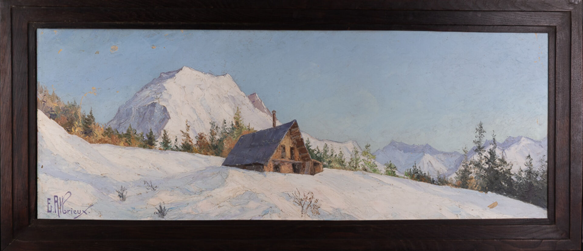 Étienne ALBRIEUX (1891-1962). "Chalet de Malatrait - Le Grand Charnier" Huile sur carton, signée en bas à gauche (petits manques). Haut. : 40 cm -Larg. : 105 cm Provenance : Cette œuvre a été acquise directement auprès de l'artiste. Natif d'Annecy Etienne Albrieux se forme aux Beaux-Arts de Lyon auprès de Tony Tollet. Amoureux de la Montagne il s'installe à Saint-Pierre-d'Allevard et parcourt la vallée de Belledone et des Écrins pour peindre les majestueux paysages.