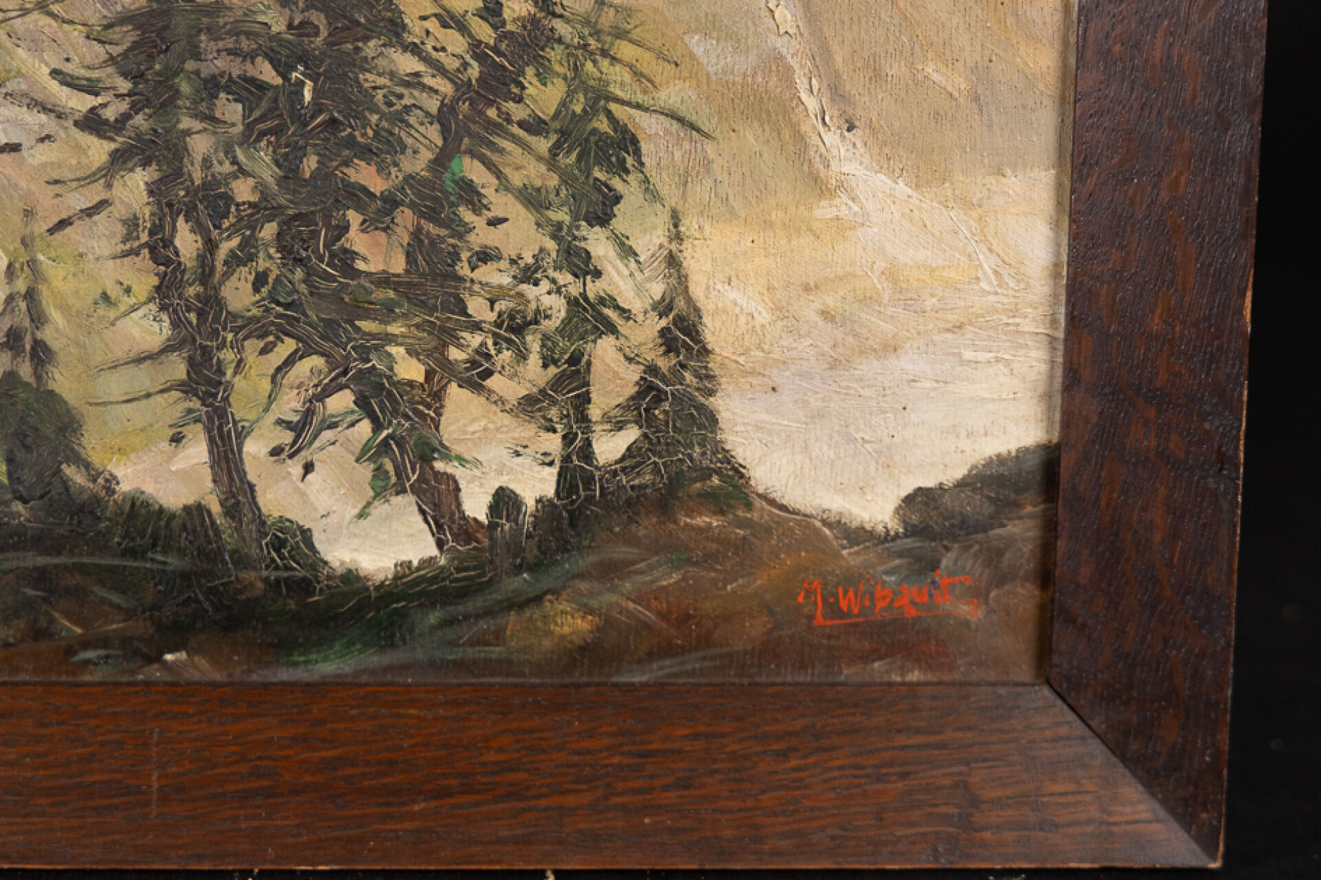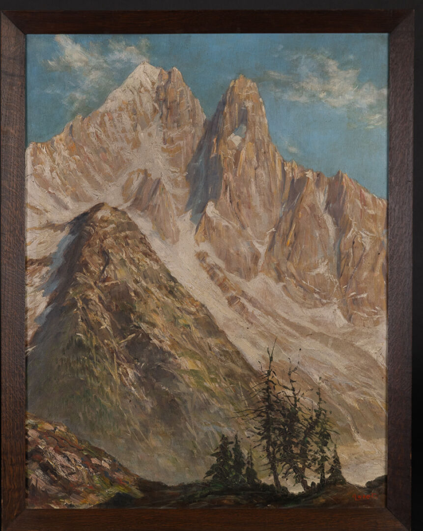 Marcel WIBAULT (1904-1998). "L'aiguille Verte [...] à Chamonix". Huile sur isorel, signée en bas à droite, titrée (en partie illisible), monogrammée et datée 1938 au dos. Haut. : 65 cm - Larg. : 50 cm Natif de Besançon Marcel Wibault s'installe à Chamonix avec son épouse en 1936. L'endroit est idéal pour ce spécialiste de la peinture de montagne notamment du Mont-blanc et de sa Vallée. Il n'est pas rare de le voir un bonnet vissé sur la tête devant son chevalet posé dans la neige en pleine action. Une exposition de son oeuvre a été organisée en 2016 à Chamonix.