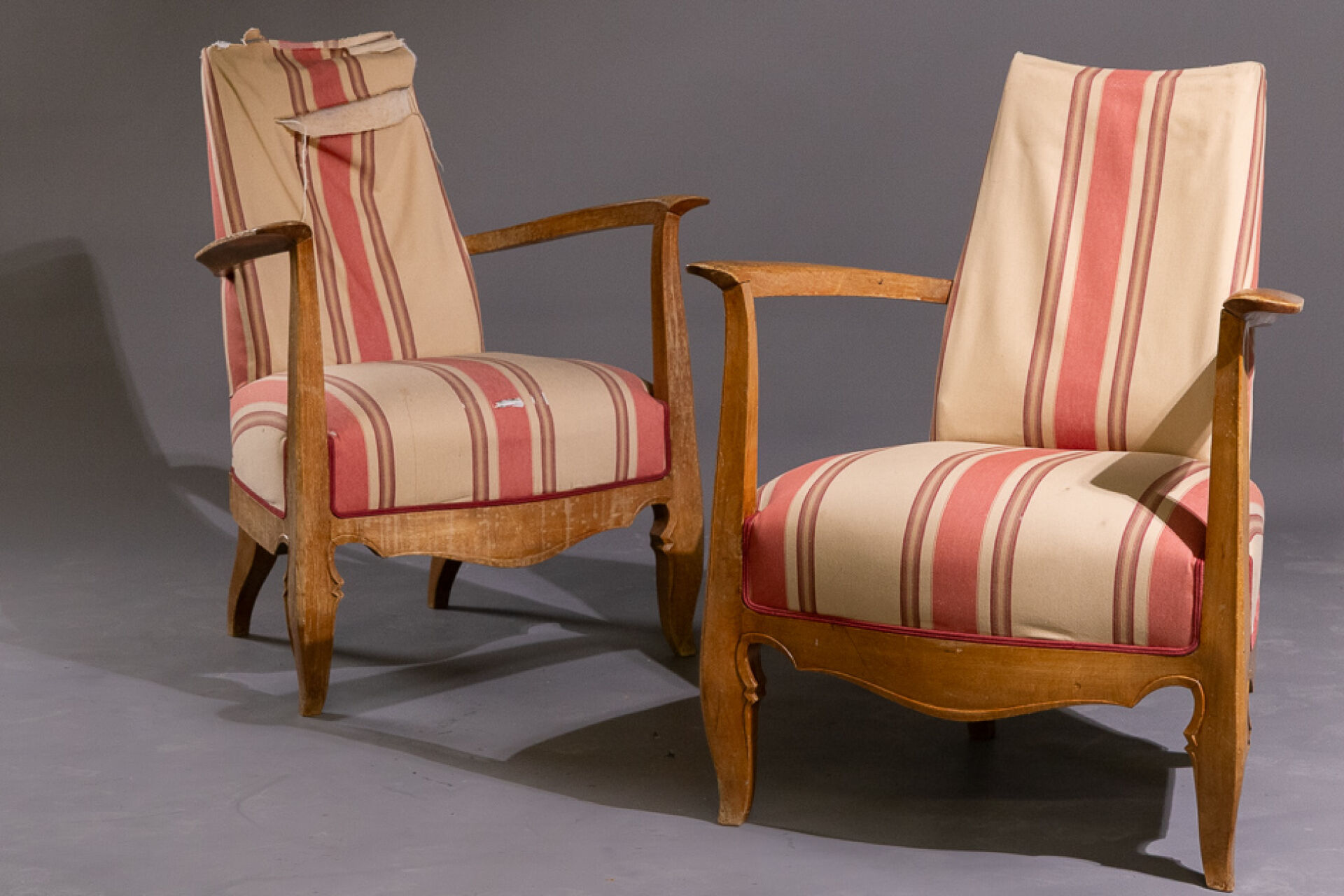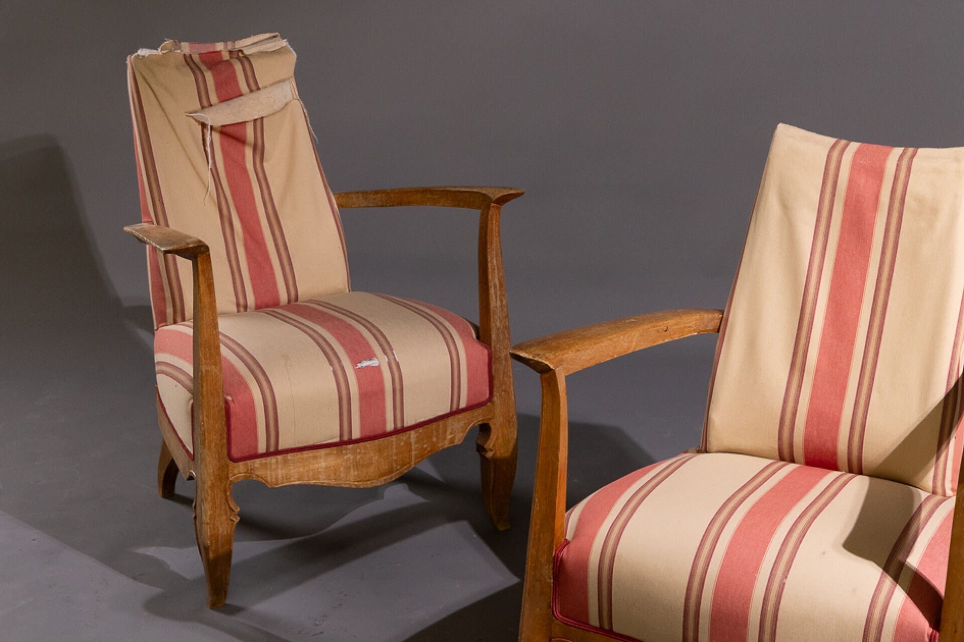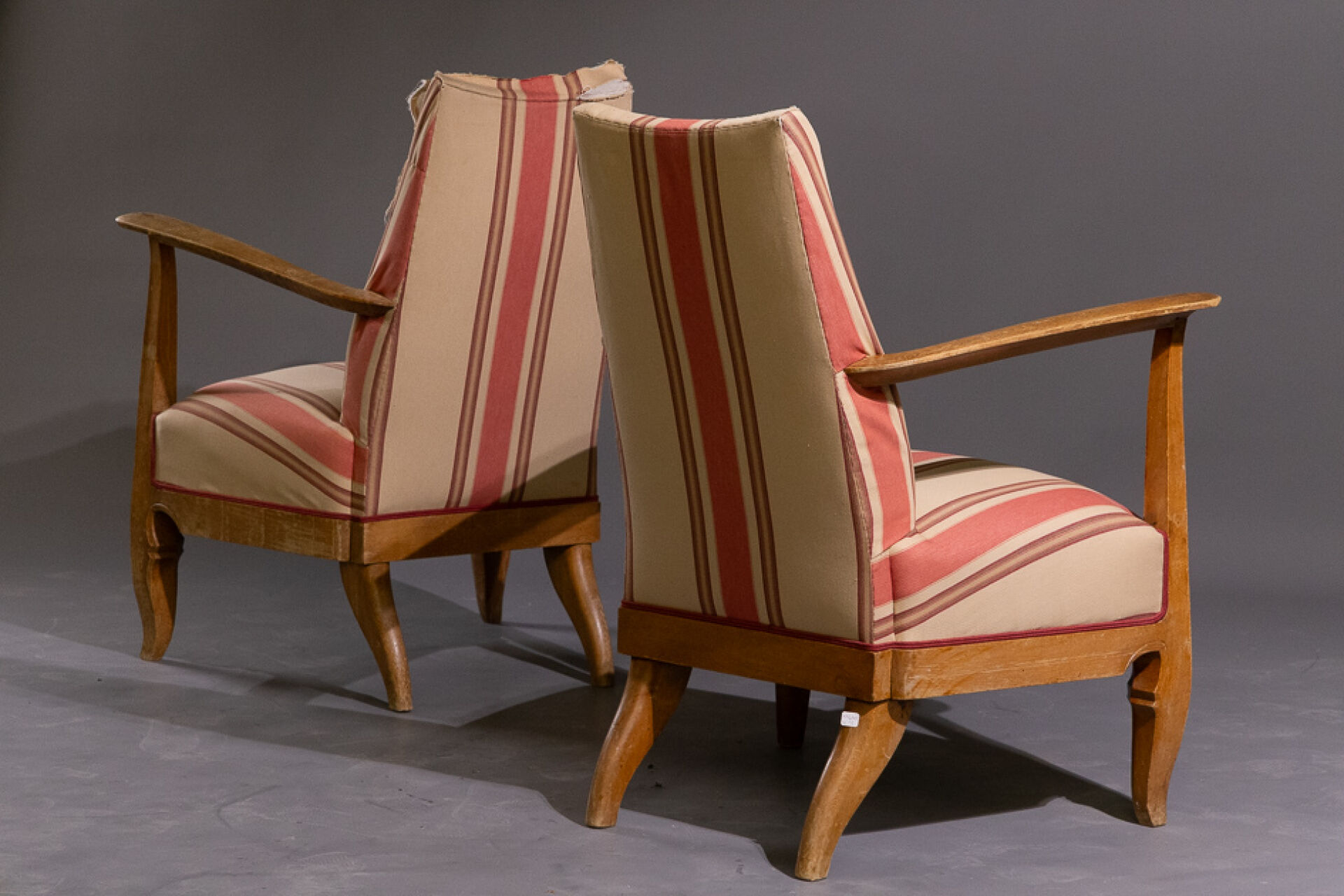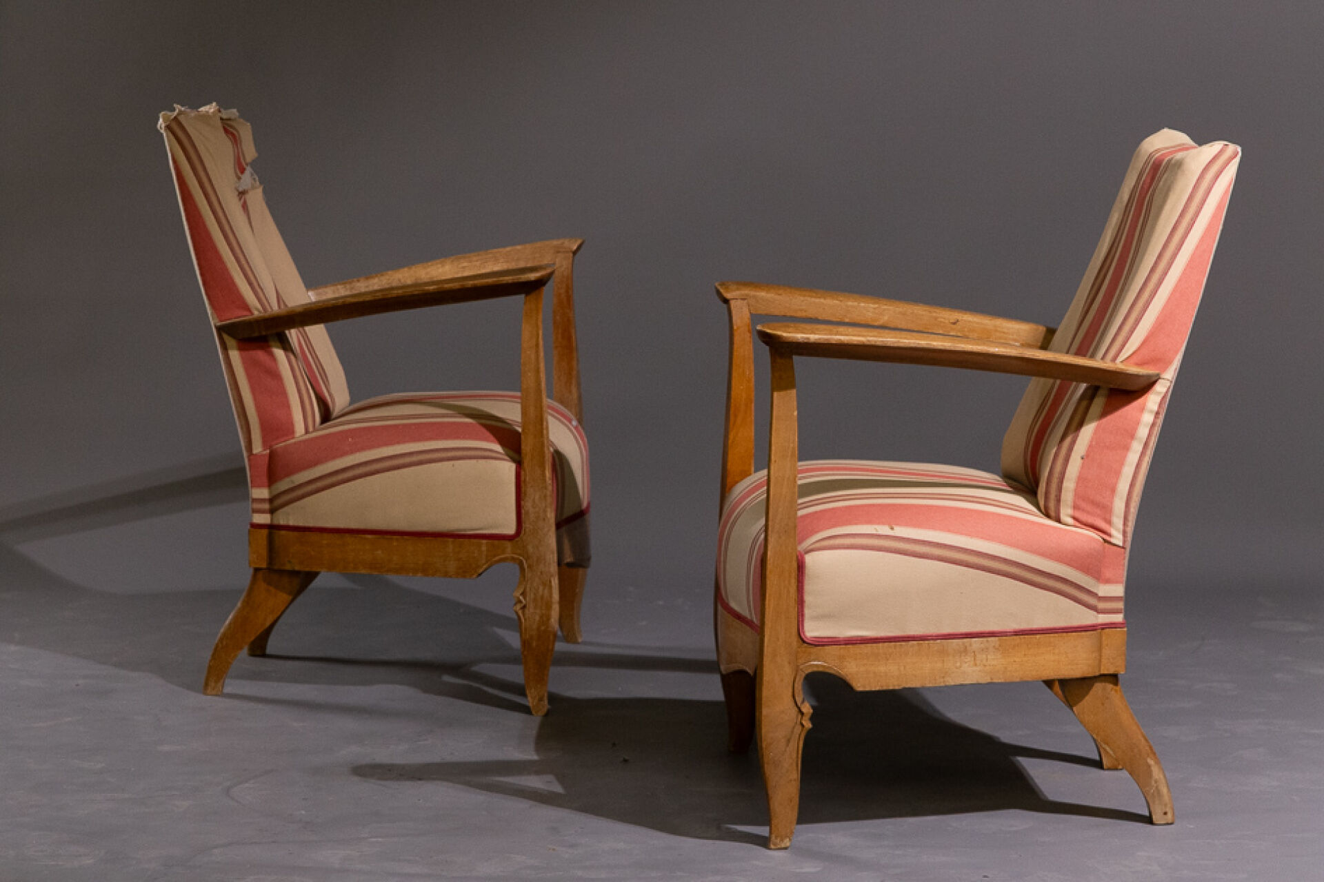 Jorj RUAL (1901-1986). Paire de fauteuils en hêtre à dossier incurvé légèrement incliné, les accotoirs plats, les pieds postérieurs incurvés, les antérieurs en jarret stylisé. Estampille en laiton (accidents et restaurations). Vers 1940. Haut. : 87 cm - Larg. : 72 cm - Prof; : 48 cm Provenance : Succession de Monsieur Georges RUAL puis par descendance.