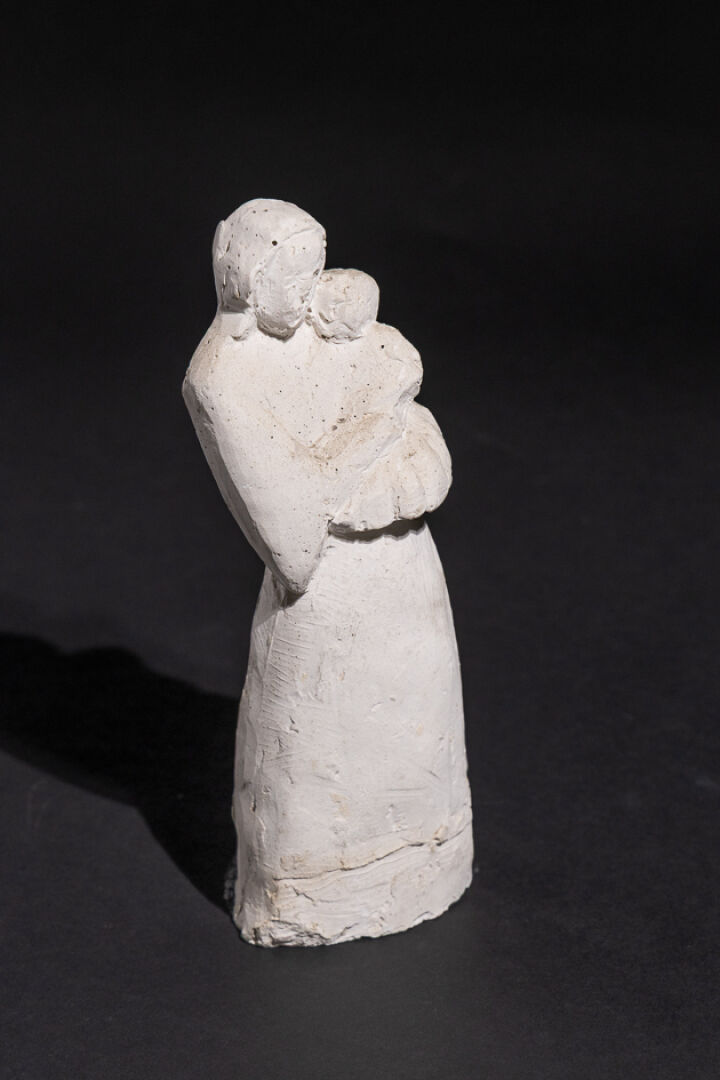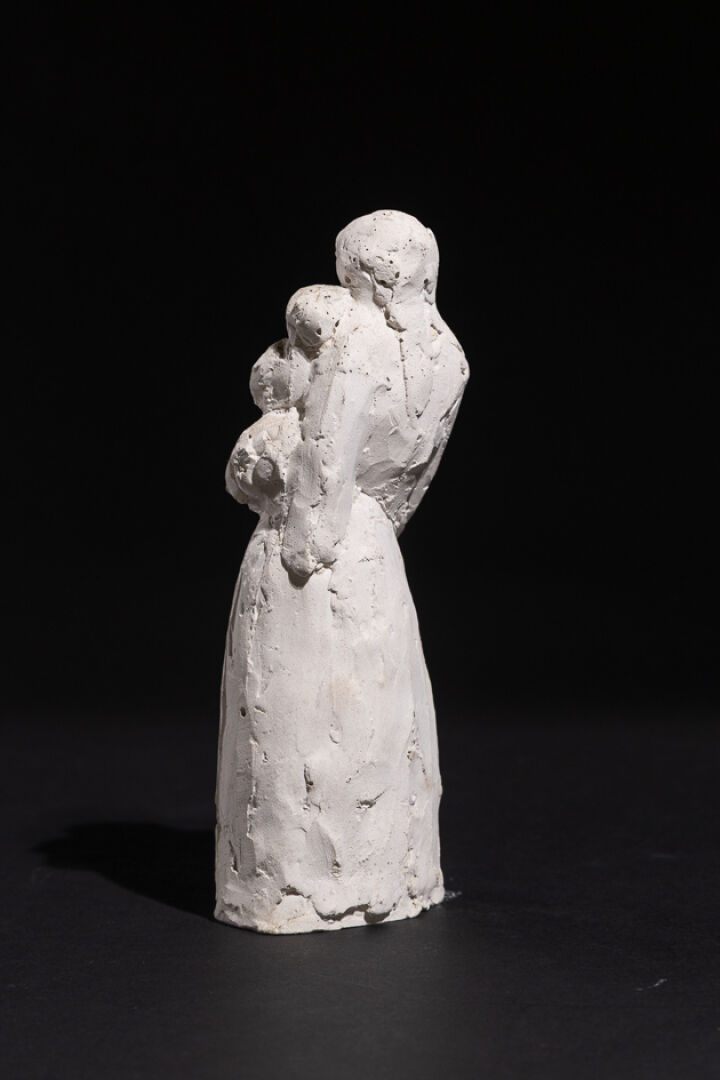 Georges ROBIN dit Jorj ROBIN (1904-1928) . Mère tenant son enfant dans les bras. Sujet en plâtre, signé sous la base. Haut. : 21 cm Provenance : Salon des Peintres de la Bretagne organisé par l'Union Artistique de Quimper du 25 juillet au 13 août 1937. Collection d'Auguste TUSET, médecin et sculpteur, ami de ROBIN. Rentré à 14 ans aux Beaux Arts de Nantes, Robin est l'élève de Jean Boucher, grand maître de la statuaire. Passionné de politique de Bretagne il devient membre du Parti autonomiste breton à Paris - avec Jeanne Malivel et les époux Creston, il participe à la création du mouvement Seiz Breur. Mort prématurément il laisse une œuvre d'environ vingt-cinq sculptures - notre modèle aurait inspiré l'édition d'une faïence de Quimper : "La dame au chat".