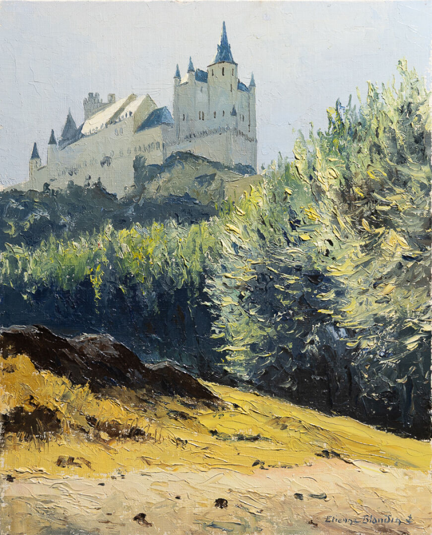 Étienne BLANDIN (1903-1991). Paysage de l'Alcazar de Ségovie. Huile sur toile, signée en bas à droite, située au revers. Haut. : 41 cm - Larg. : 33 cm