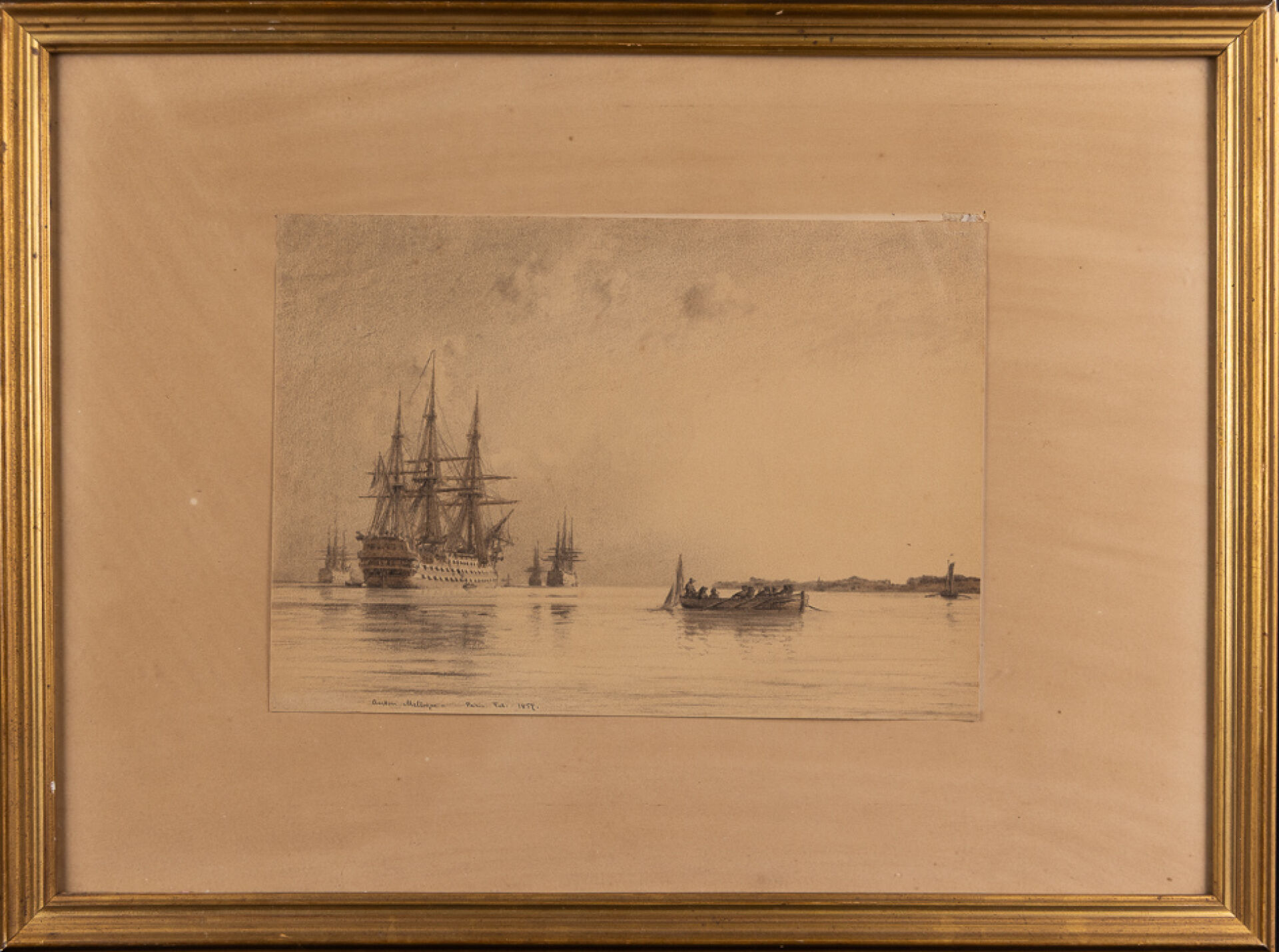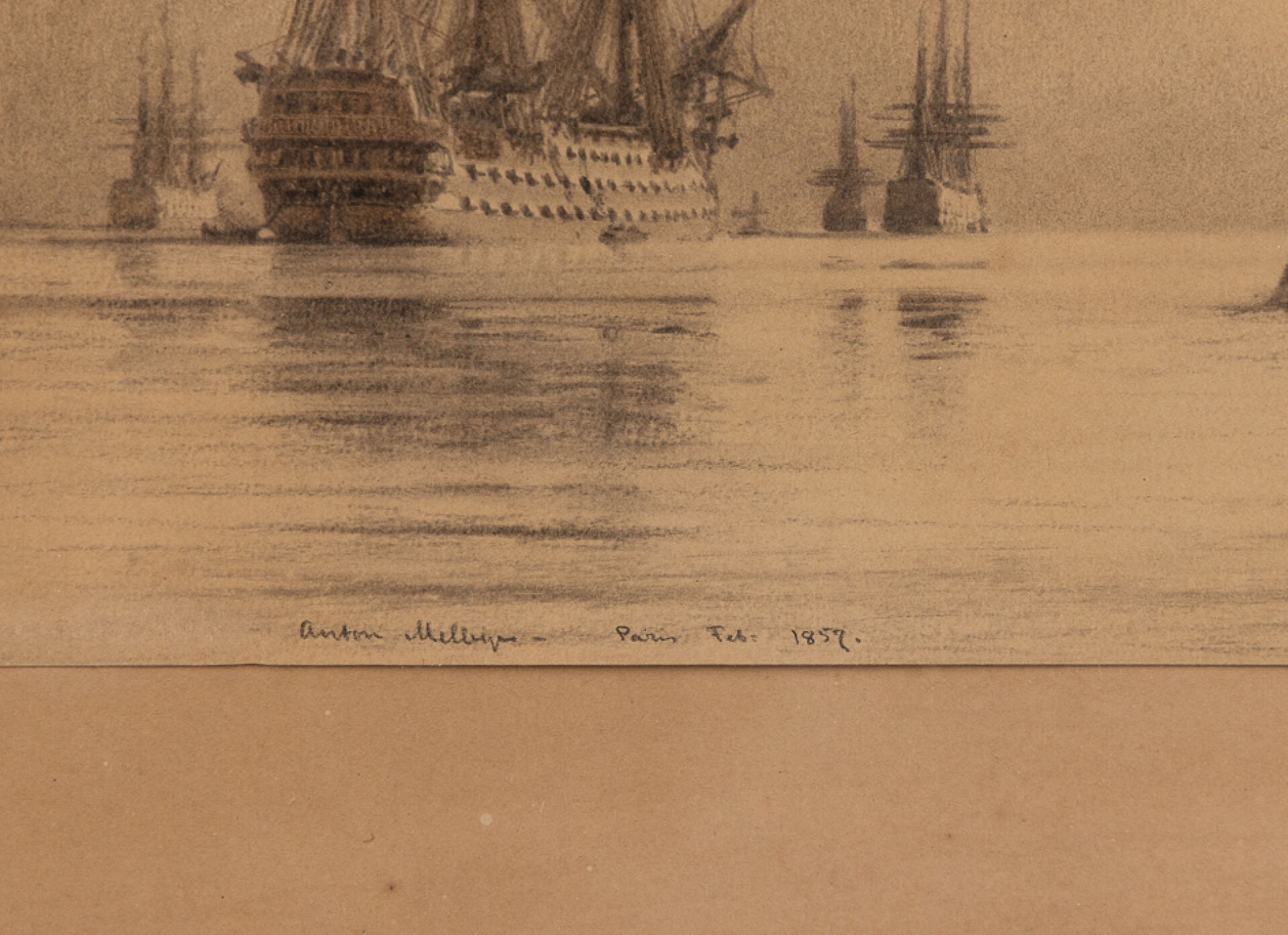 Anton MELBYE (1818-1875). Vaisseaux de ligne, une barque au premier plan. Dessin signé, situé à Paris et daté 1852 en bas à droite (insolations, déchirures). Haut. : 20 cm - Larg. : 28.5 cm Marin de formation, une vue déficiente l'oblige à quitter la Marine. En 1838 il entre à l'Acédémie Royale des Beaux Arts du Danemark, il se spécialise dans les Marines. Voyageur infatigable, à Paris il devient l'ami de Camille Corot et fréquente l'élite. Il formera Camille Pissarro qui se présentera comme son élève.