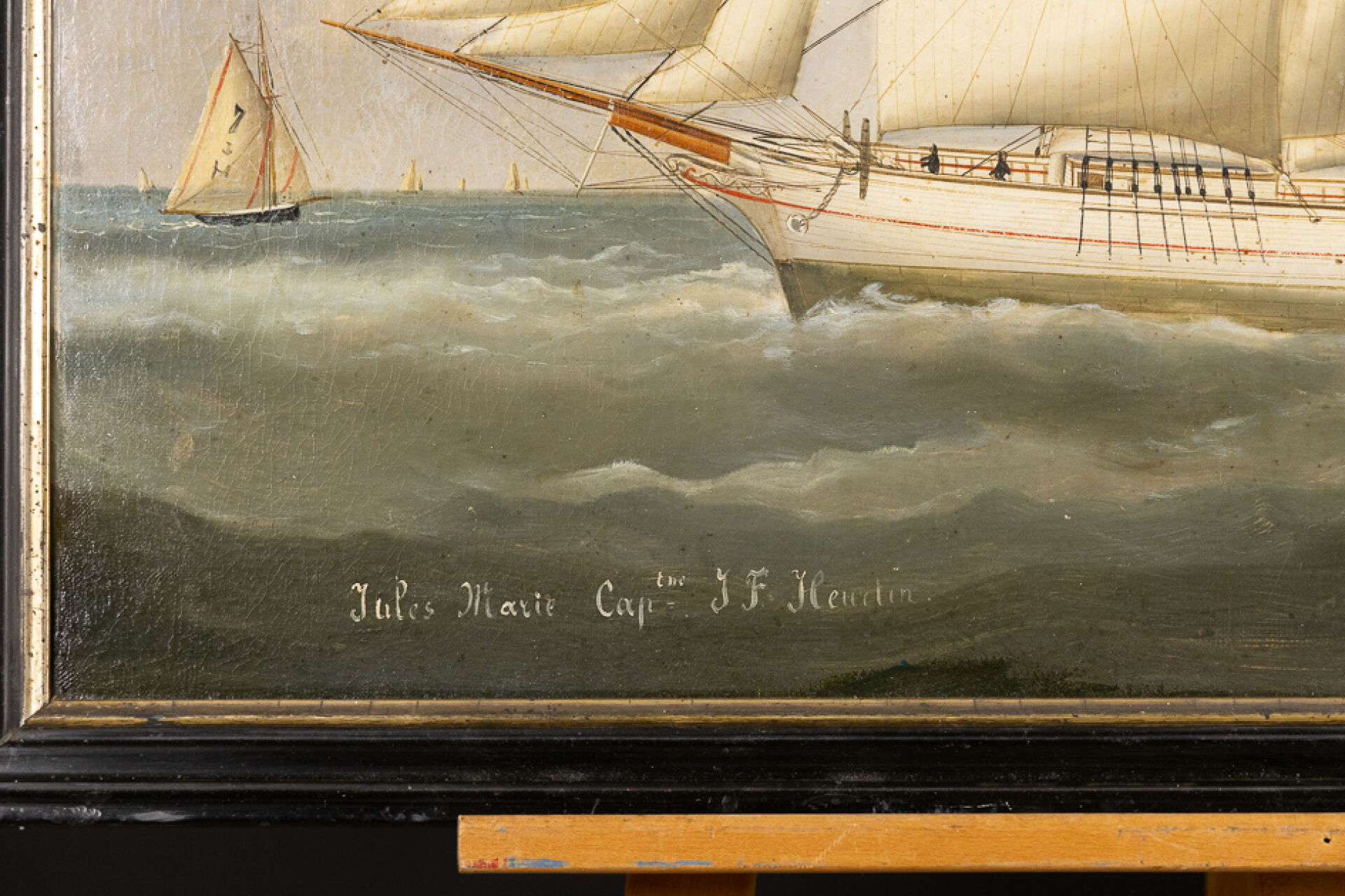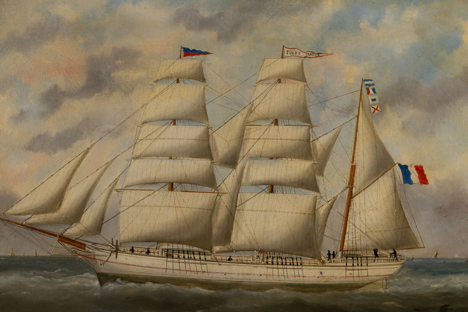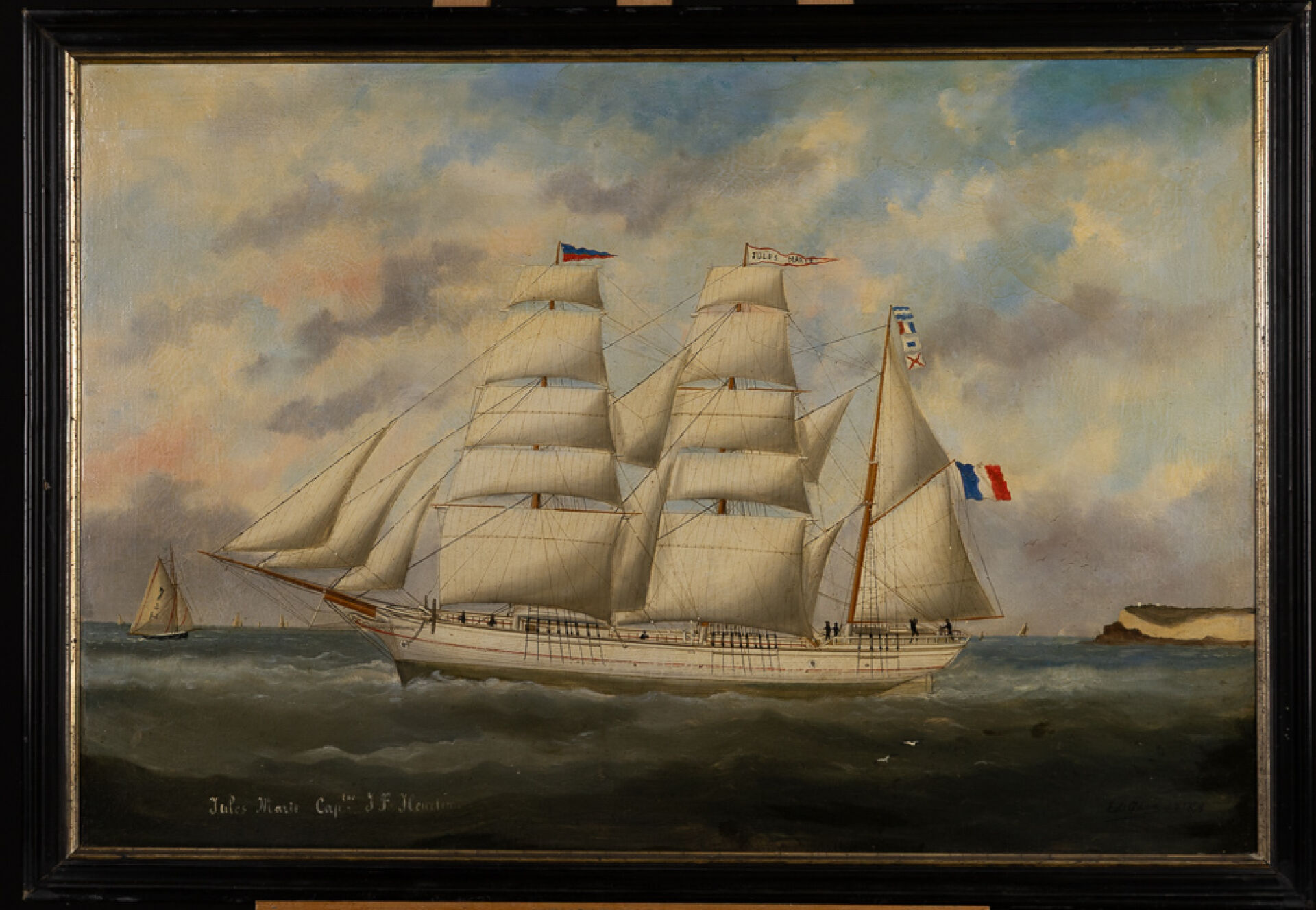 Édouard ADAM (1847-1929). Trois mâts barque Jules Marie Capitaine J.F.HEURTIN Huile sur toile, titrée en bas à gauche et signée en bas à droite et datée 1876. (rentoilage, craquelures et jaunissement). Haut. : 64,5 cm - Larg. : 92 cm On joint : Brevet de Capitaine au long cours au nom de M. Jean-Félix HEURTIN. Formé auprès de Durand-Brager à Paris, Edouard Adam s'installe au Havre vers 1873, alors en plein essor du commerce maritime, et devient rapidement le peintre attitré des grands armateurs comme la Compagnie Bordes. Portraitiste de bateaux au style rigoureux et fidèle, il est nommé en 1885 peintre officiel de la Marine.