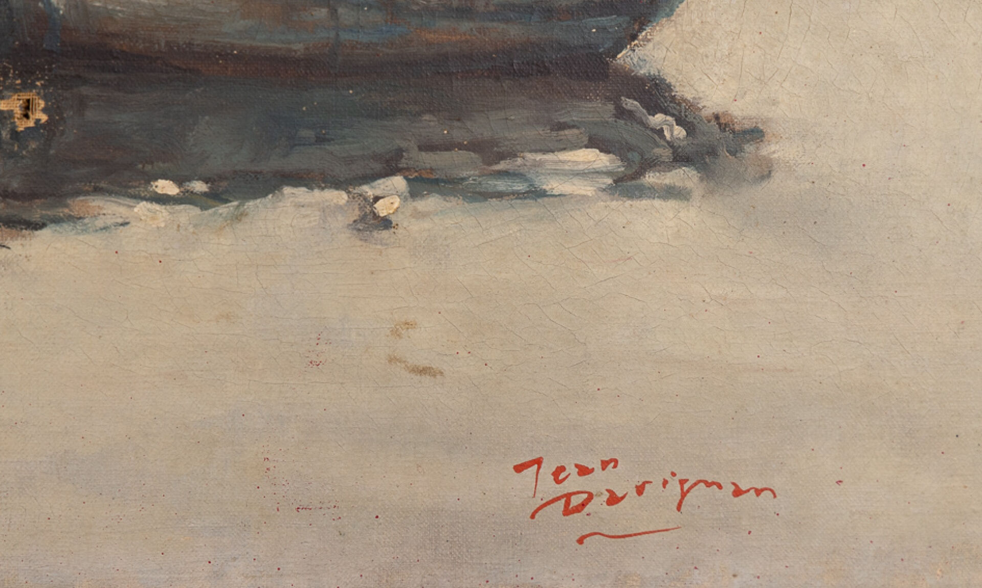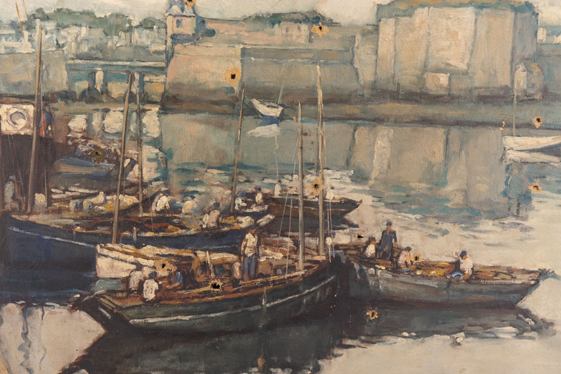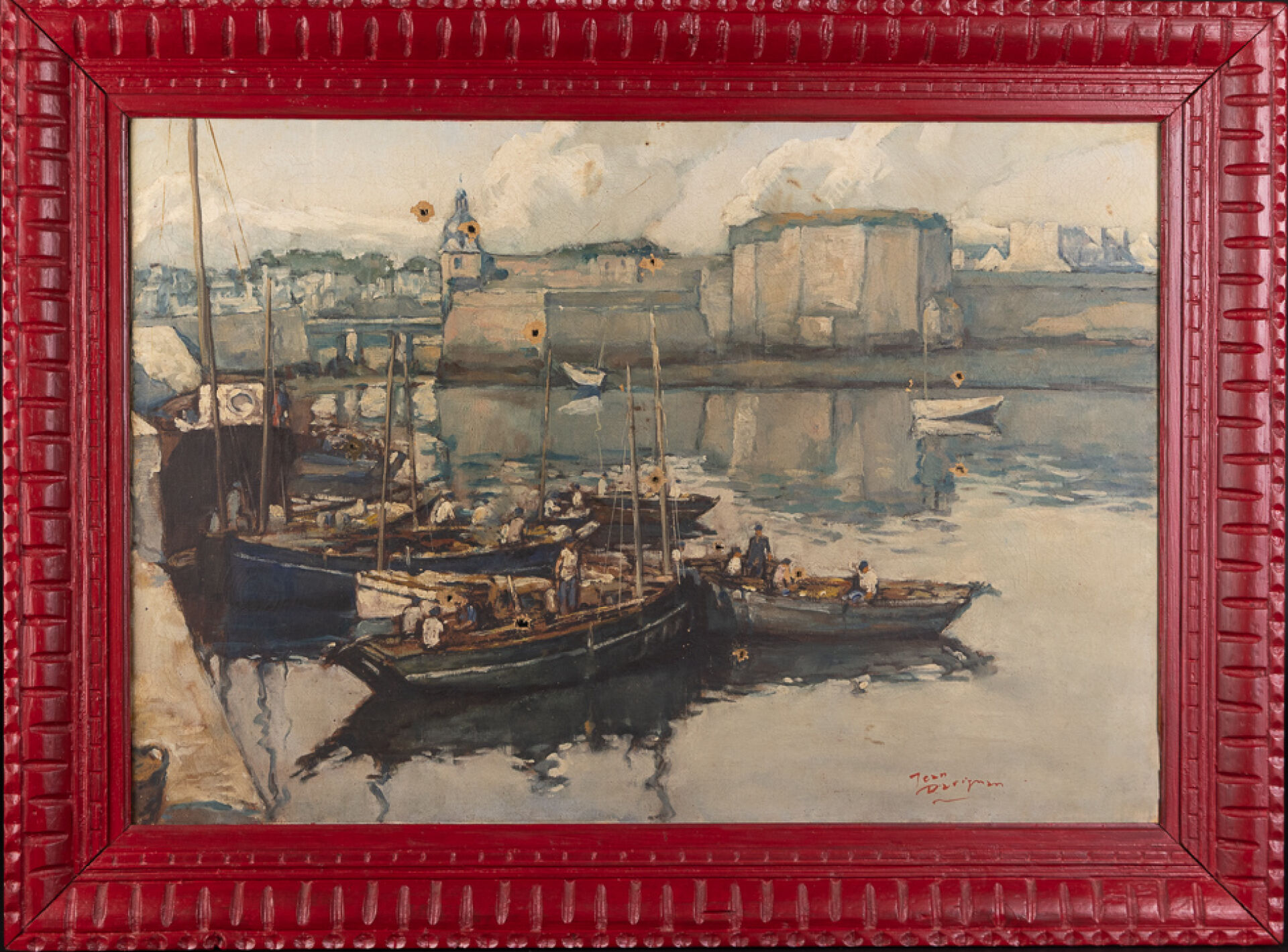 Jean DARIGNAN (1892-1982). Vue du port de Concarneau, la ville close en arrière plan. Huile sur toile, signée en bas à droite (perforations et manques). Haut. : 50.5 cm - Larg. : 73 cm