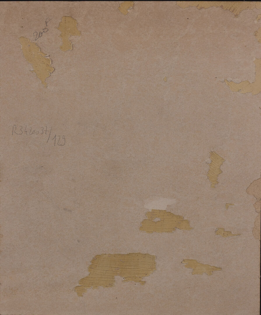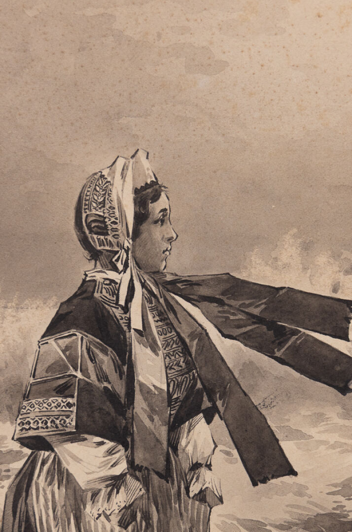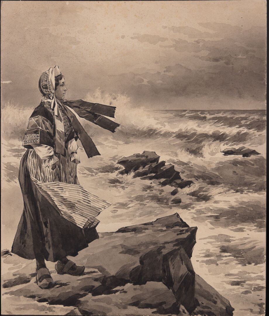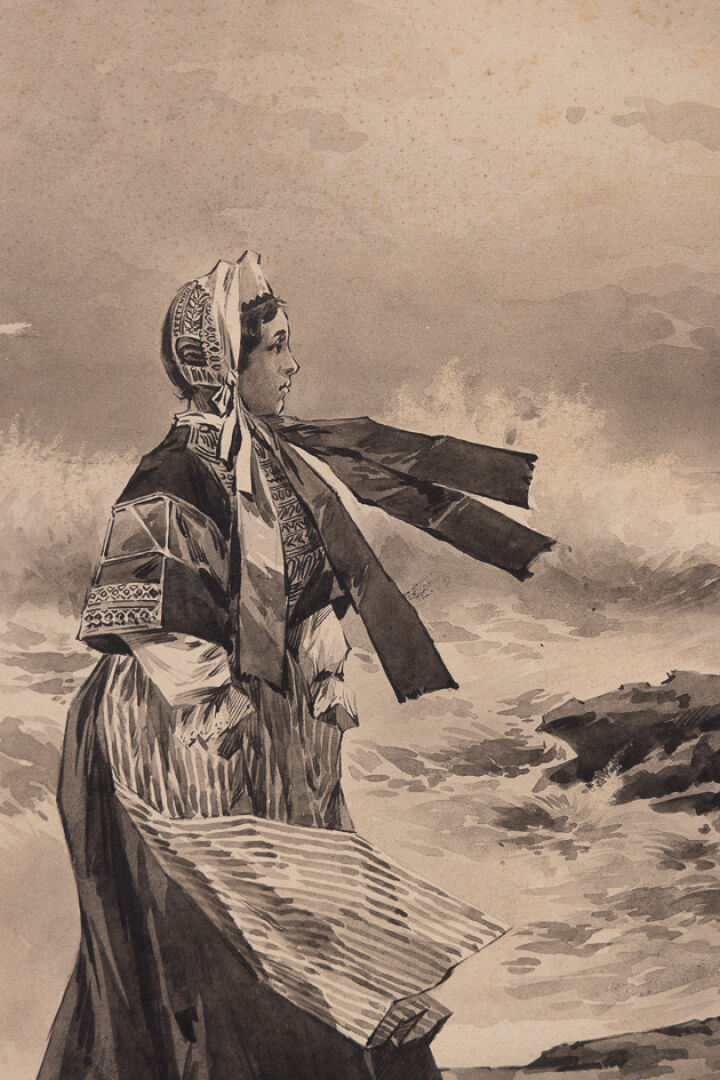 Maison OBERTHÜR à Rennes. Bretonne songeuse face à la mer déchaînée à Saint-Guénolé - Penmarc'h. Aquarelle en grisaille. Haut. : 36 cm - Larg. : 30 cm Notre aquarelle est à rapprocher d'une couverture d'almanach dont un exemplaire est conservé dans les collections du Musée de Bretagne de Rennes sous le numéro 984.0074.105.