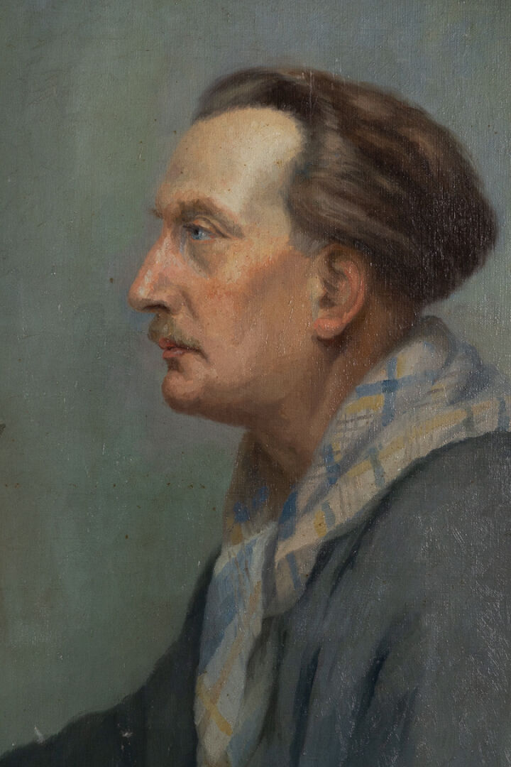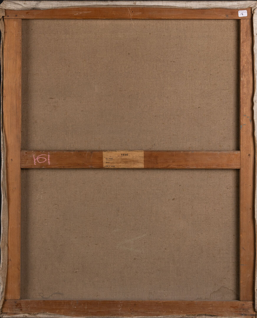 Hélène LE BRIQUIR (1894-1977). Portrait du sculpteur Louis-Henri Nicot. Huile sur toile, signée H. Le Briquir en bas à gauche, 1934. Au dos, étiquette d'exposition datée de 1936. Haut. : 81- Larg. : 65 cm Peintre originaire de Perros-Guirec, Hélène Le Briquir a suivi les cours particuliers dispensés par Etienne Bouillé (1858-1933). Elle expose dans plusieurs salons régionaux, dont ceux organisés par l'Union régionaliste Bretonne dans les années 1930 ou à l'occasion des expositions de l'Association artistique de Bretagne à Rennes. Ce portrait est celui du sculpteur rennais Louis-Henri Nicot (1878-1944), l'un des plus fameux sculpteurs de l'entre-deux-guerres. Il réalise plusieurs monuments aux morts et participe aux expositions de 1925 et 1937. On reconnaît sur ce tableau la sculpture de son « Lévrier assis », réalisée en 1934 et qui sera éditée en céramique par André Fau. Il est donc vraisemblable que ce tableau ait été réalisé cette année.