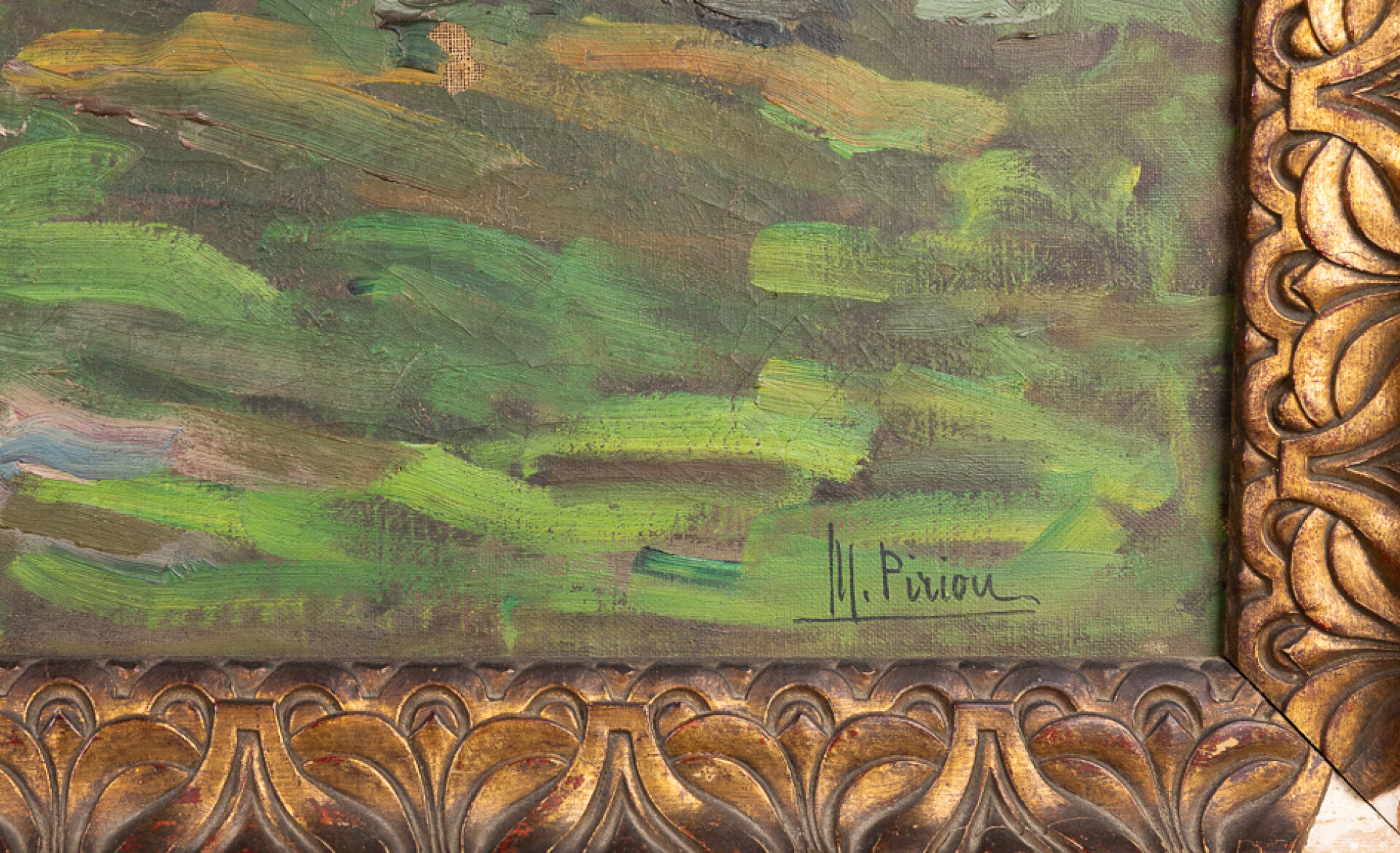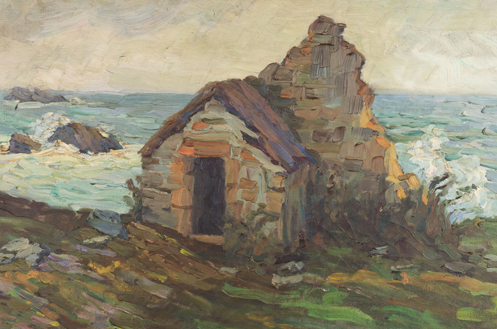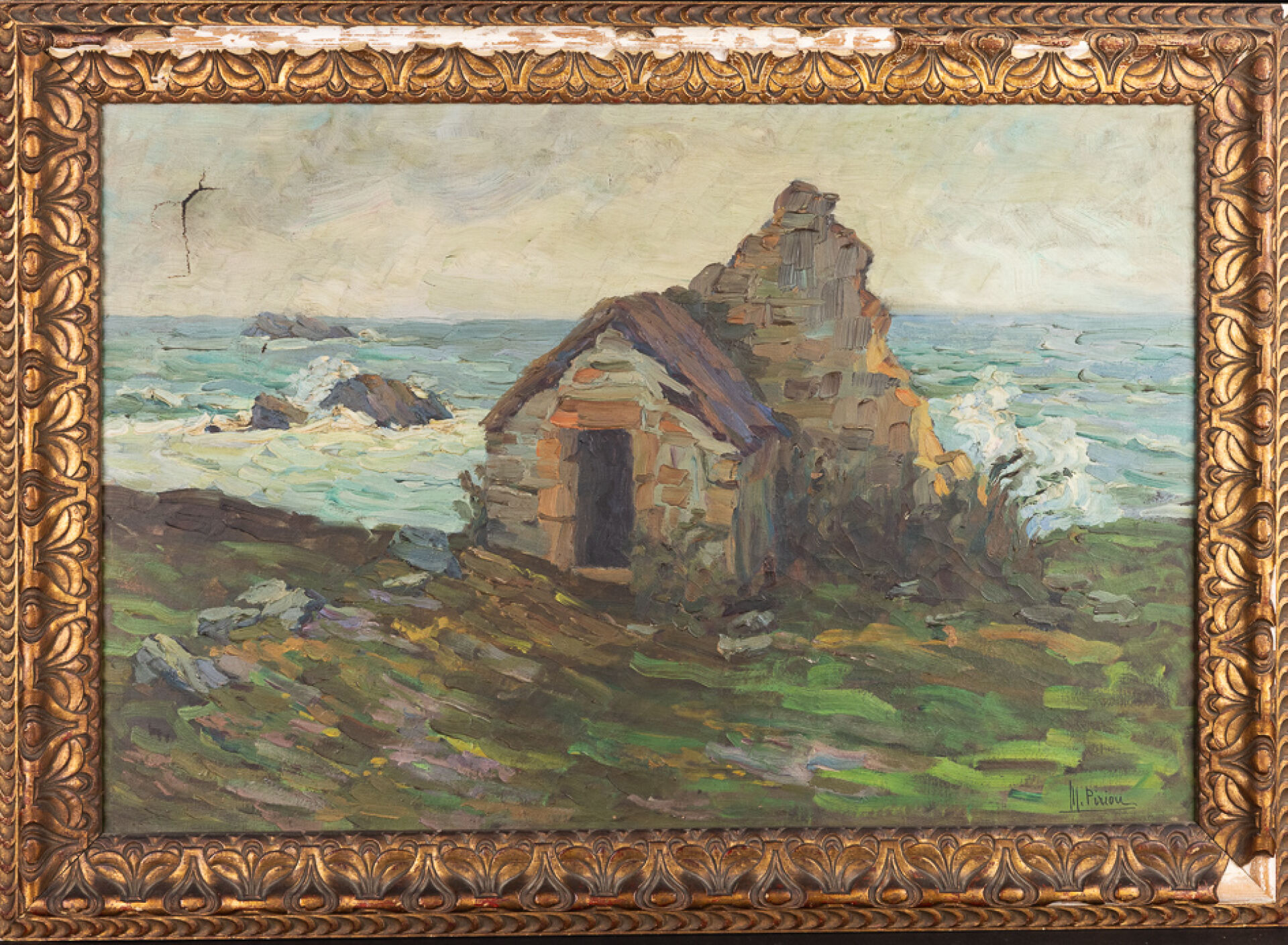 Marie PIRIOU-BAZIN (1891-1956). Paysage à la chapelle en ruine au bord de mer agitée. Huile sur toile, signée en bas à droite (perforation, déchirures). Haut. : 54.5 cm - Larg : 81.5 cm