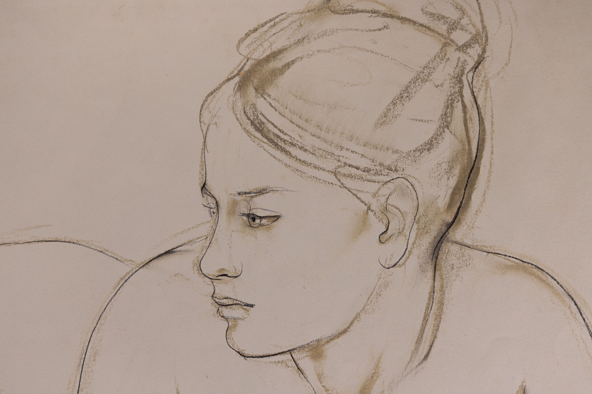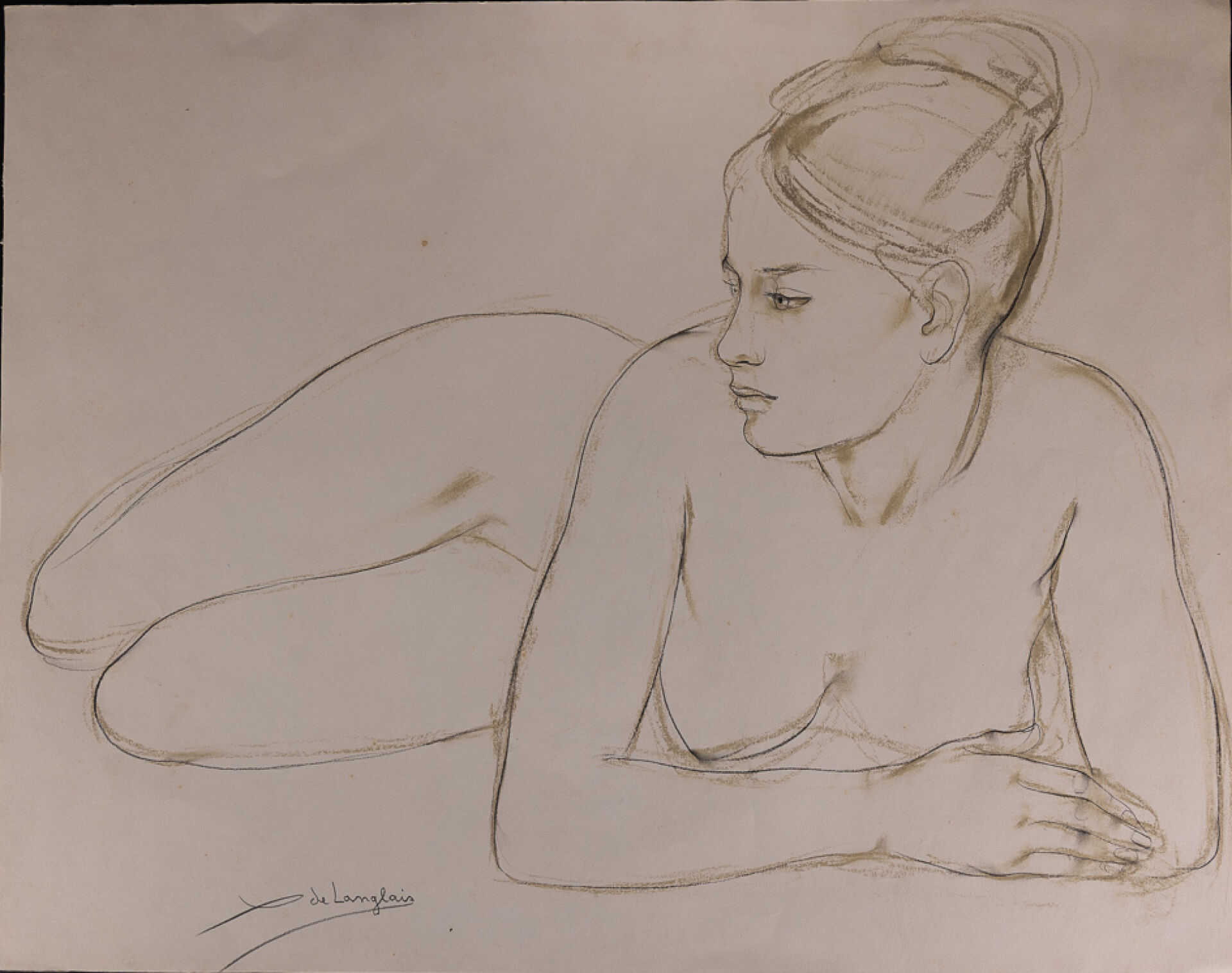 Xavier de LANGLAIS (1906-1975). Nu féminin allongé. Crayon et fusain sur papier, années 1960, signé en bas à gauche. Haut. : 48 cm - Larg. : 63 cm Expertise réalisée par Monsieur Olivier LEVASSEUR