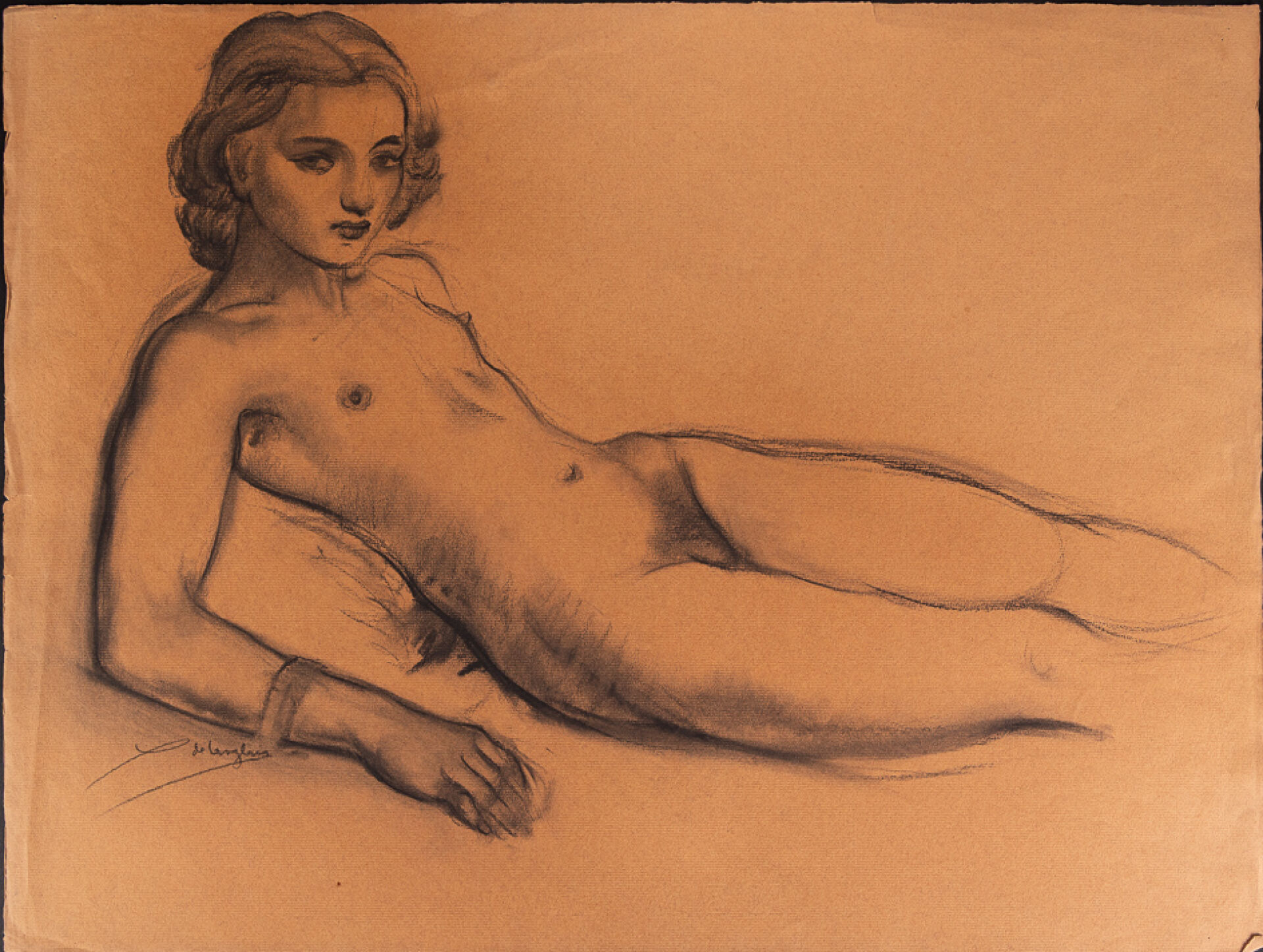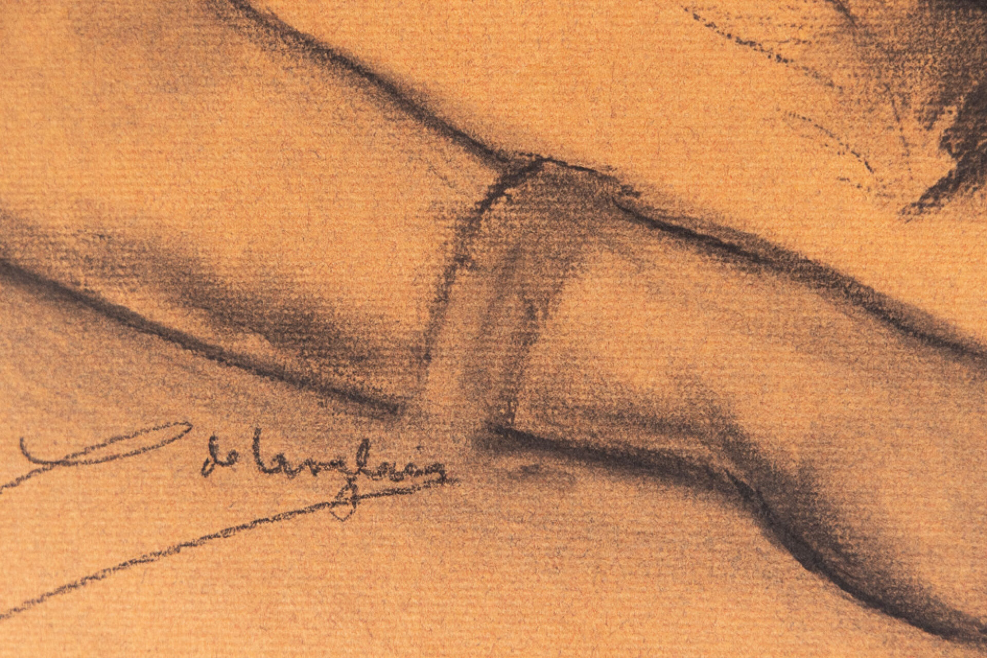 Xavier de LANGLAIS (1906-1975). Nu féminin allongé. Crayon et pastel sur papier orange, années 1940, signé en bas à gauche. Les œuvres de cette période ne sont pas courantes. Haut. : 51 cm - Larg. : 65 cm Expertise réalisée par Monsieur Olivier LEVASSEUR