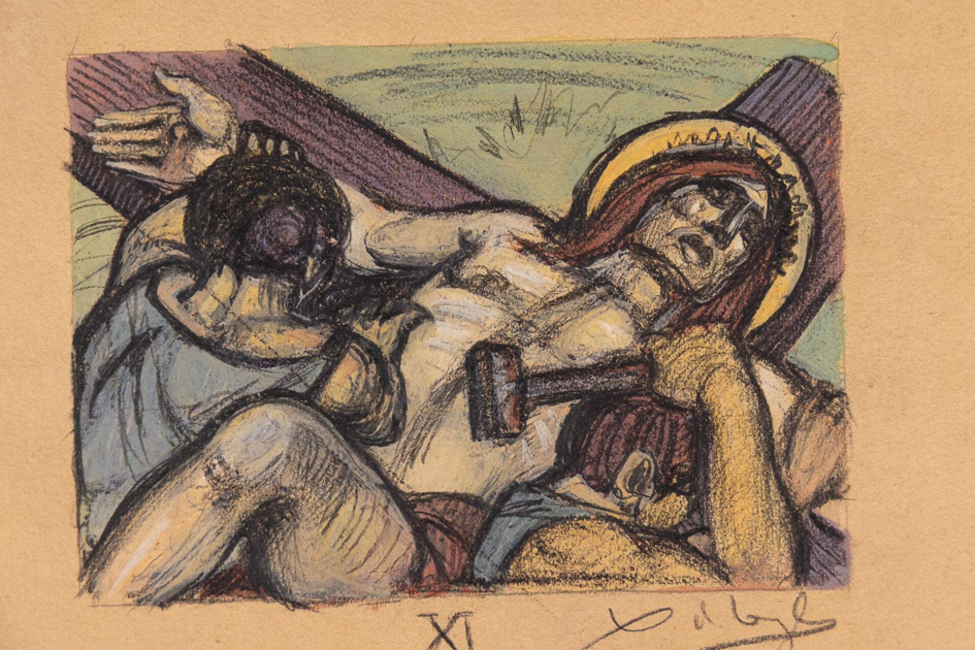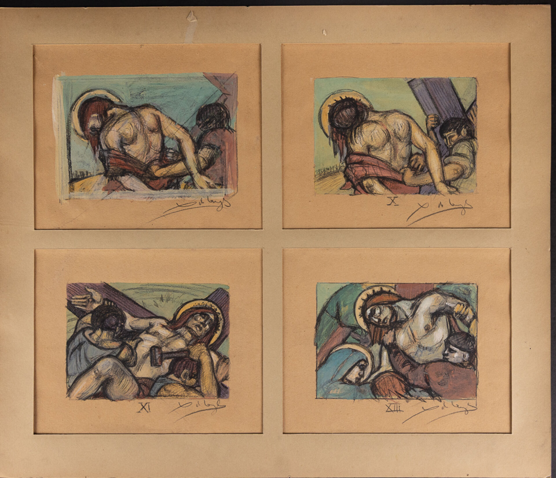 Xavier de LANGLAIS (1906-1975). Ensemble de quatre esquisses préparatoires pour le Chemin de Croix de l'église paroissiale Notre-Dame de La Baule pour les stations suivantes : Station X : Jésus est dépouillé de ses vêtements (deux projets, dont l'un signé en bas à droite), Station XI : Jésus est mis en croix, signé en bas à droite, Station XIII : Jésus est descendu de la Croix, signé en bas à droite. Gouache et crayon gras, 1936. Dim. de chaque sujet : Haut. : 12 cm - Larg. : 17 cm Ce chemin de croix fut commandé à l'artiste par l'abbé Chochon, suite à l'exposition de l'artiste à la galerie nantaise Mignon-Massart. Xavier de Langlais achève ce chemin de croix en quelques semaines entre décembre 1935 et mars 1936, secondé par son ami Xavier Haas (1907-1950) qui réalise des panneaux intermédiaires. Il est béni au début du mois de mars 1936 et se trouve toujours en place. Référence bibliographique : Gaëtan de Langlais, « La Baule, visite de l'église Notre-Dame et commentaires sur son chemin de croix réalisé par Xavier de Langlais », Bulletin de l'Association bretonne, tome CXIII, 2004, p. 257-272. Expertise réalisée par Monsieur Olivier LEVASSEUR
