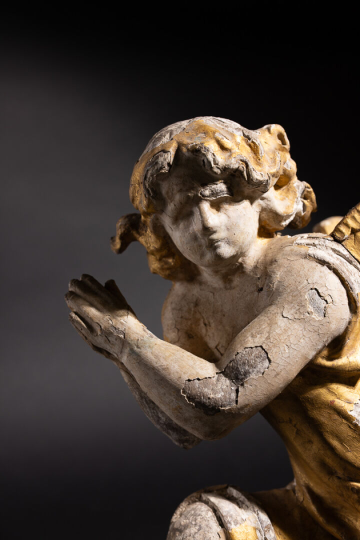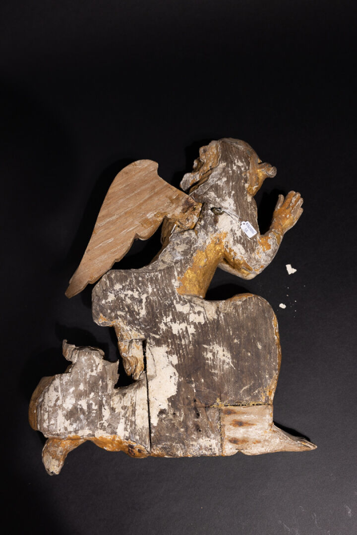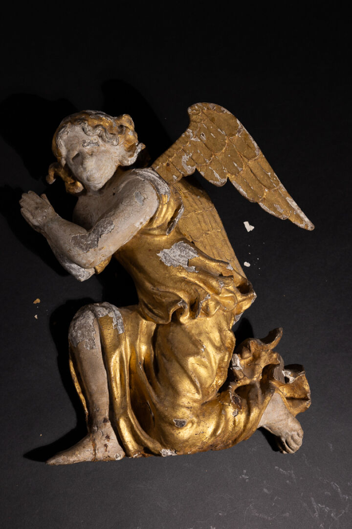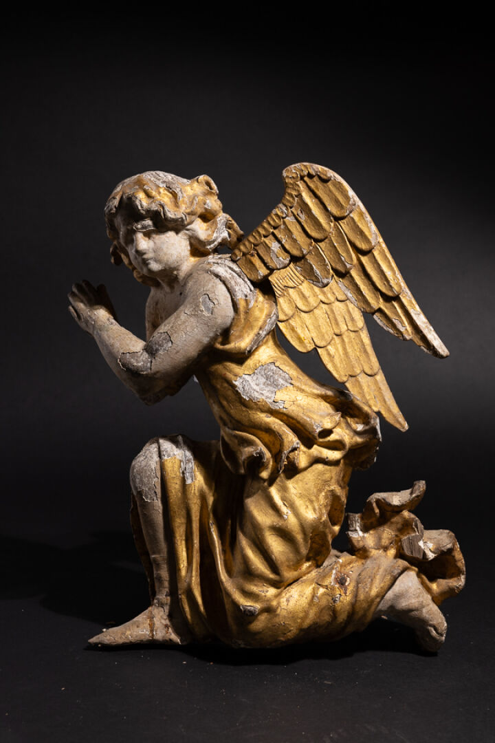 Ange adorateur agenouillé en résineux sculpté, polychromé et doré, élément de retable (accidents, manques et restaurations). Italie, fin du XVIIe siècle. Haut.: 46 cm - Larg. : 36 cm Expertise réalisée par Benoit BERTRAND.